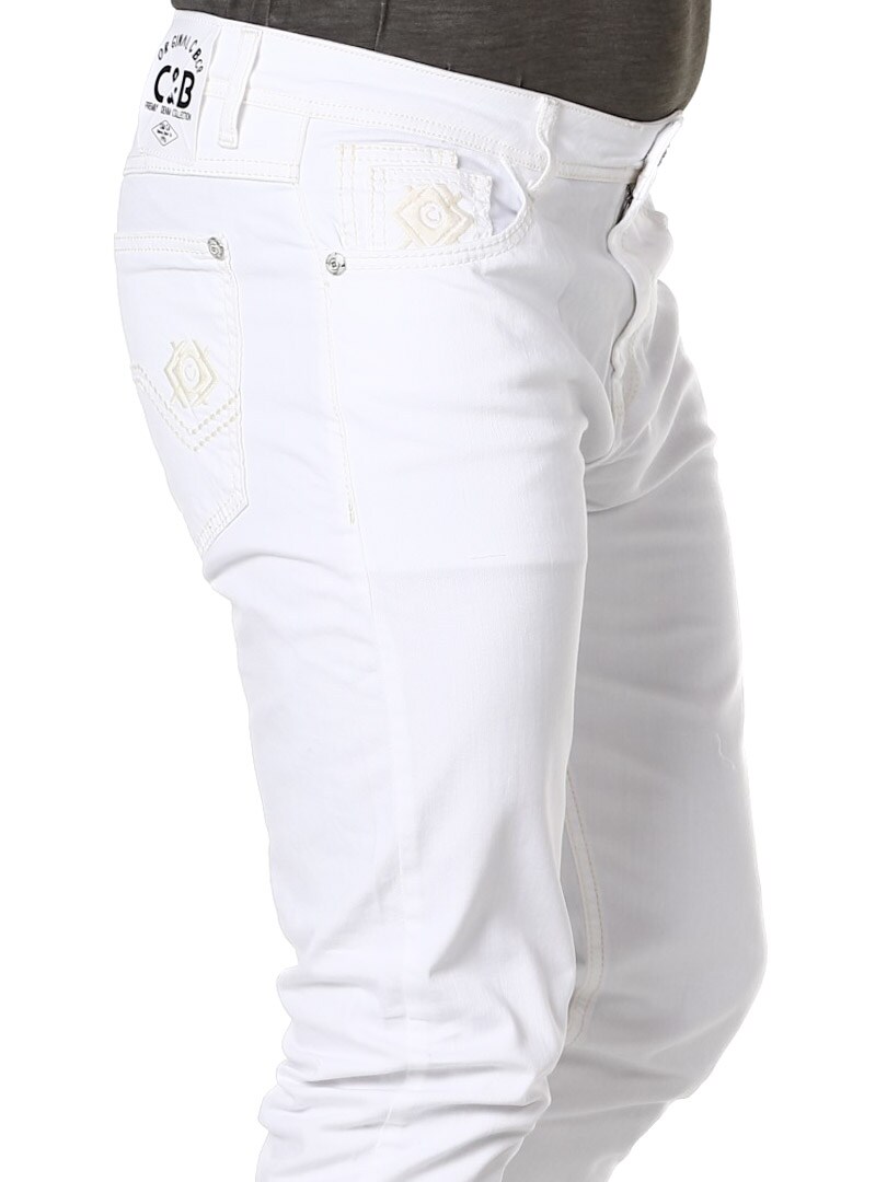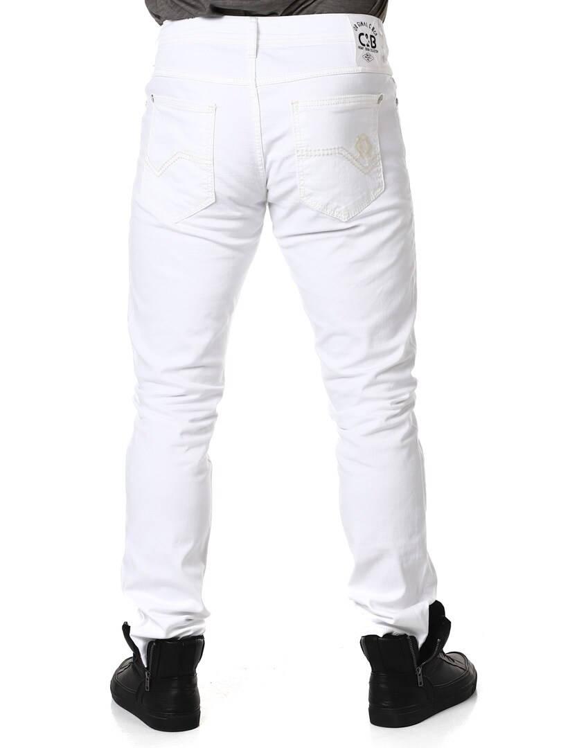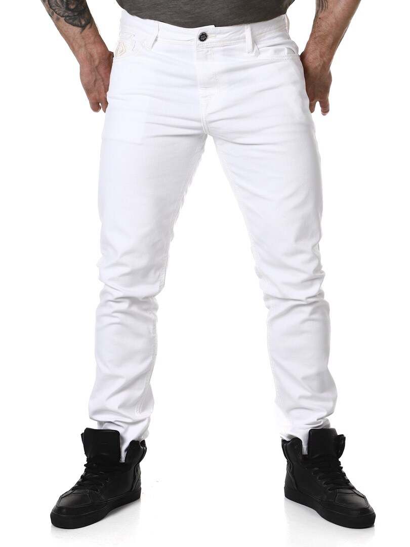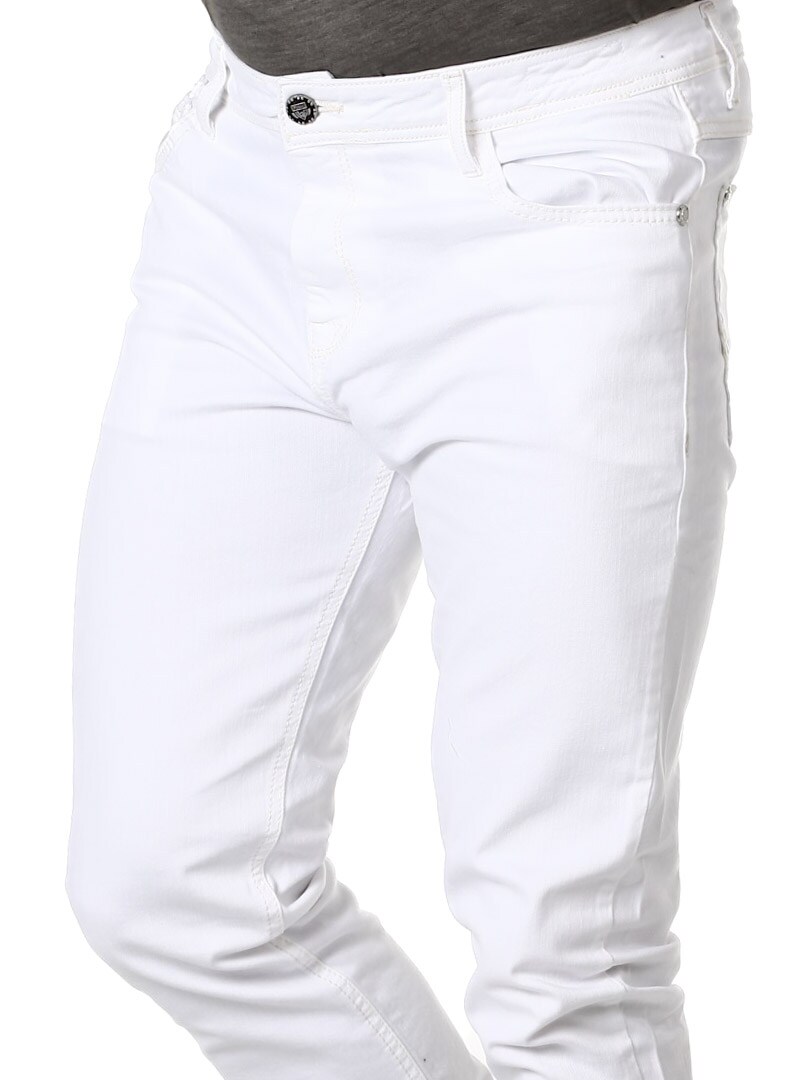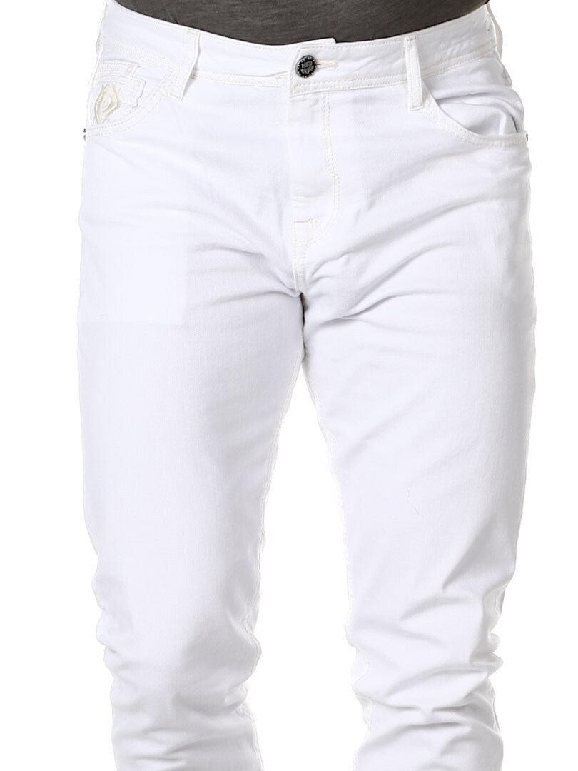 White jeans with darker seams and tailored print on both the front and back. There are six pockets, belt loops at the waist, and a logo patch at the back.