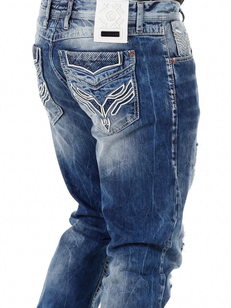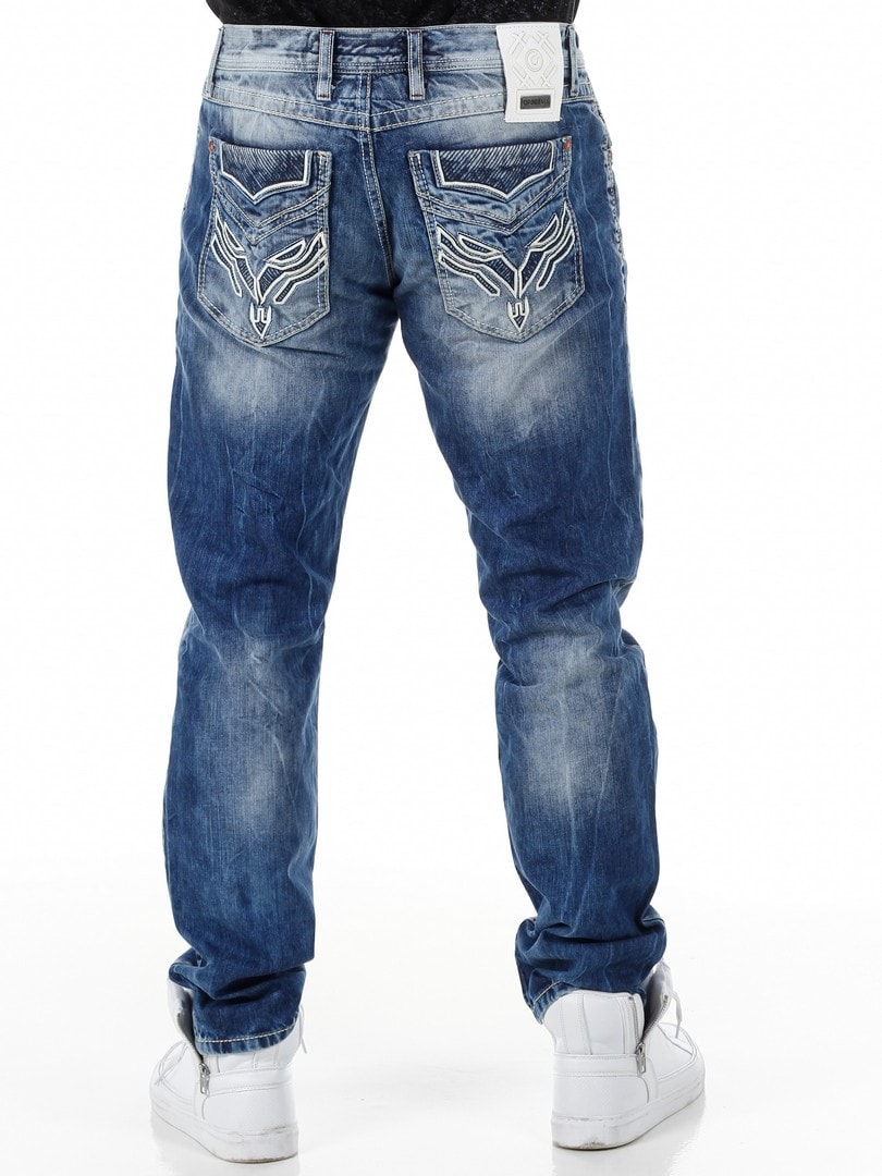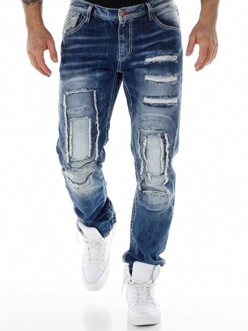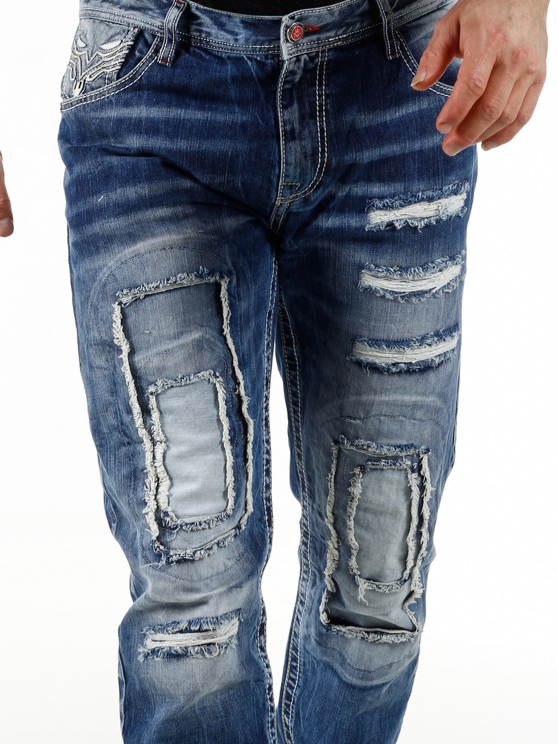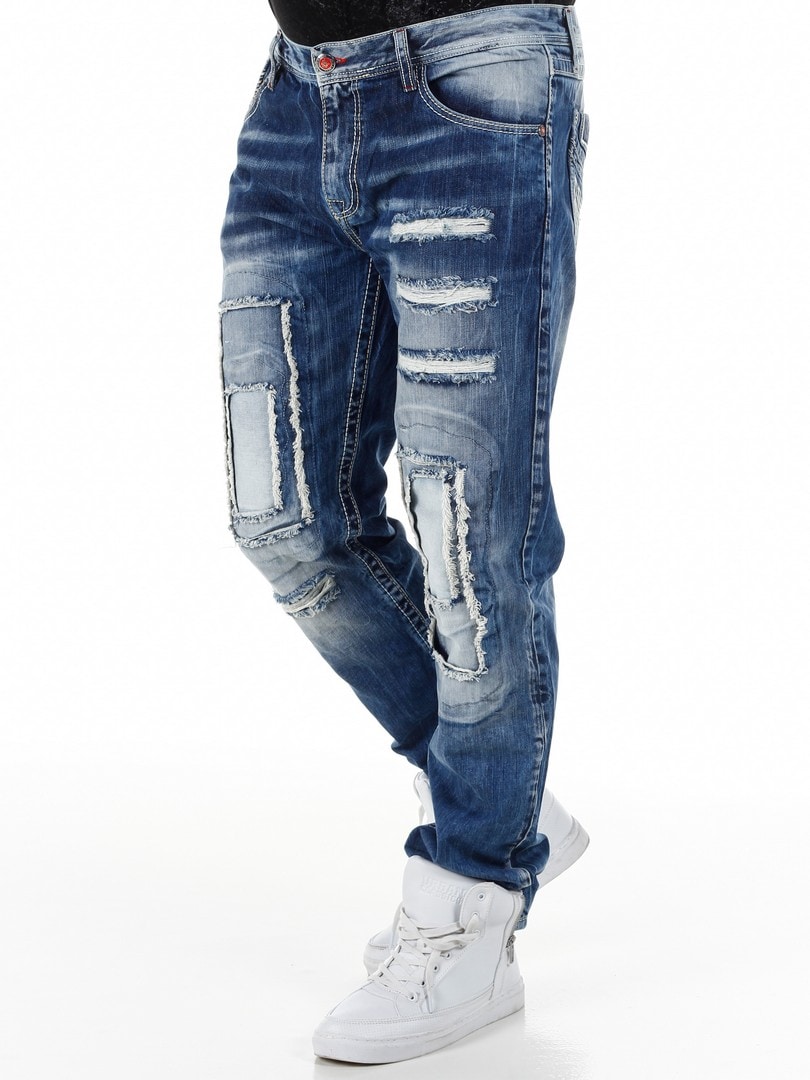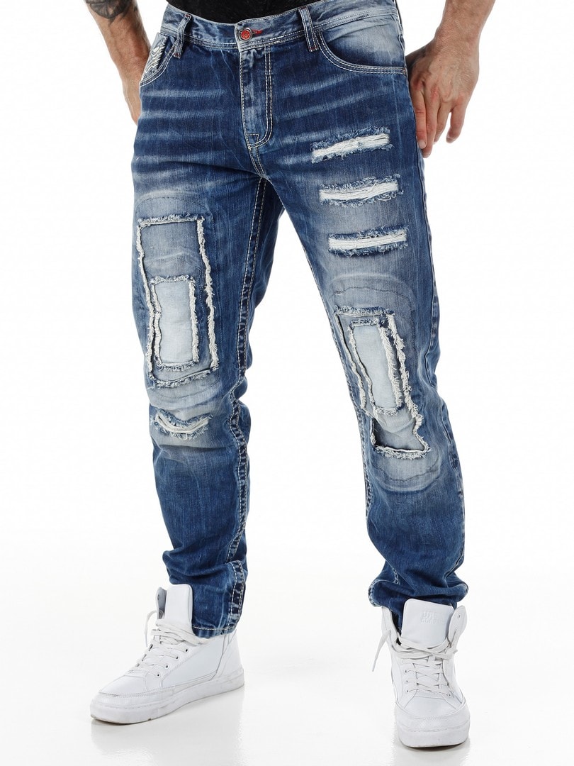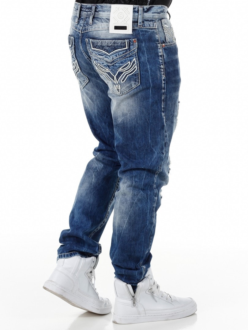 Trousers in heavy denim with abrasions and white details. A white patch with the logo is clearly visible on the back waistband, and the jeans have large pockets with a white imitation leather pattern.