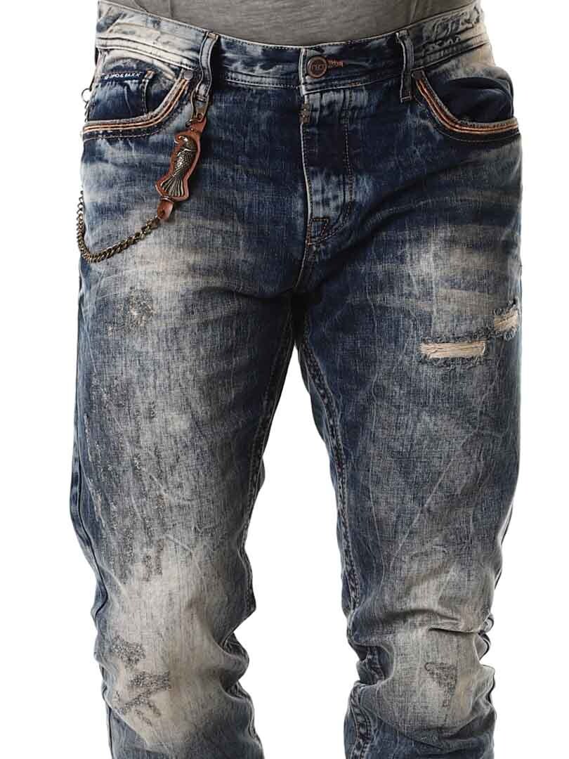 Classic model jeans with five pockets and belt loops at the waist. Tough design with distressed details, a removable chain, and tailored print.