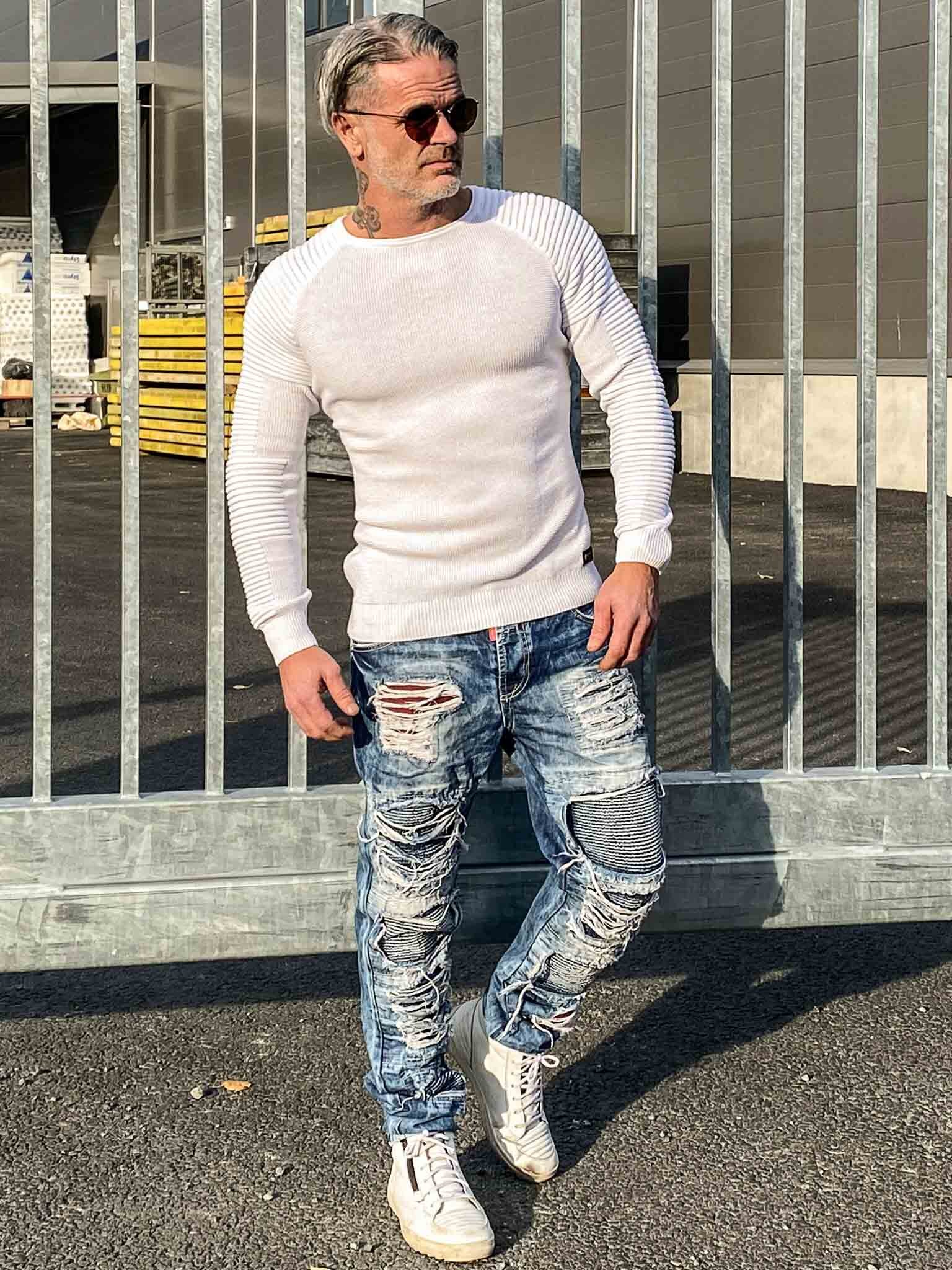 Tough jeans in stone-washed denim with heavy distressing and red details. They feature ribbed fabric at the distressing for a unique effect. Classic fit with three front pockets and two back pockets.
