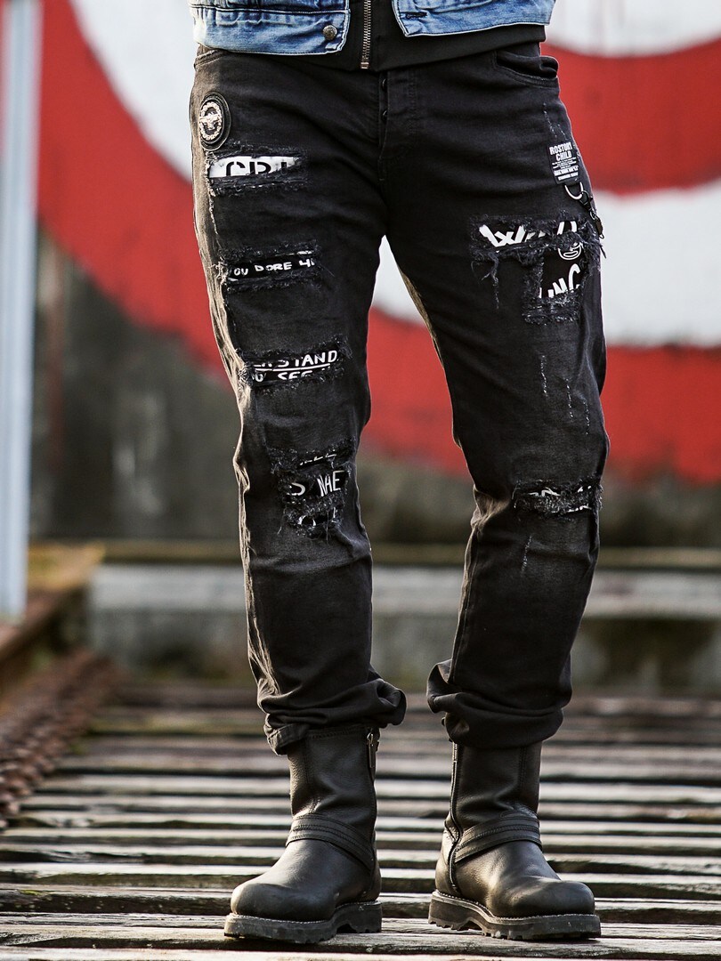 Pants in soft denim with a detachable chain and spacious pockets. Tough design with distressing, tears, contrast fabric, and fabric patches.