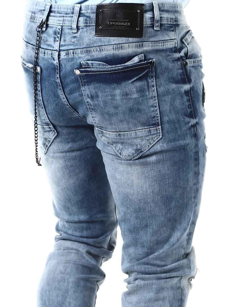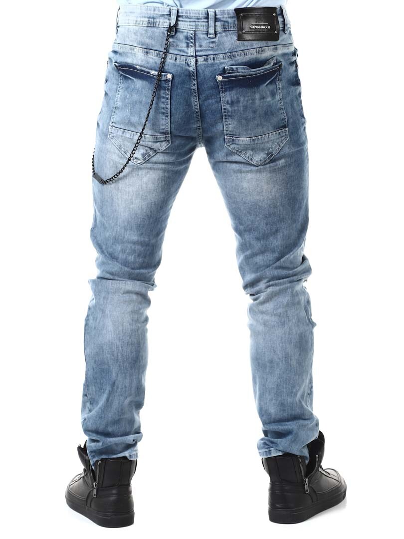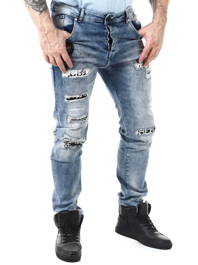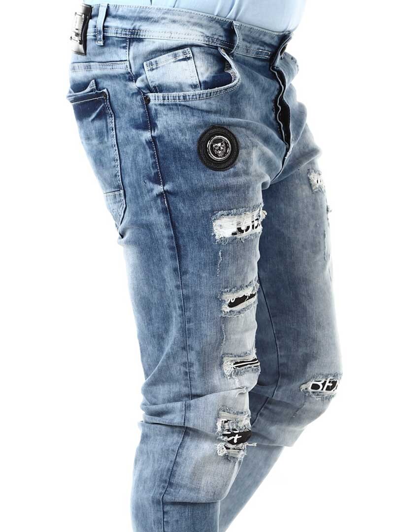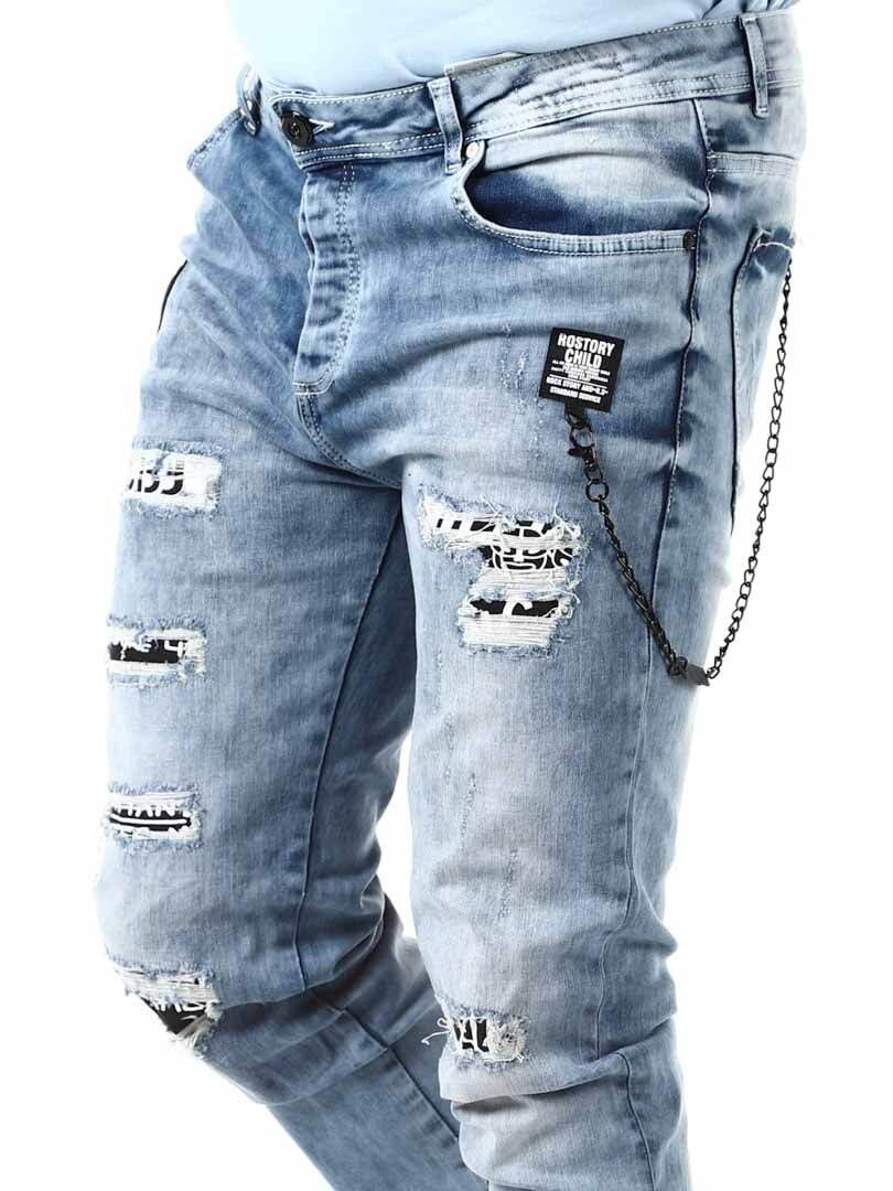 Pants in soft denim with a detachable chain and spacious pockets. Tough design with distressing, tears, contrast fabric, and fabric patches.
