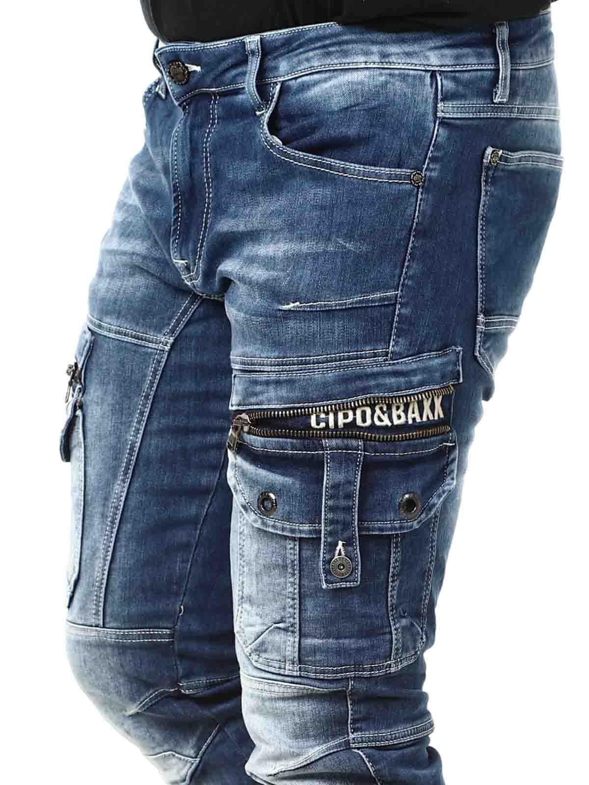 Stone-washed denim trousers designed for comfort like jogging pants, yet retaining the rugged appearance of jeans. They feature multiple pockets and elastic cuffs at the ankles.
