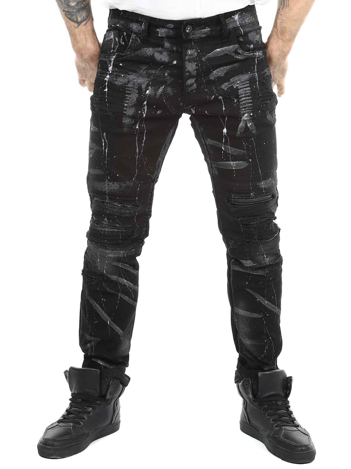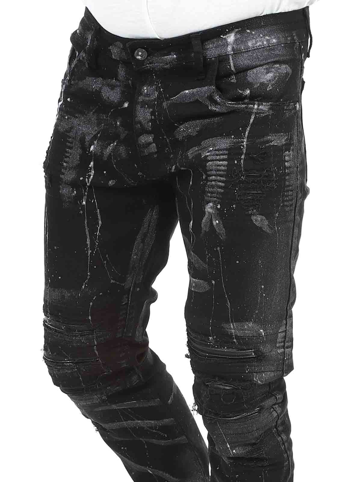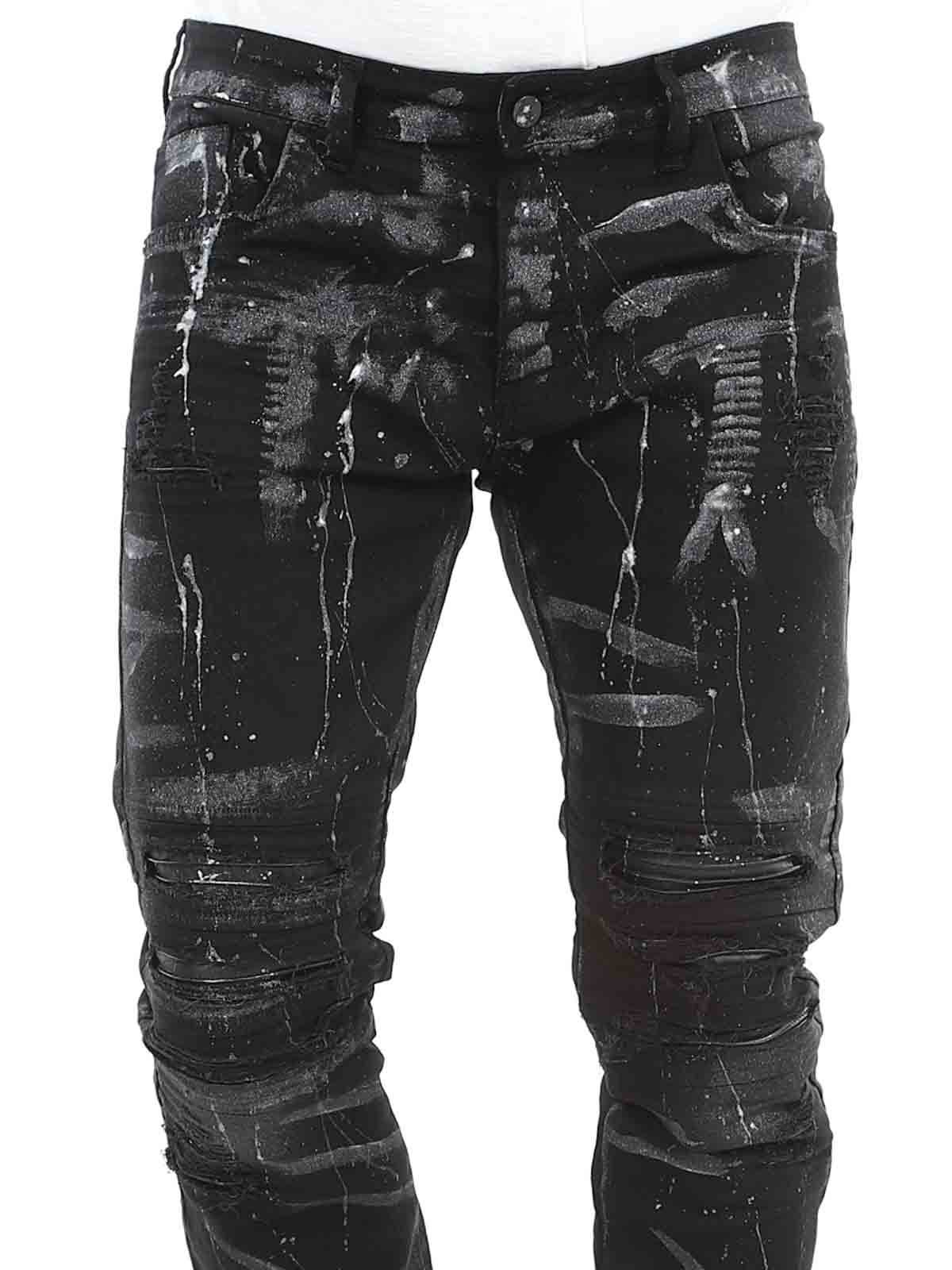 Jeans in comfortable and stretchy denim. Cool design with faux leather rips and painted effects. Five-pocket model with belt loops and a patch in the waistband at the back. Jeans created to give your outfit a bold and unique edge!