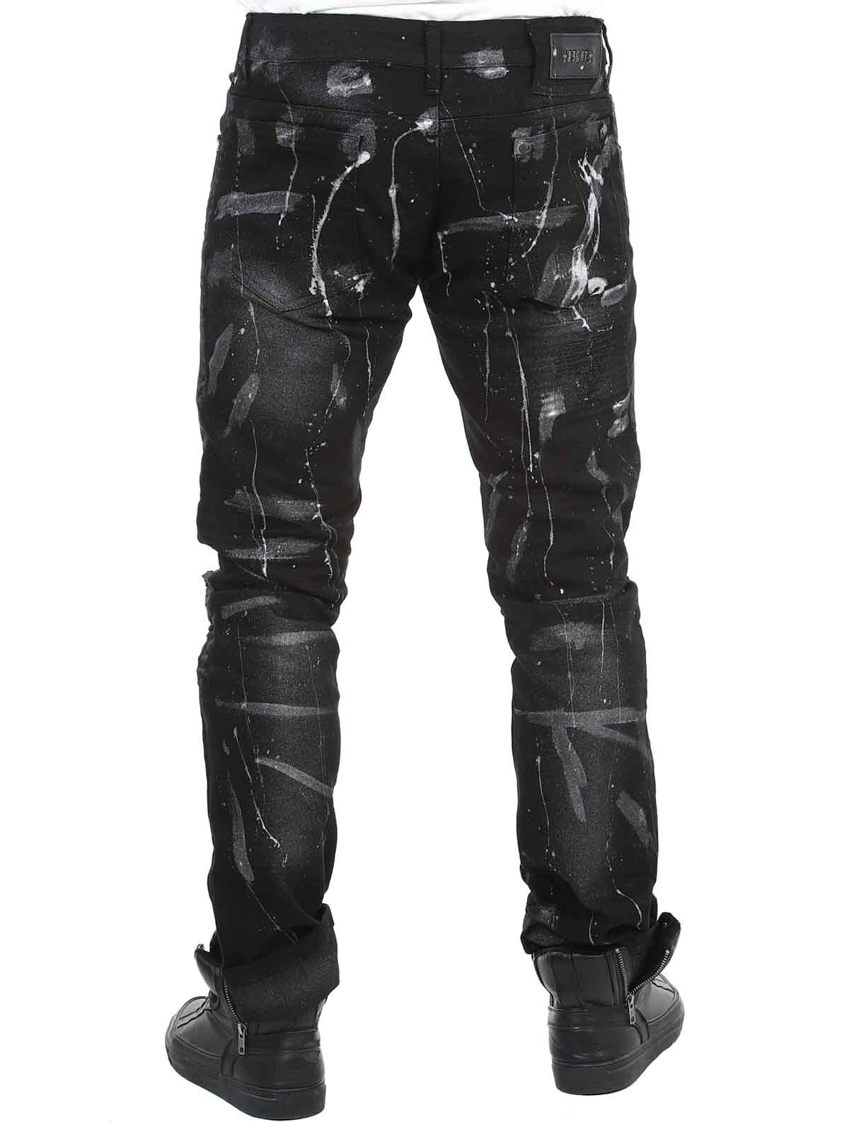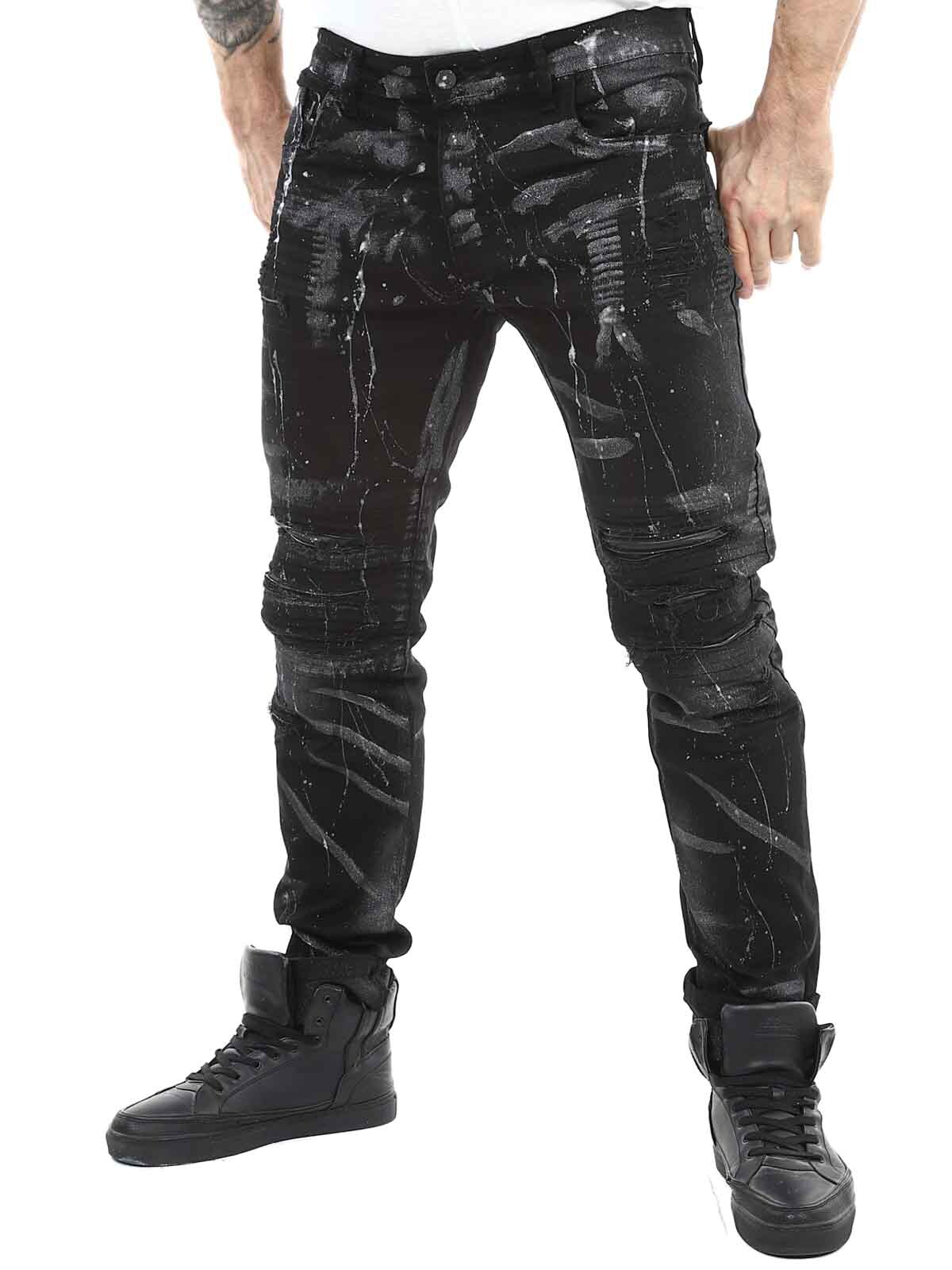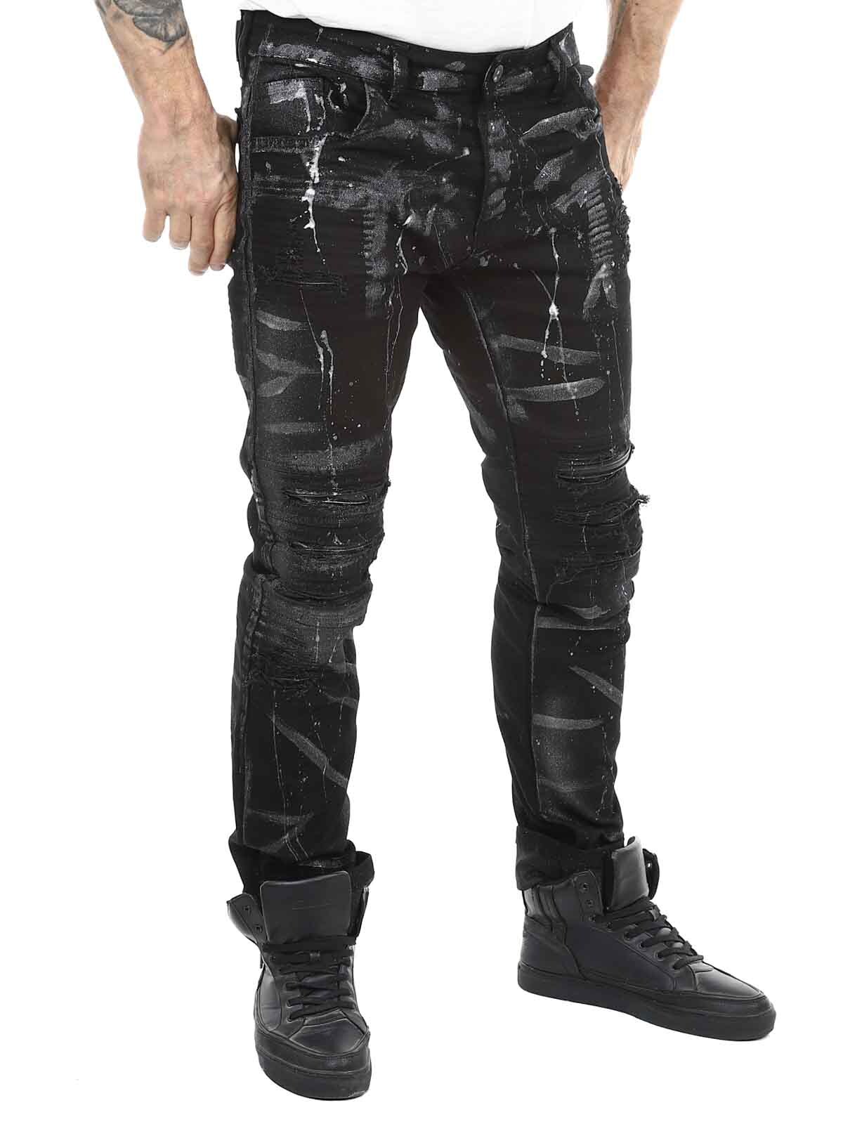 Jeans in comfortable and stretchy denim. Cool design with faux leather rips and painted effects. Five-pocket model with belt loops and a patch in the waistband at the back. Jeans created to give your outfit a bold and unique edge!