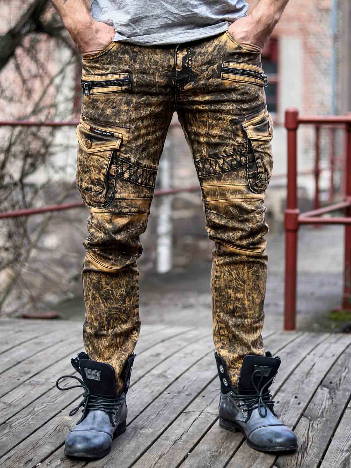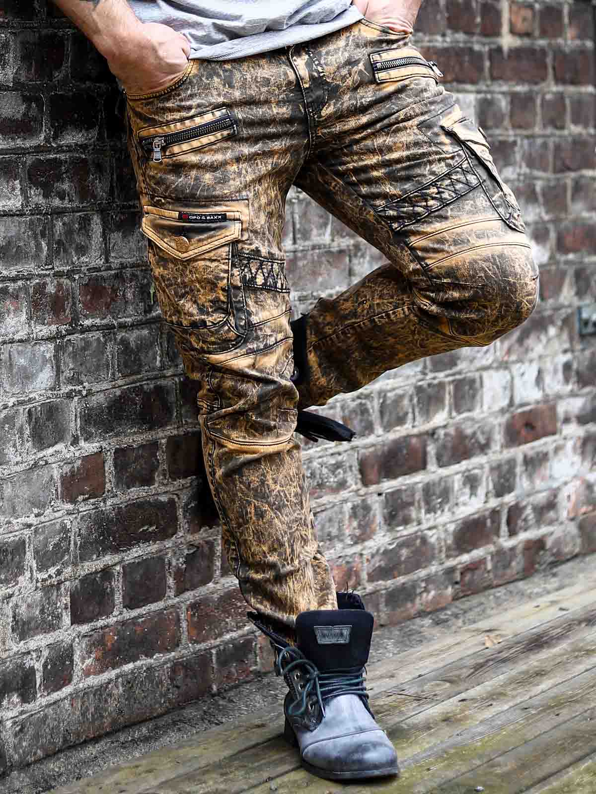 Stylish jeans in a classic model with cargo pockets. Detailed with zippers, logo, and seams. They have belt loops at the waist and a zip fly.