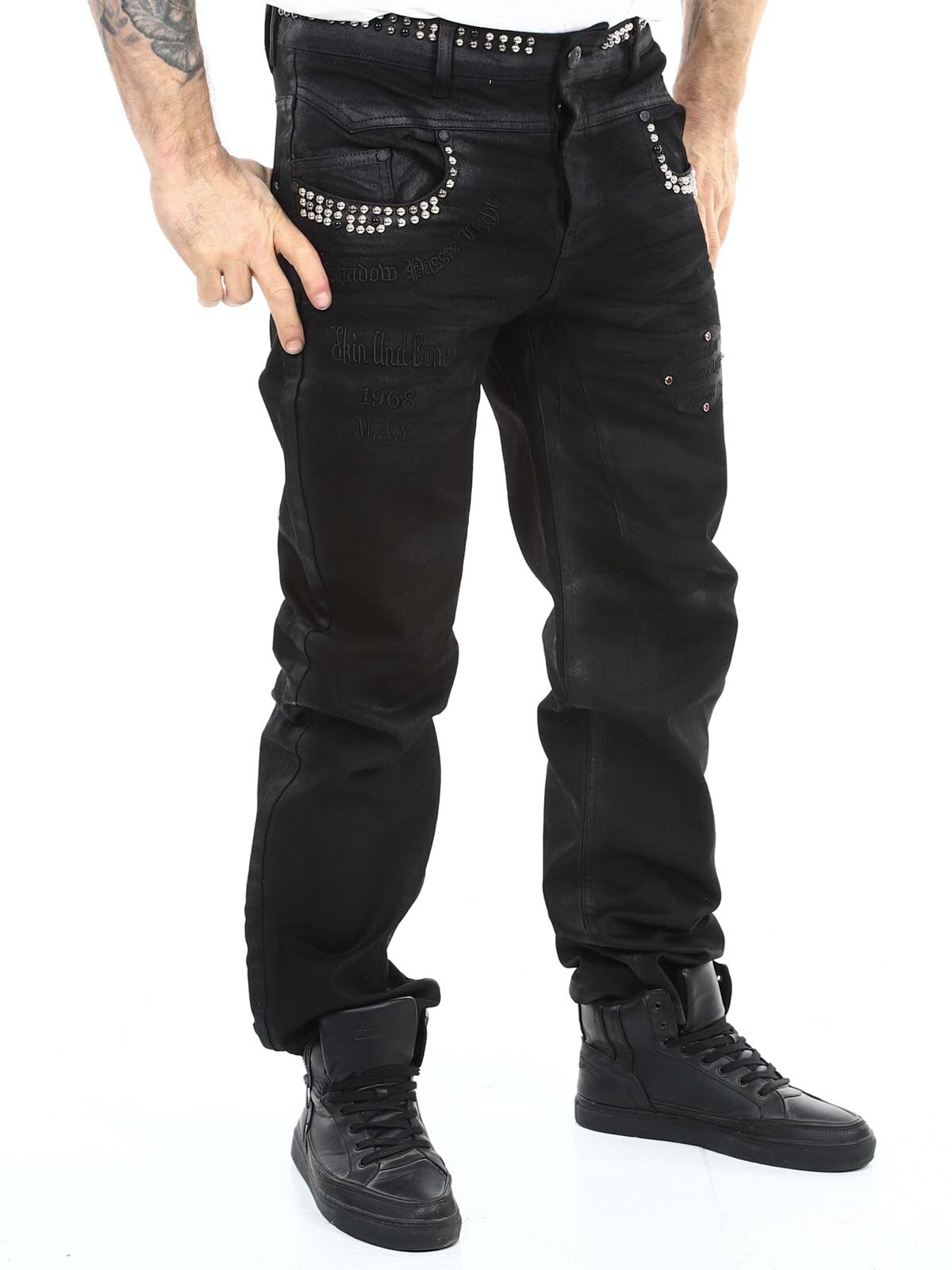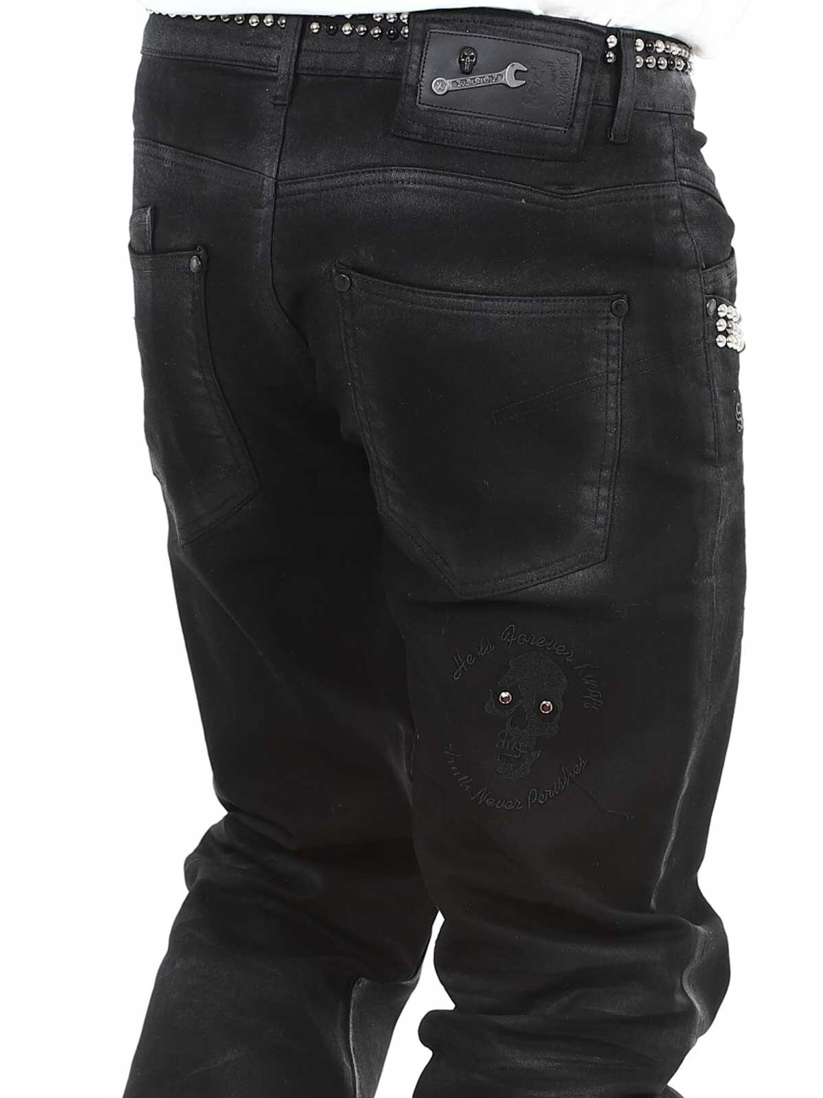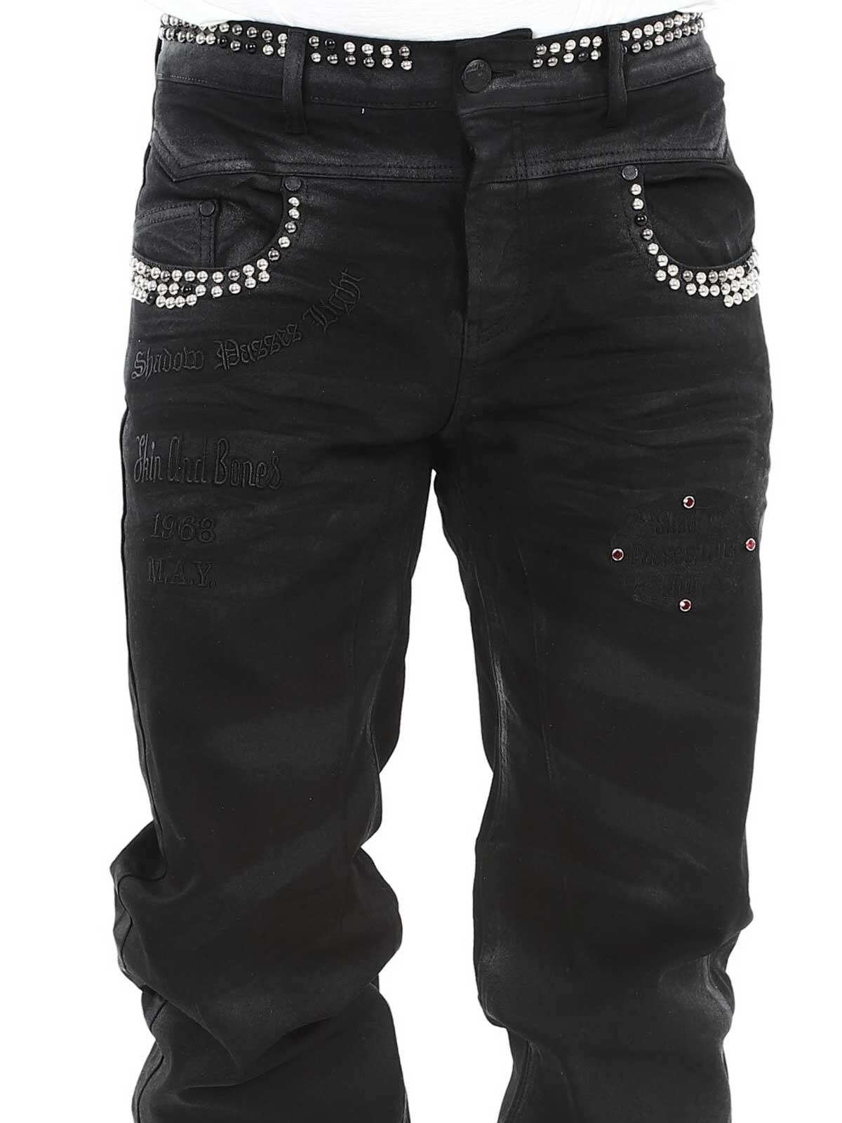 Jeans in stretchy material with an eye-catching design. They have belt loops, three front pockets and three back pockets. Detailed with rivets and tailored prints. If you want to be unique and stand out, these jeans are just right for you!
