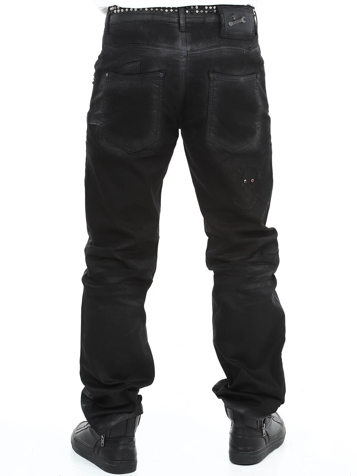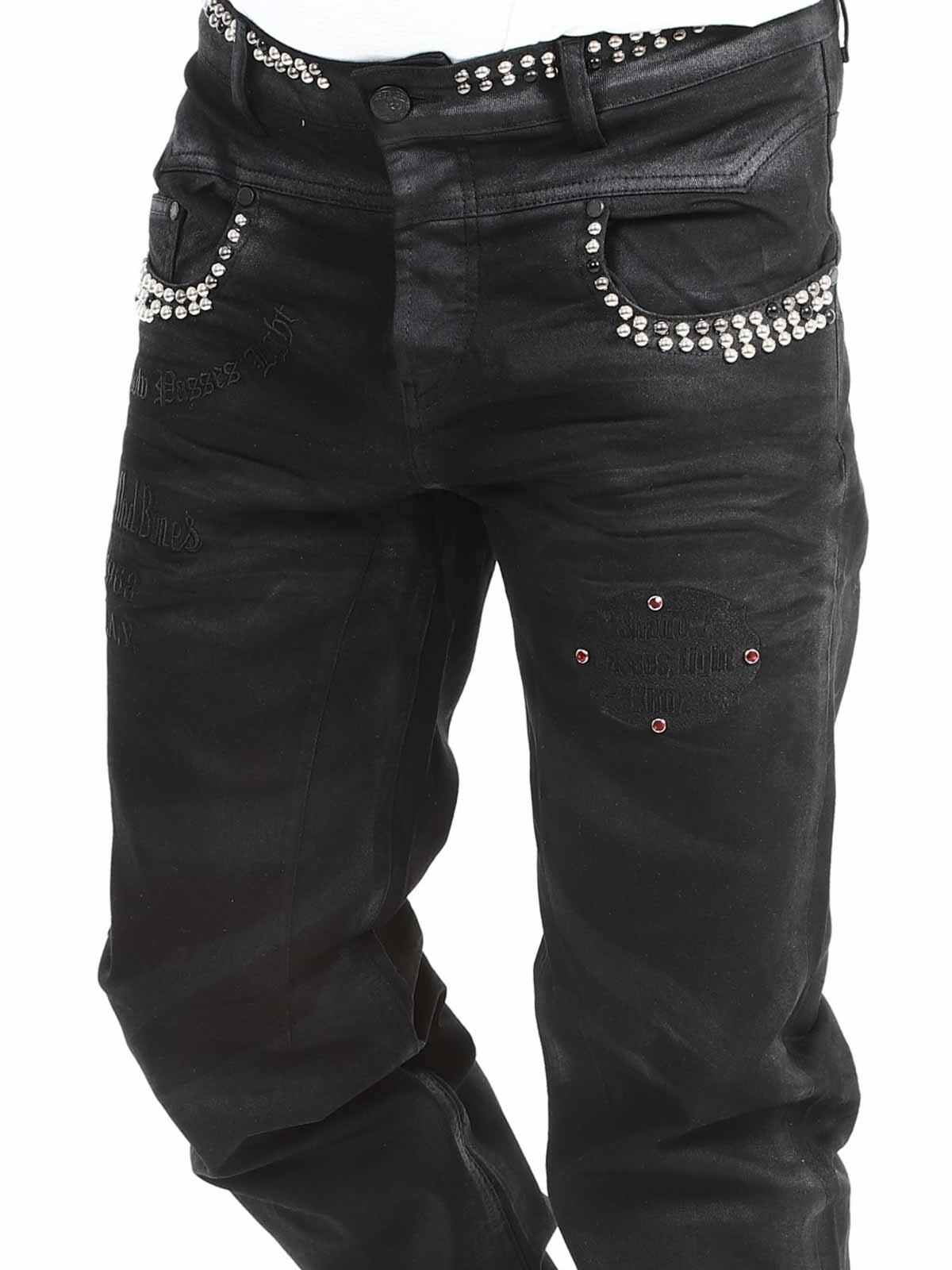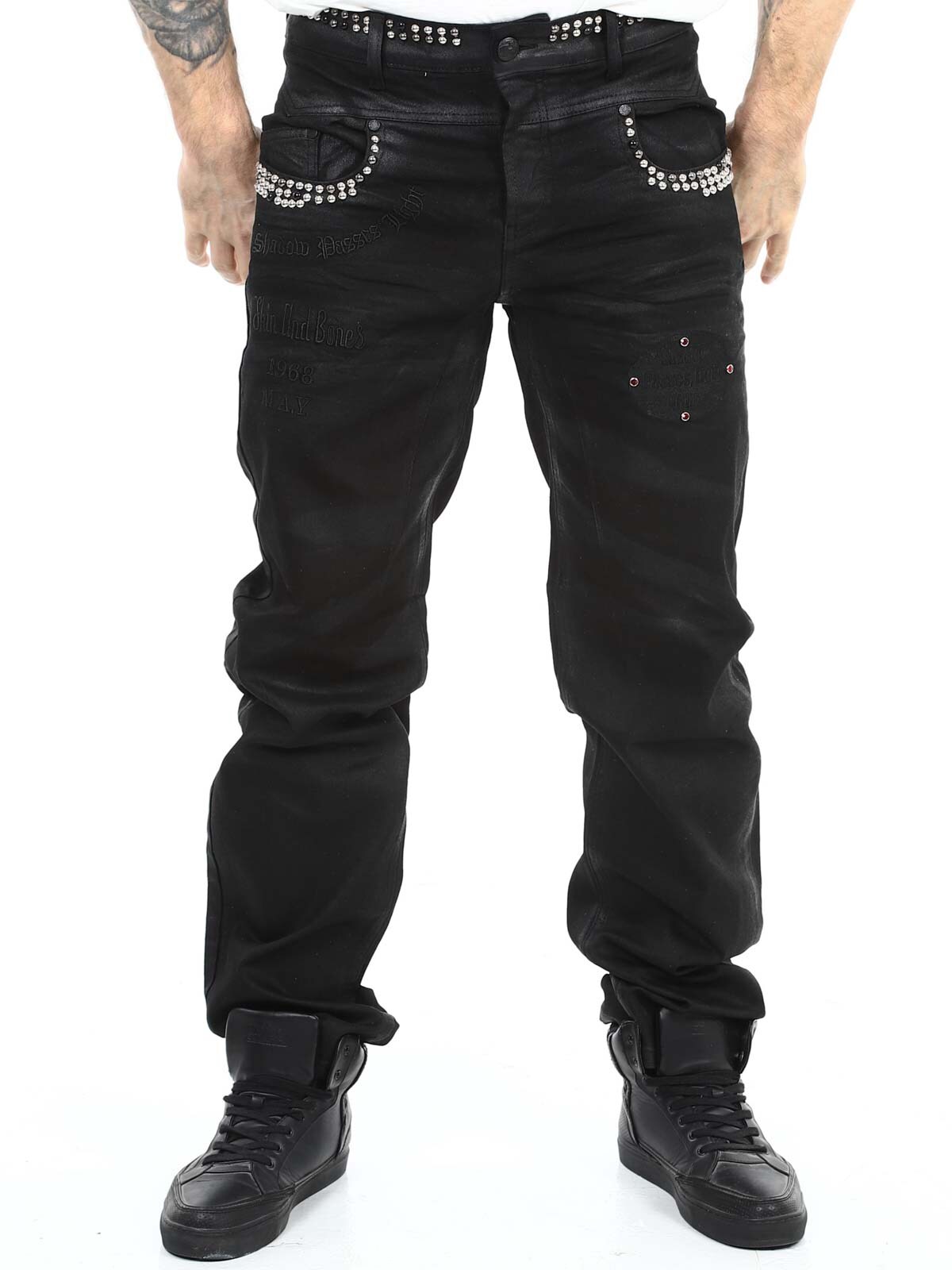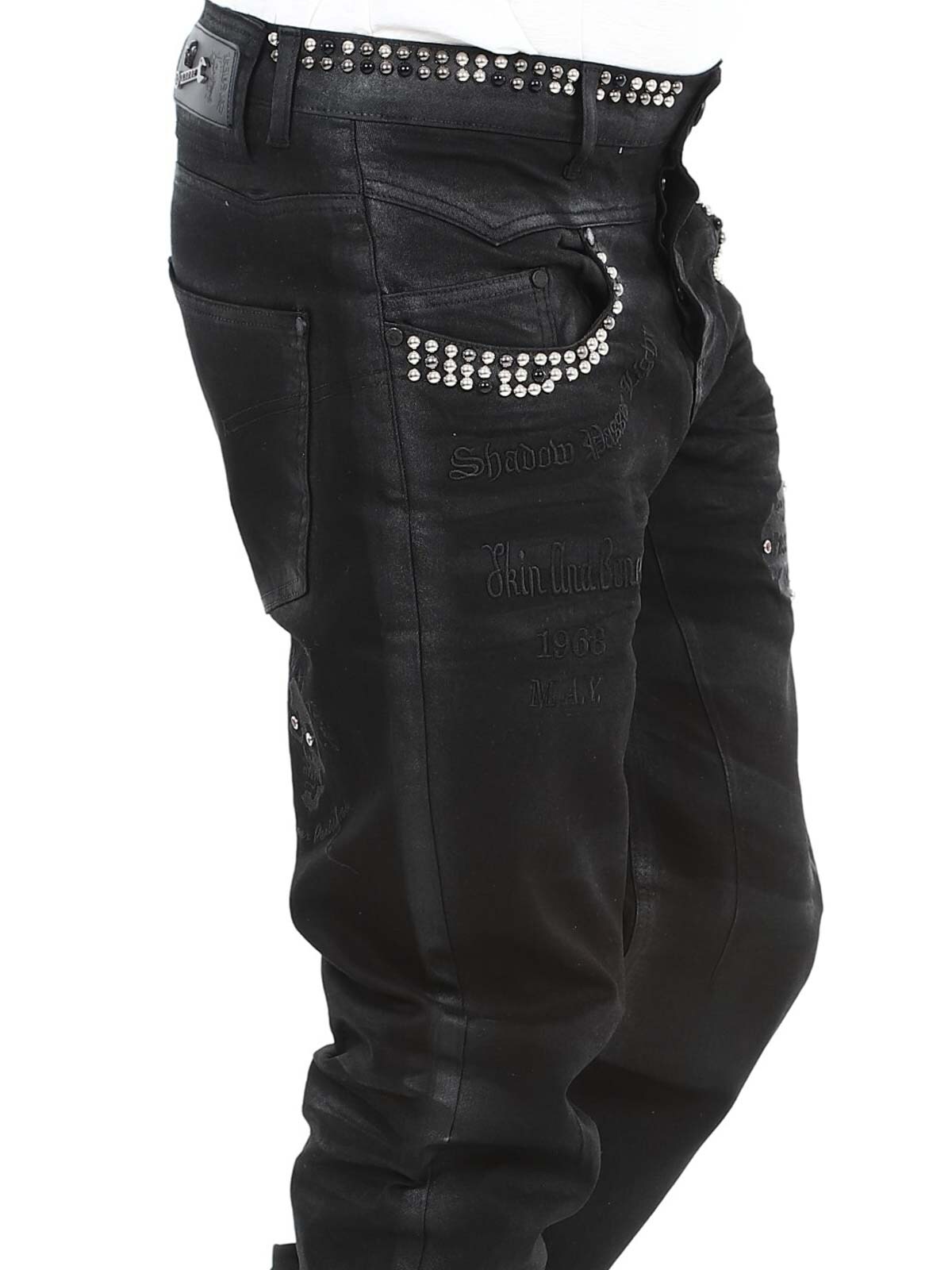 Jeans in stretchy material with an eye-catching design. They have belt loops, three front pockets and three back pockets. Detailed with rivets and tailored prints. If you want to be unique and stand out, these jeans are just right for you!