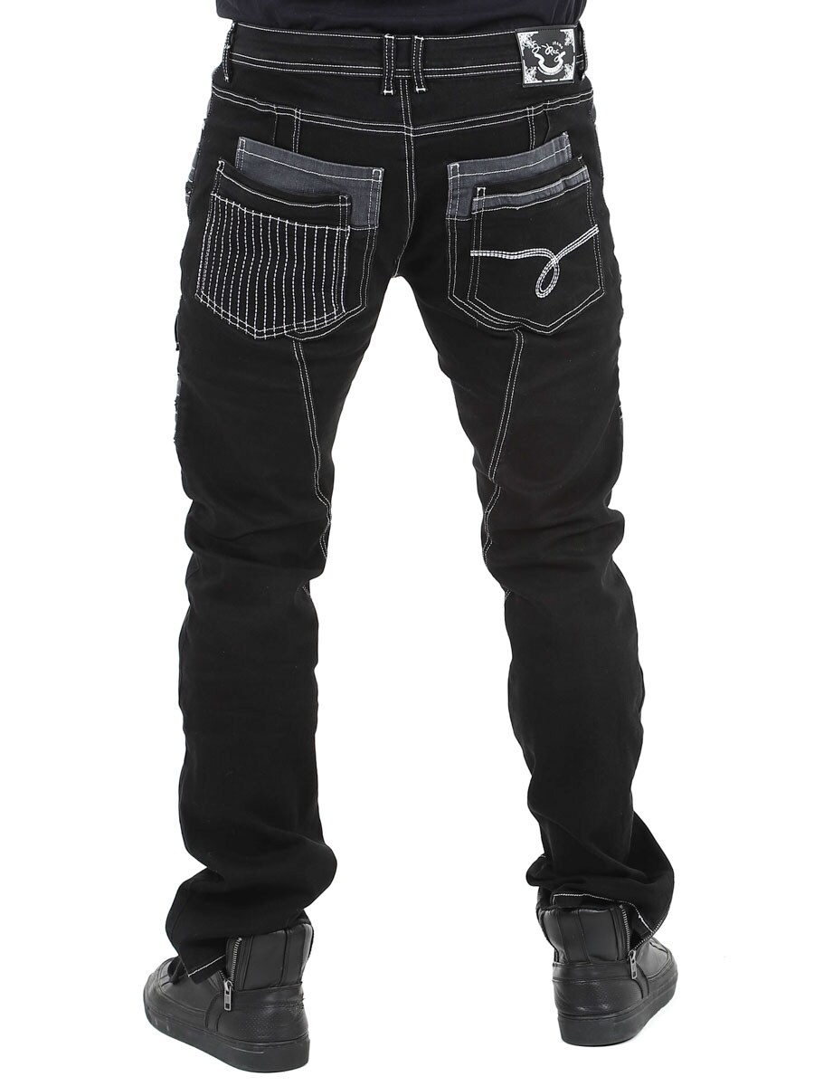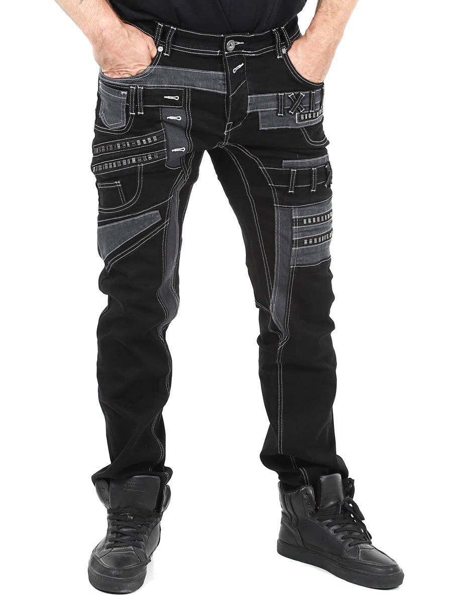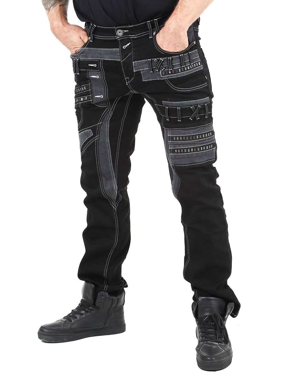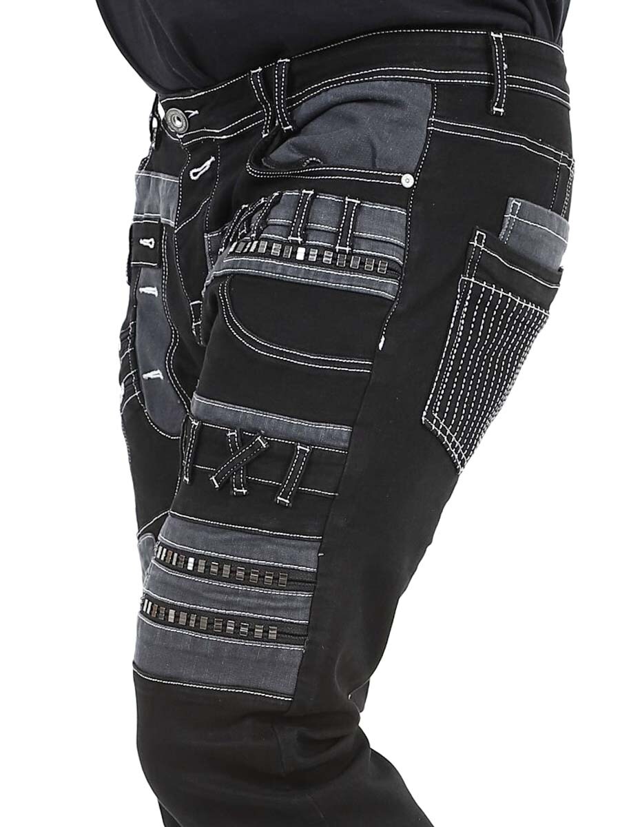 Give your outfit a darker edge with these unique black stretch jeans. Designed with zips, stitching and panels for a bold look. Perfect for those who want to wear something out of the ordinary.