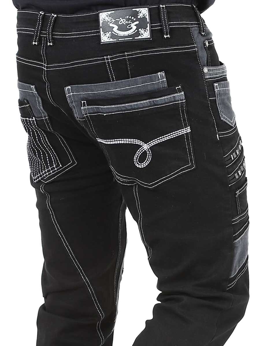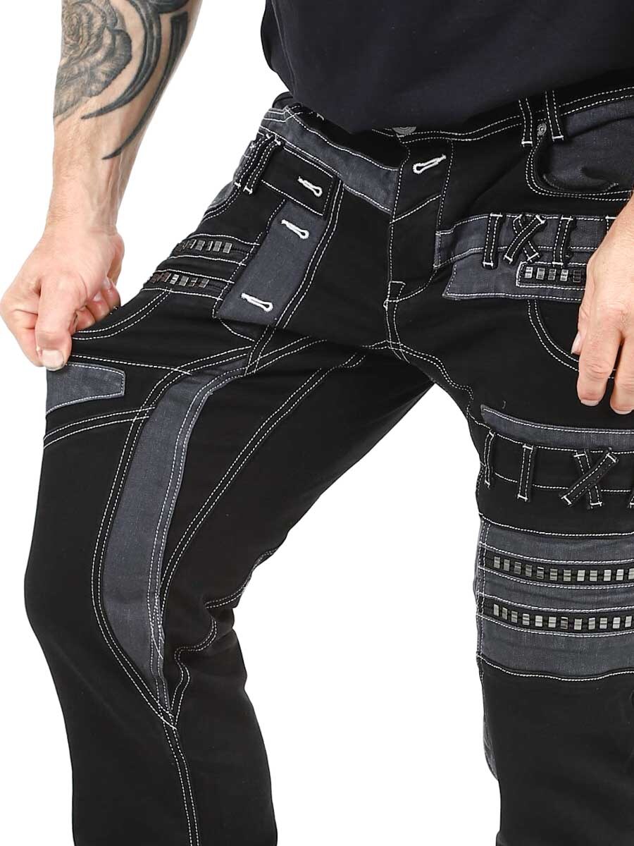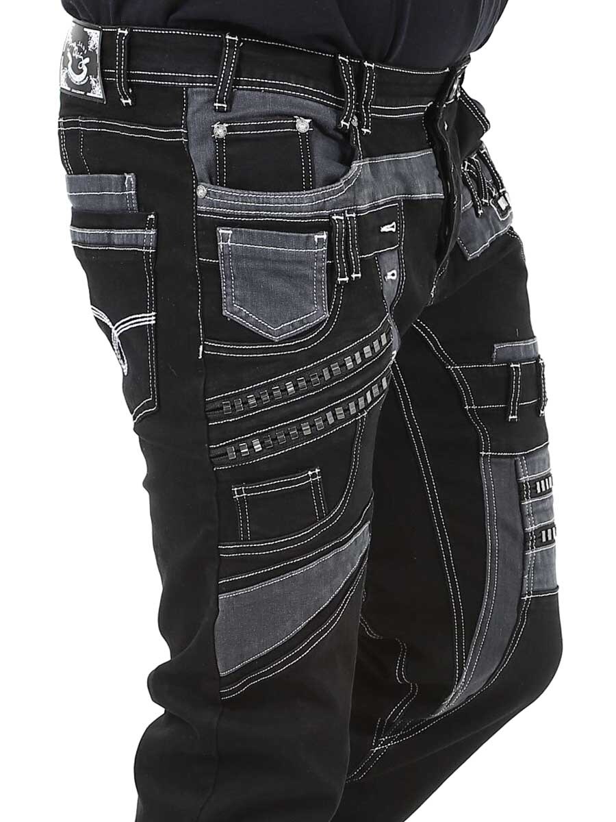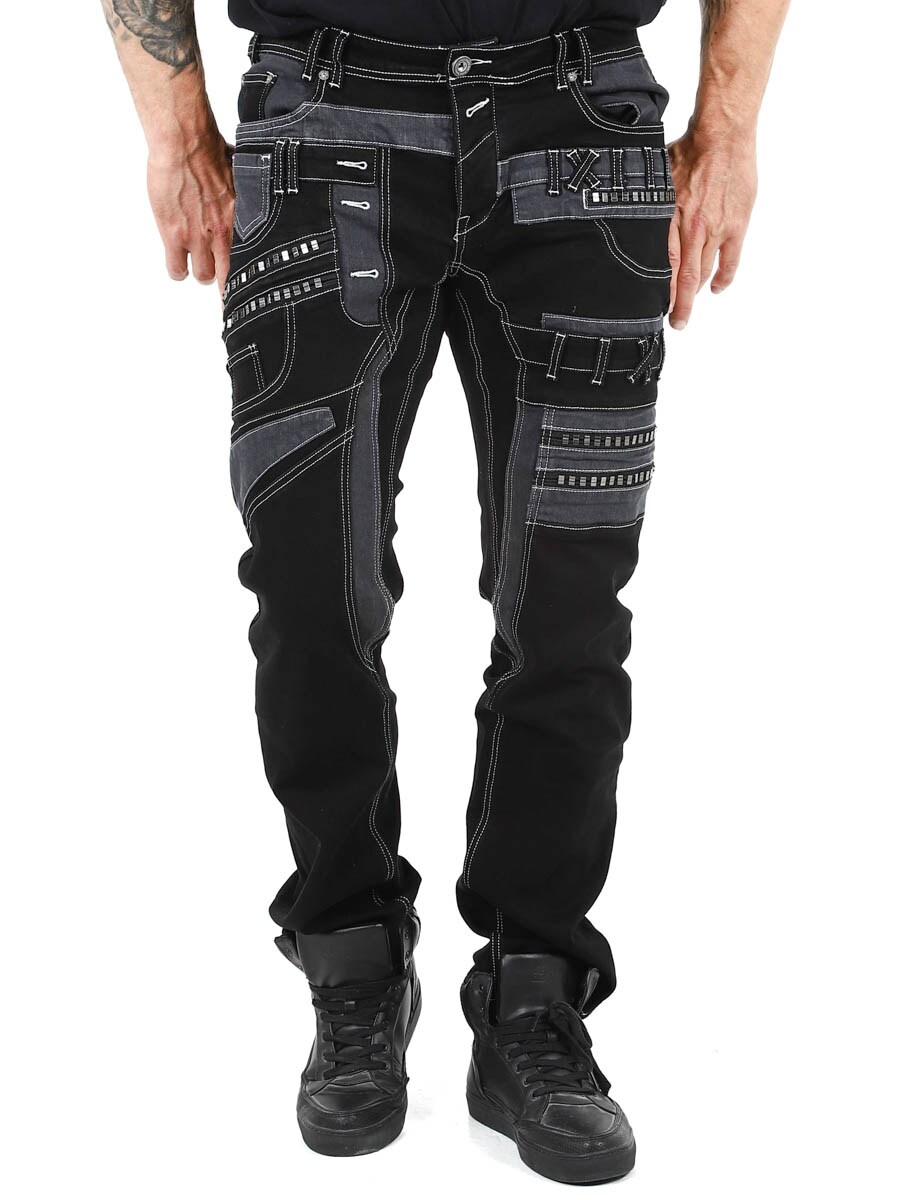 Give your outfit a darker edge with these unique black stretch jeans. Designed with zips, stitching and panels for a bold look. Perfect for those who want to wear something out of the ordinary.