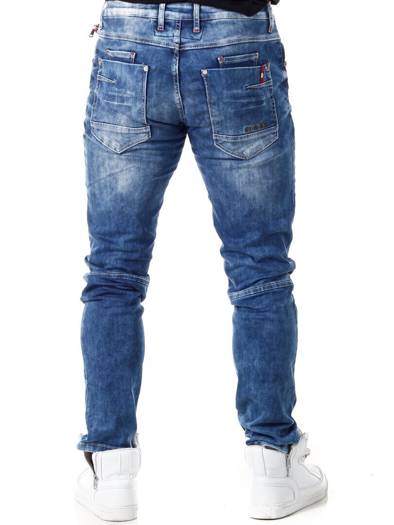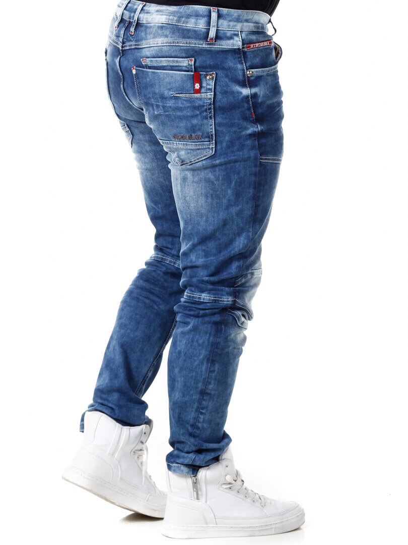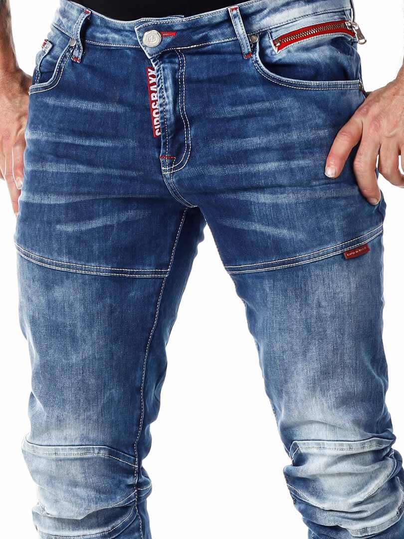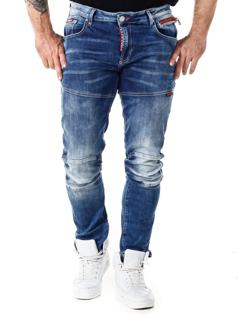 Trousers in stretch denim with extra stitching at the front of the thighs and knees. Four back pockets and four front pockets, one of which has a zip. Red details for a stylish look!