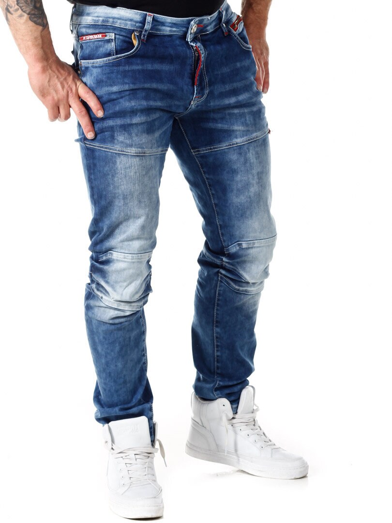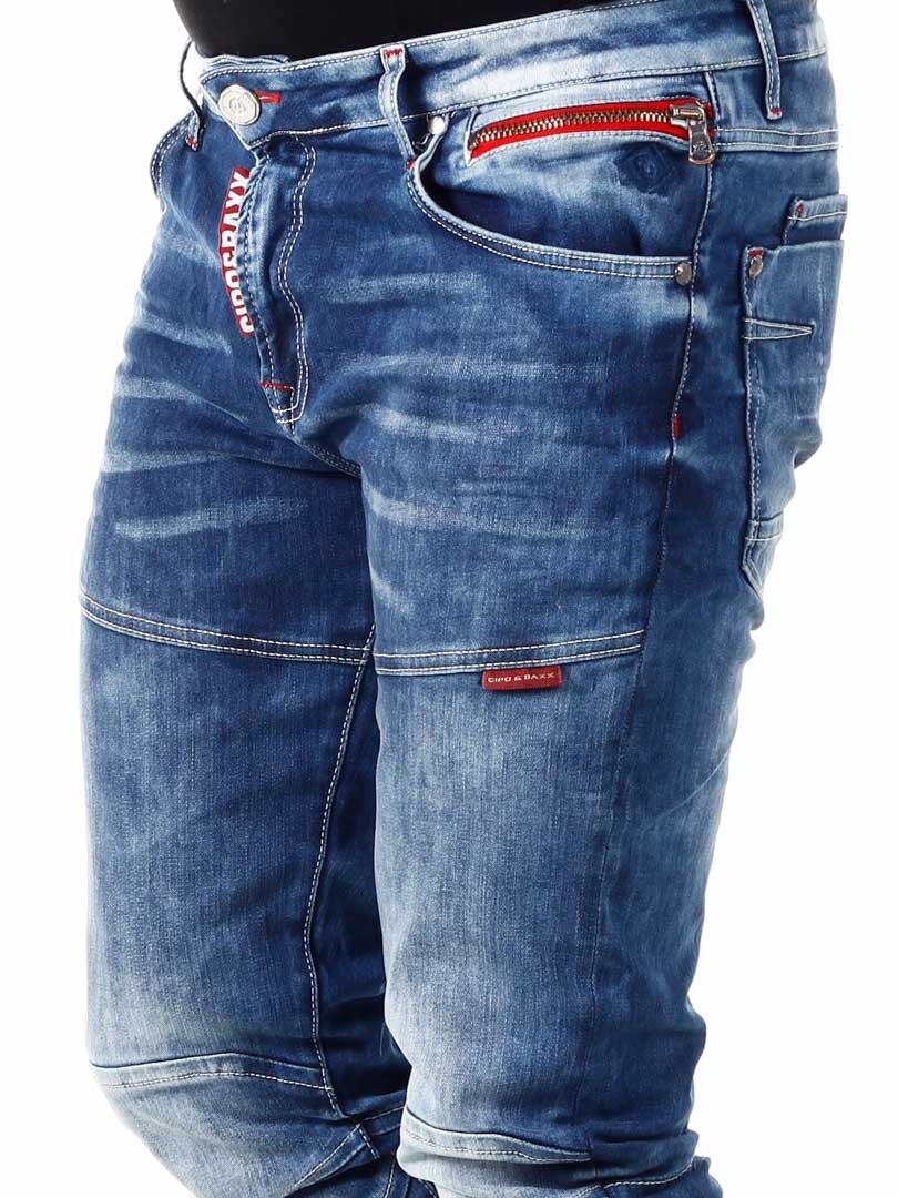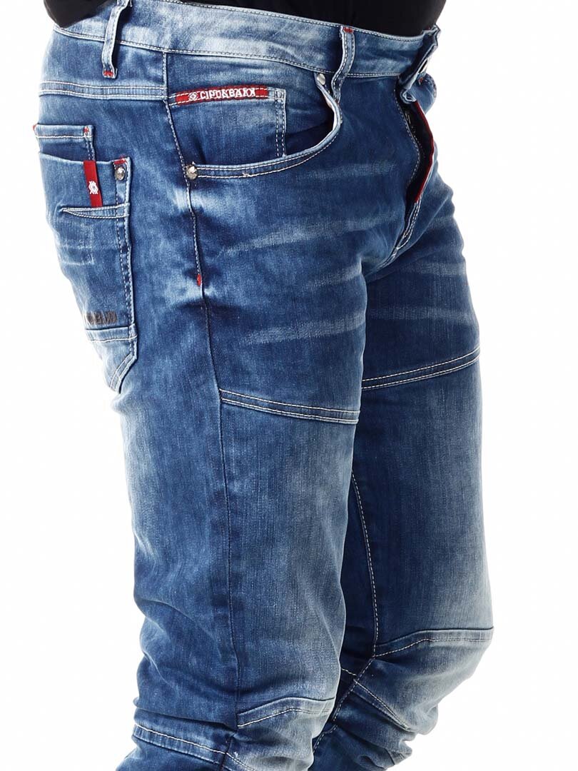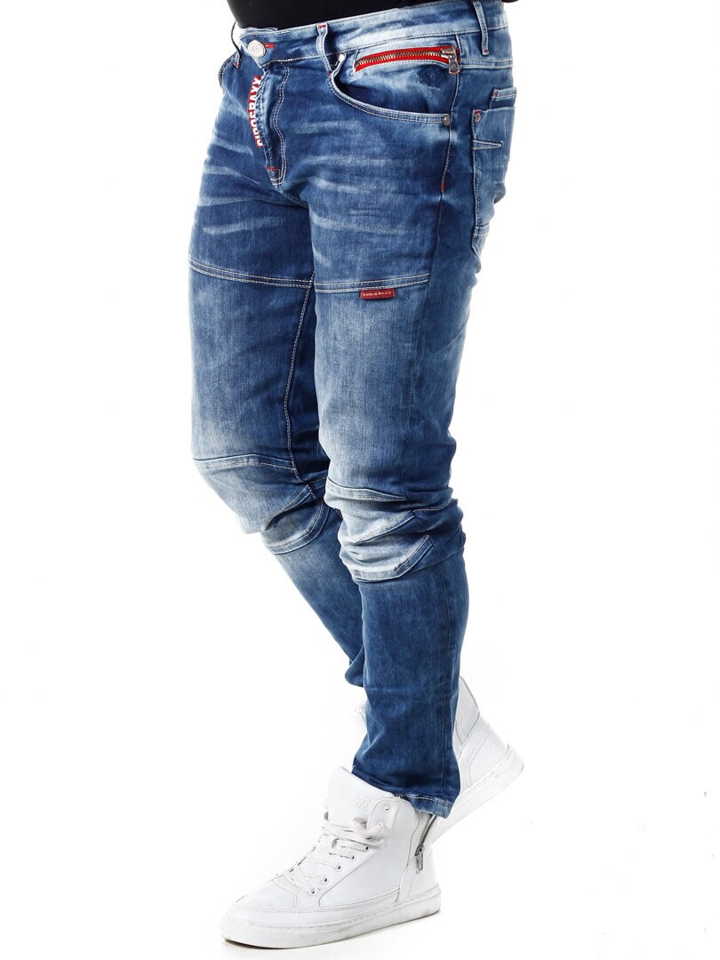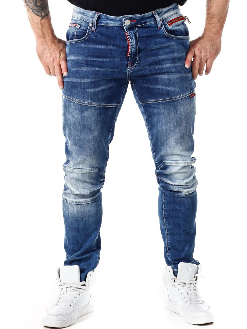 Trousers in stretch denim with extra stitching at the front of the thighs and knees. Four back pockets and four front pockets, one of which has a zip. Red details for a stylish look!