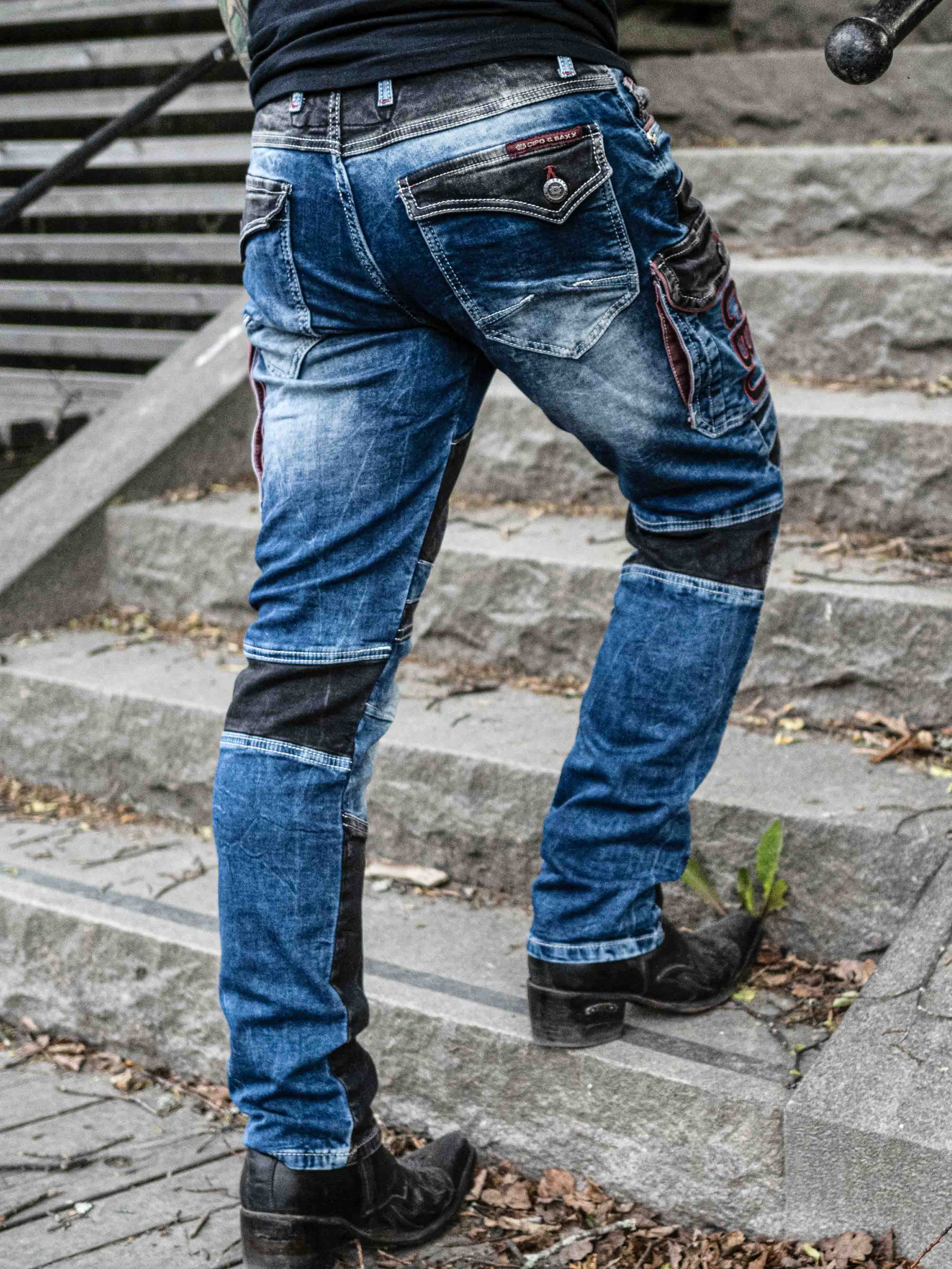 Tough jeans with details in black and red. They have multiple pockets, belt loops at the waist and a logo. Unique jeans that will make you stand out from the crowd!