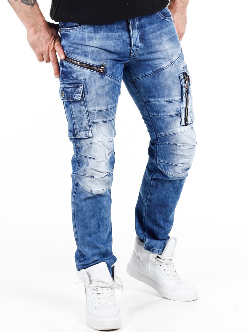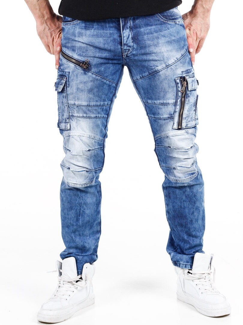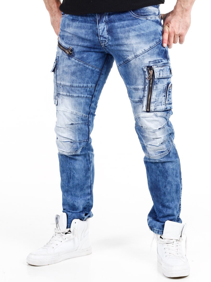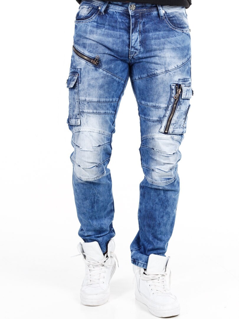 Mid-blue jeans with distressing, metal studs, heavy-duty zippers, and patches in black faux leather featuring the logo.