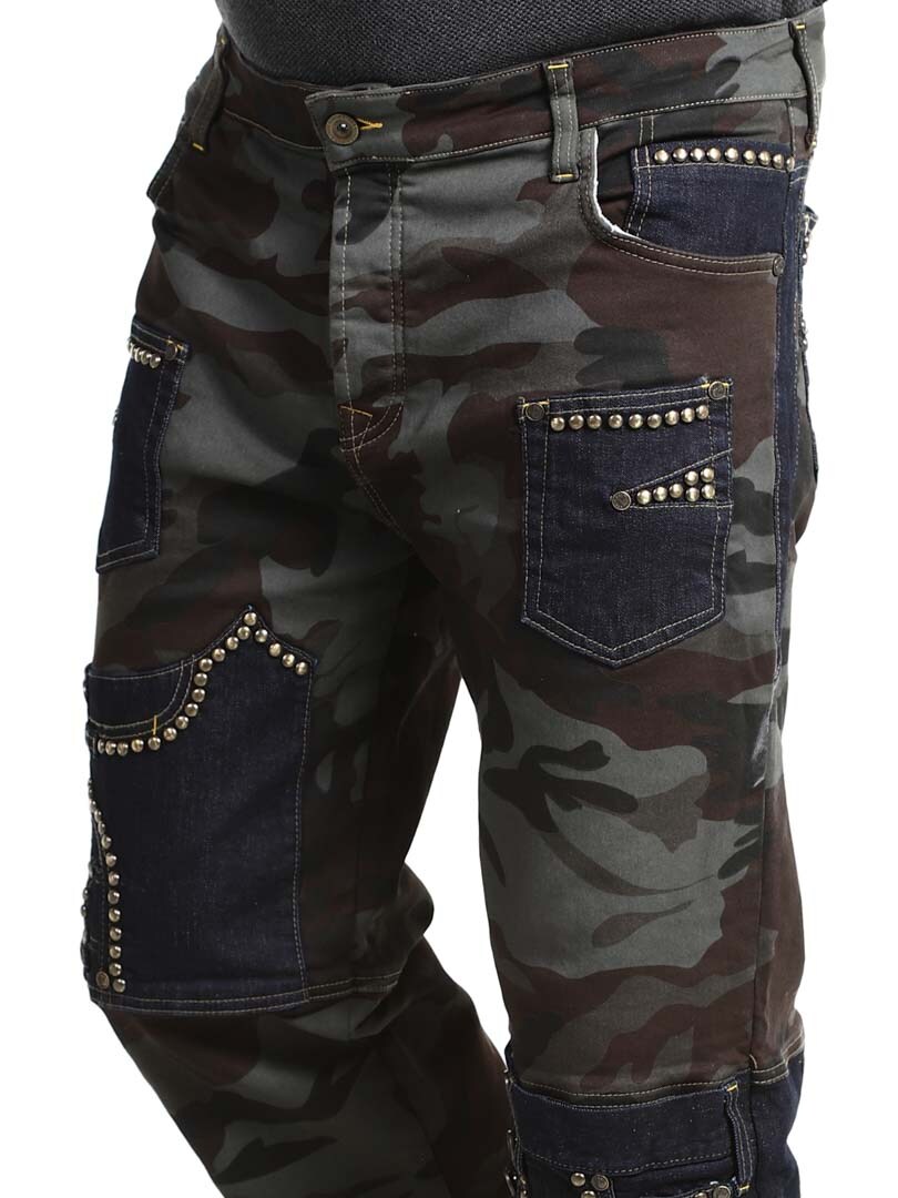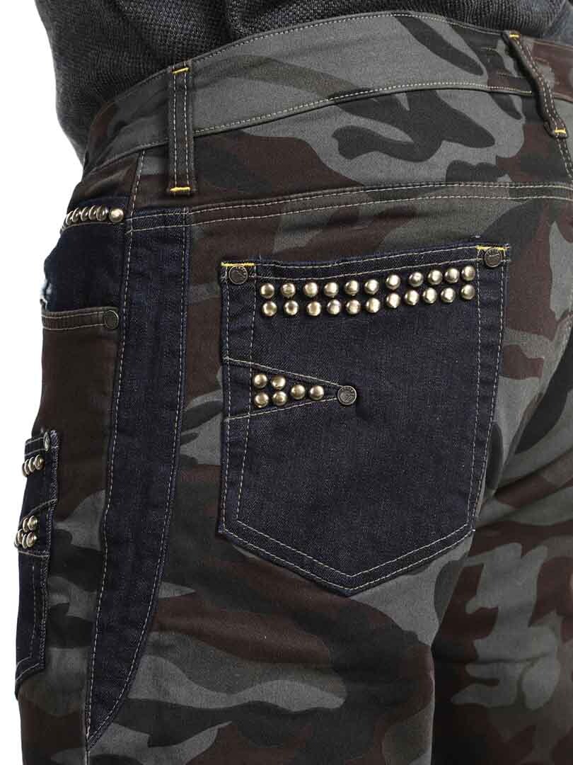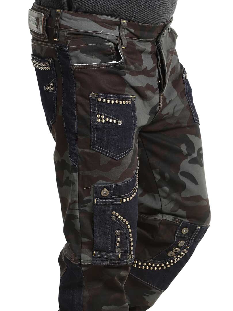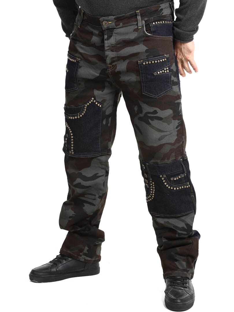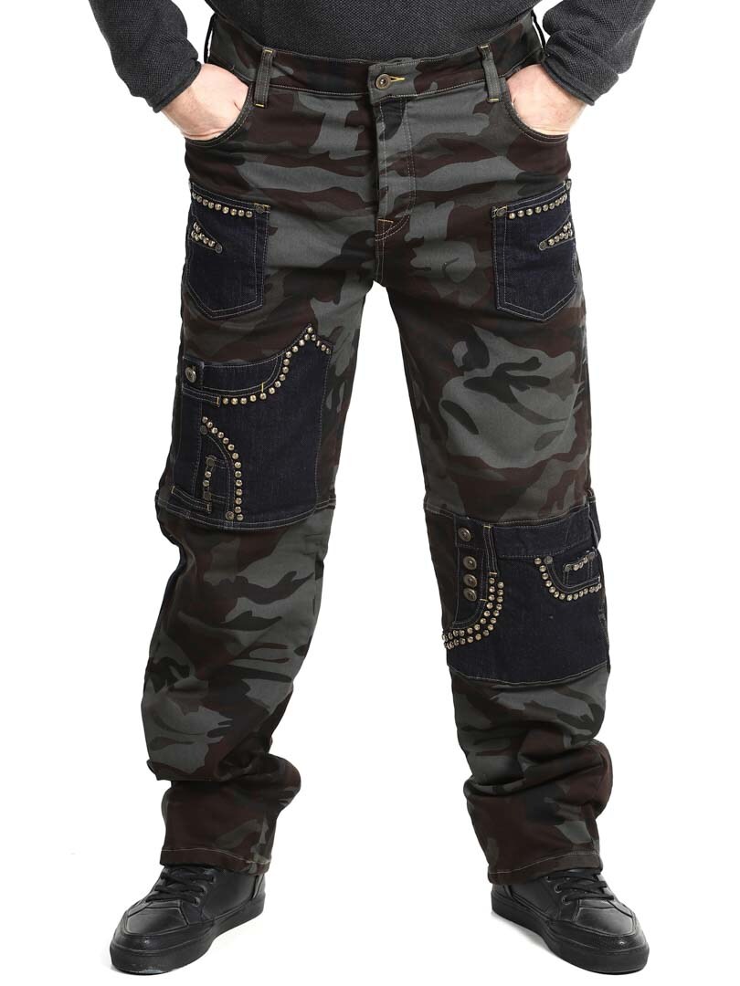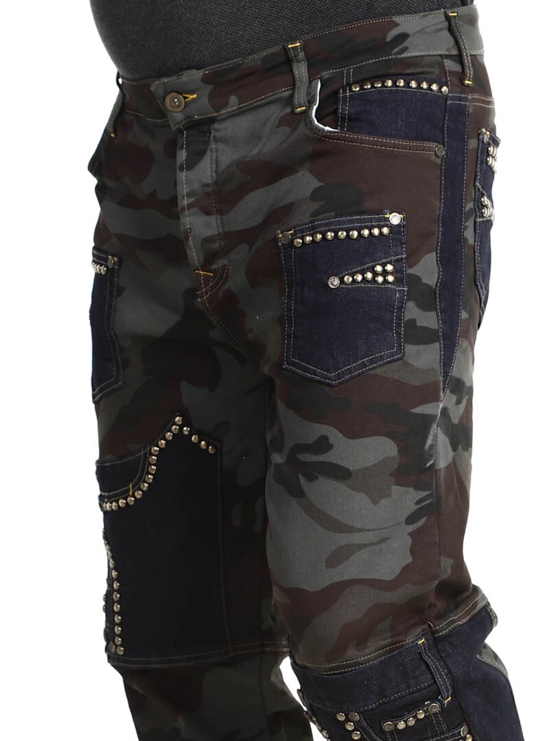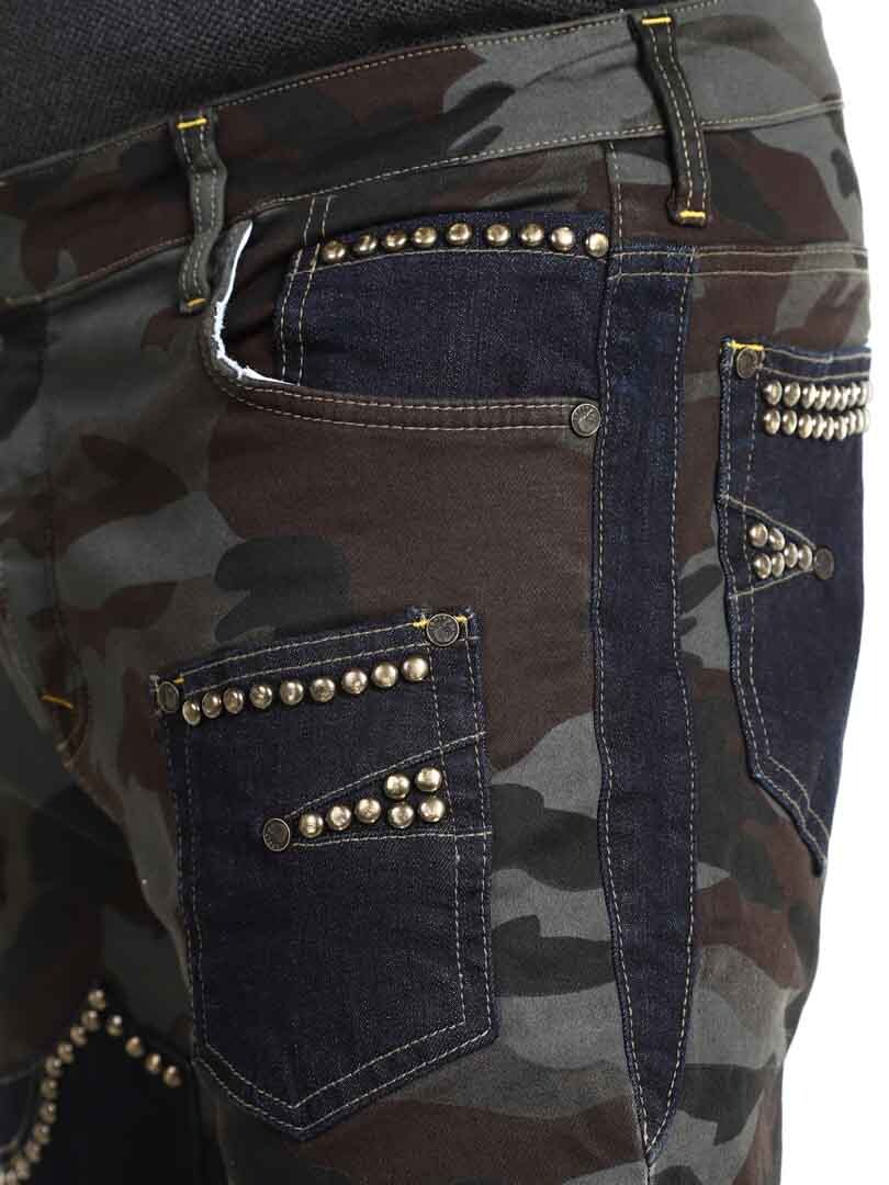 These trousers combine a military pattern design with contrasting denim panels and decorative rivets, creating a raw and eye-catching style. They have several functional and stylish pockets. The stretchy fit provides comfort and freedom of movement, while the trousers are perfect for those who want to stand out with an edgy look!