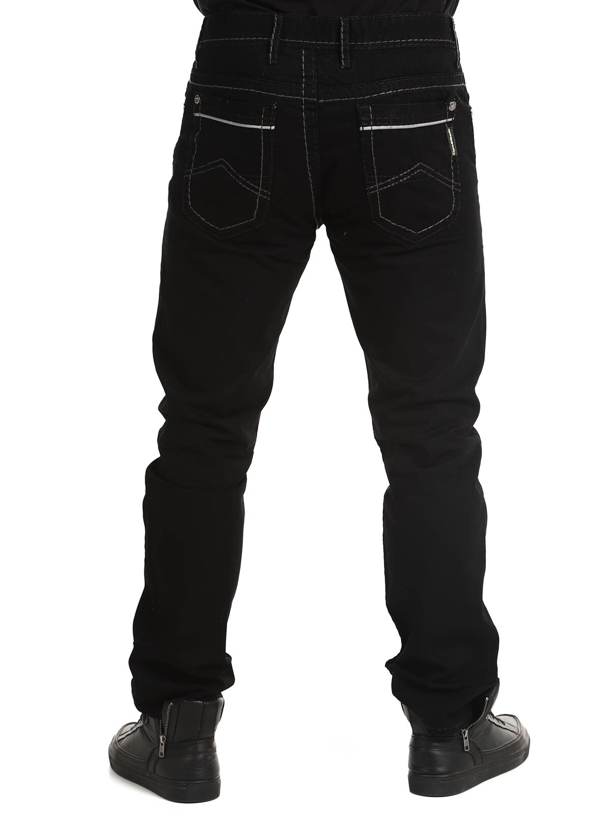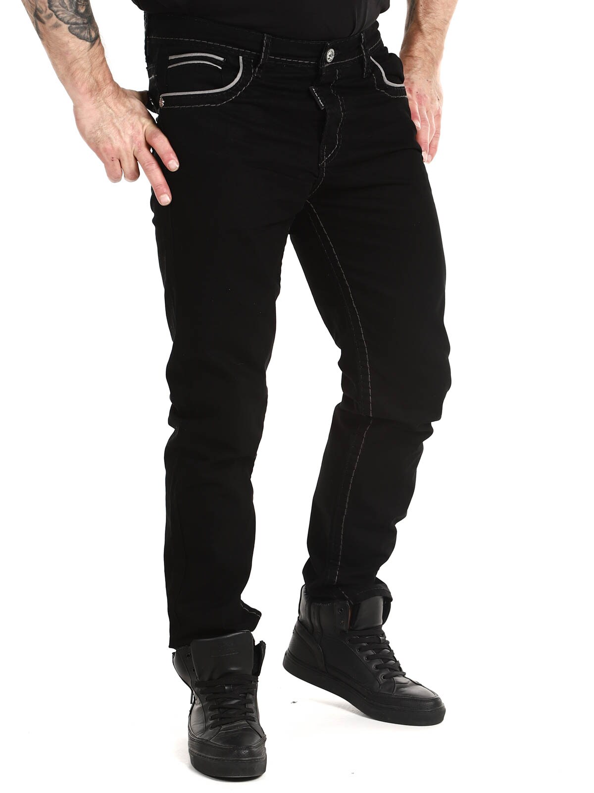 Black jeans in a classic fit with bold contrast color seams. They feature four front pockets and two back pockets. Stylish trousers that go well with almost anything!