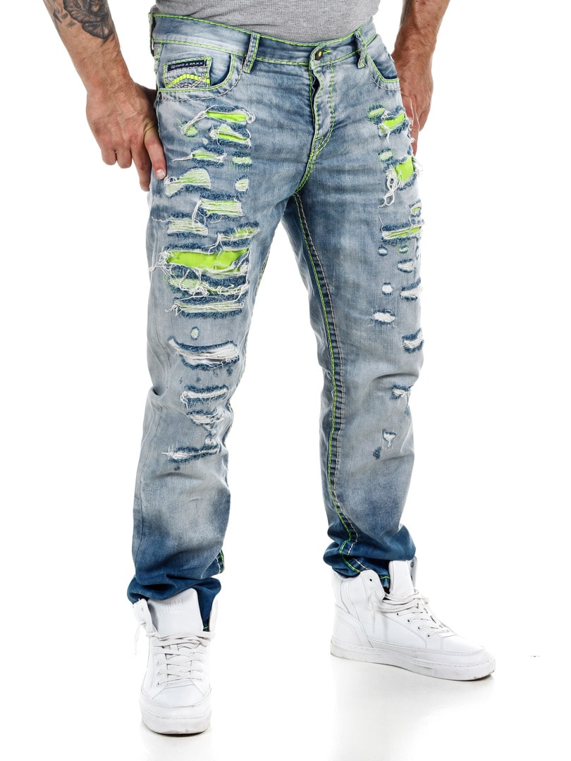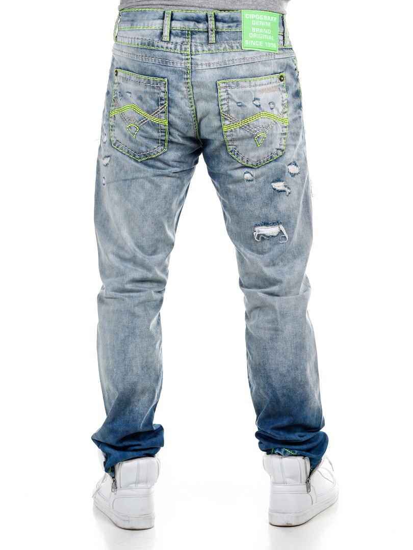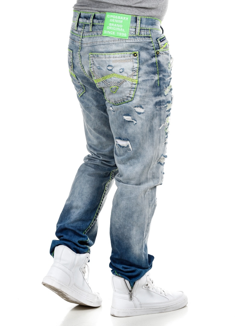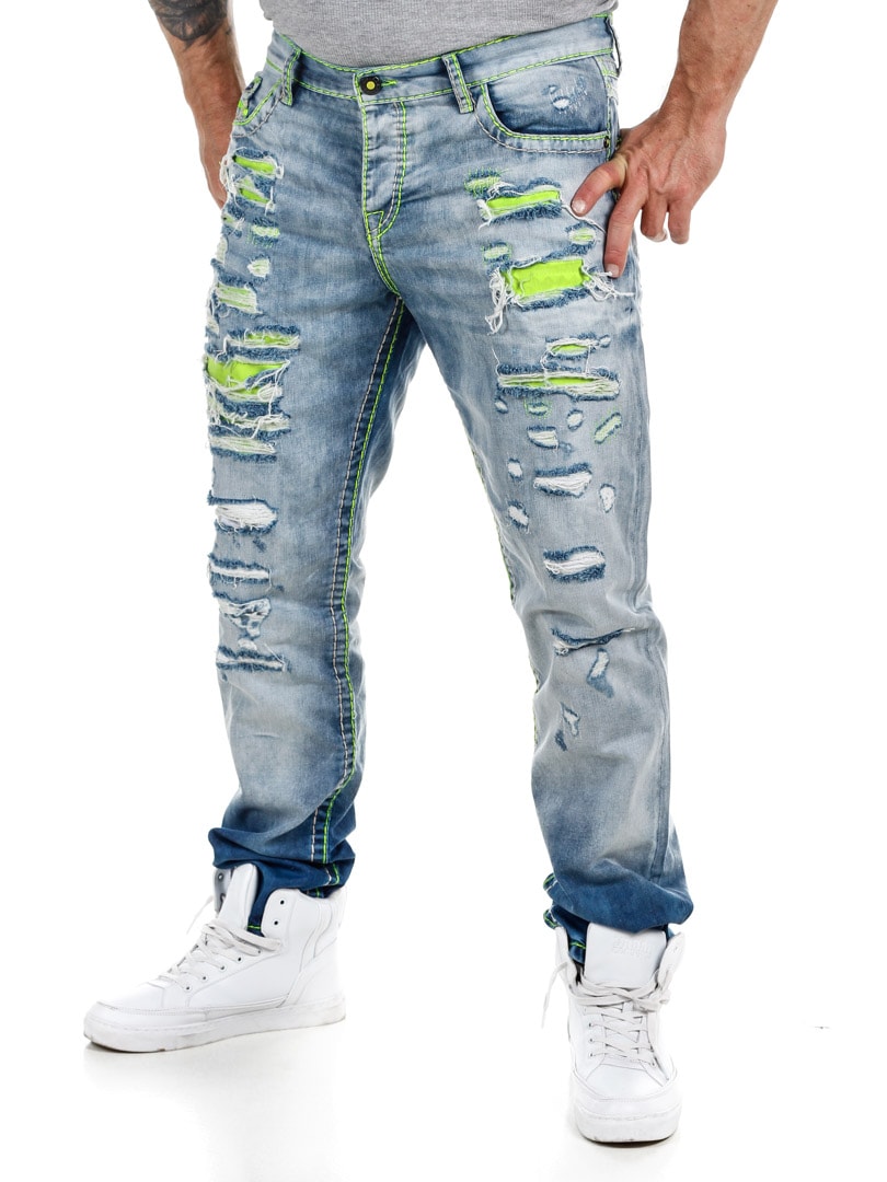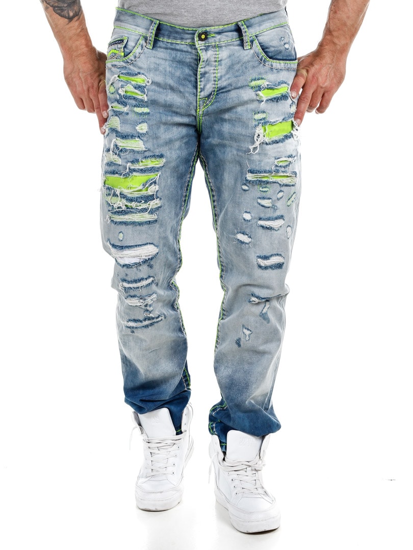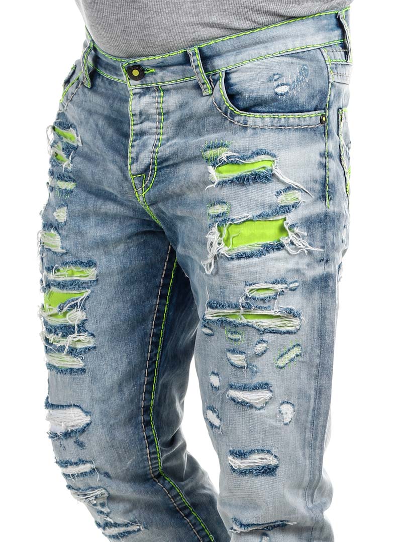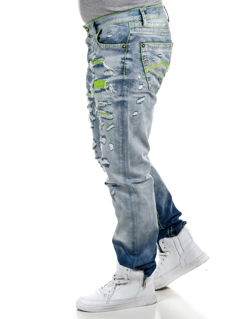 Light denim trousers with contrasting neon green stitching. Classic fit, three front pockets and two back pockets. Designed with heavy distressing and neon green lining for a cool effect on the front.