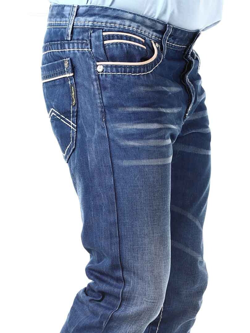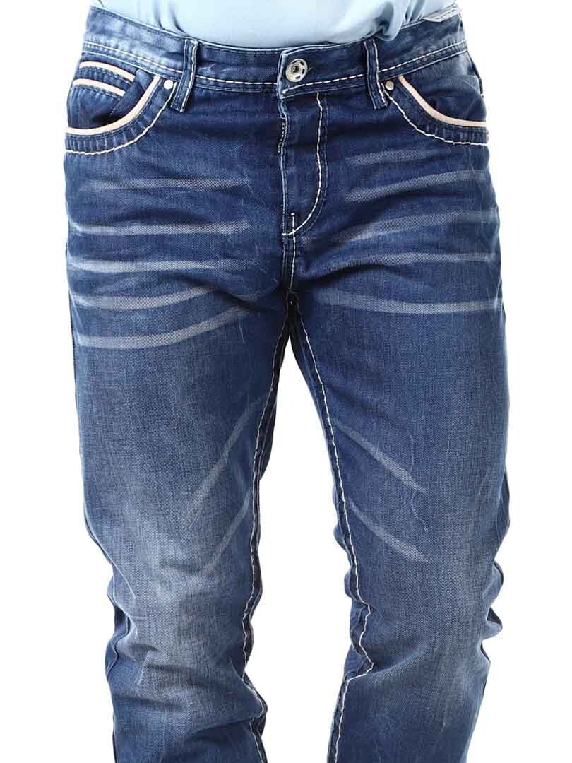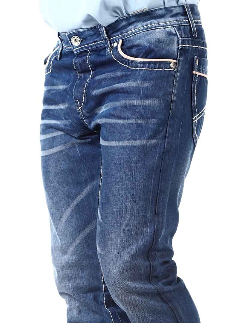 Stone-washed jeans in a classic fit with bold contrast color stitching. They have four front pockets and two back pockets. Stylish trousers that go with most things!