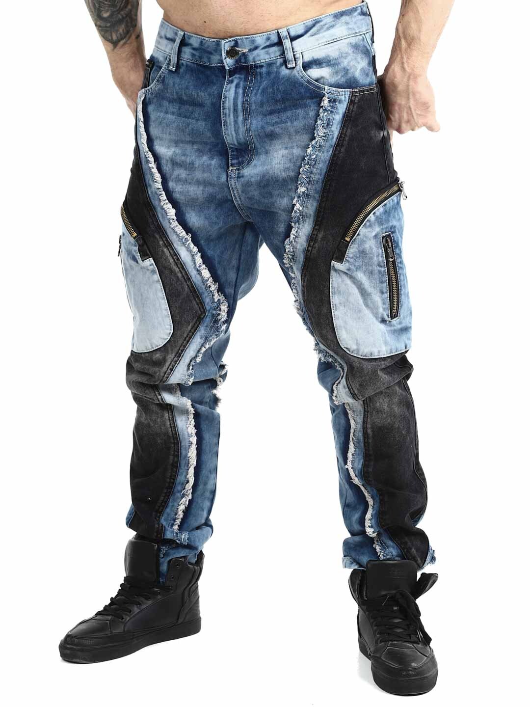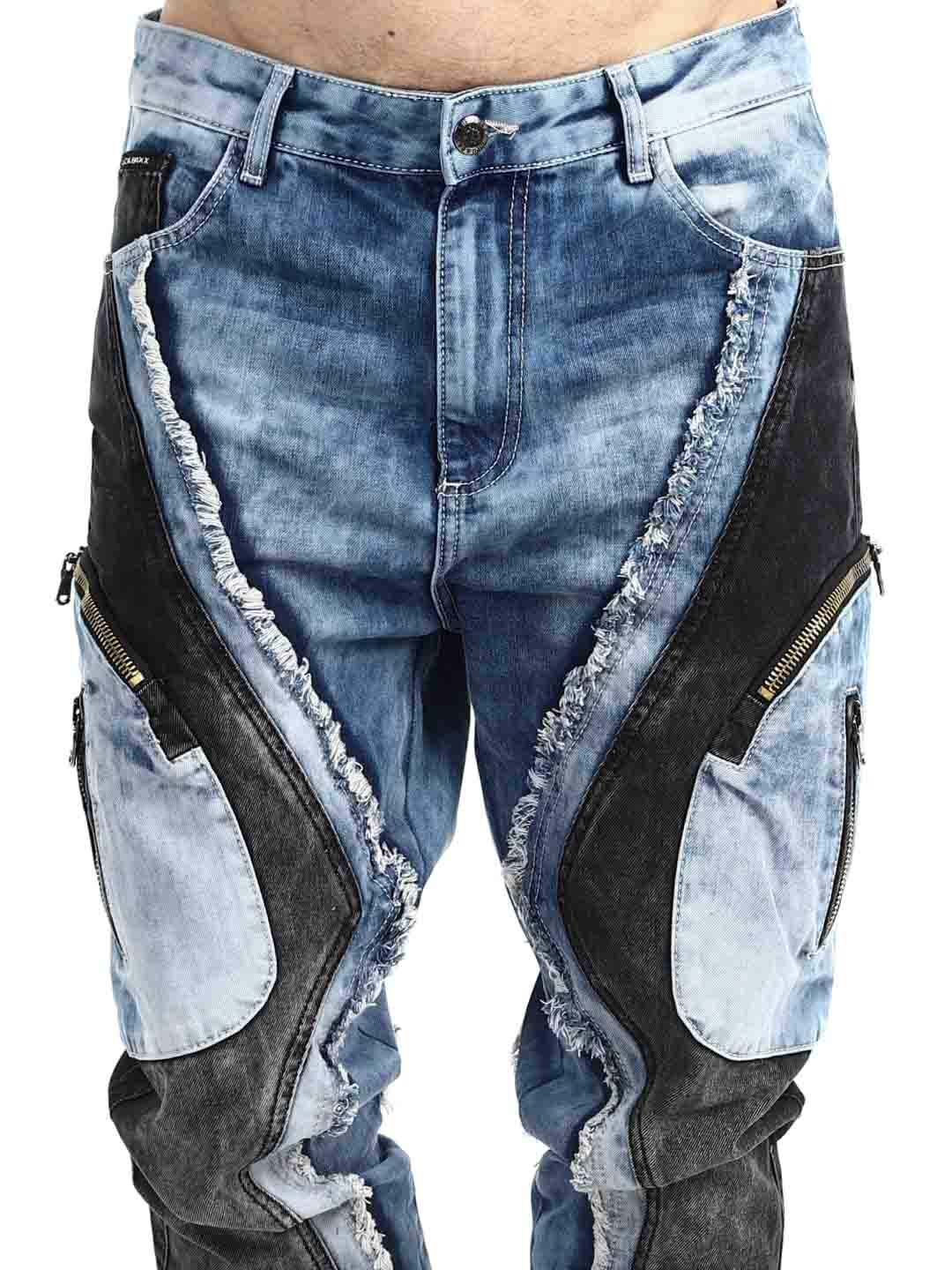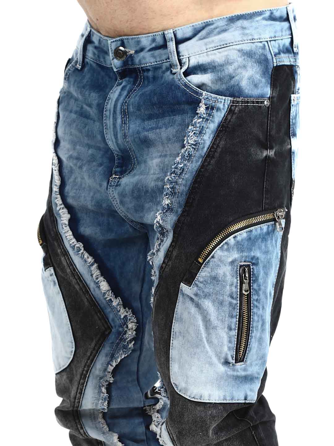 These jeans are designed for those who want to stand out. The model features a unique patchwork look with contrasting denim panels, frayed edges, and bold stitching that create a strong, urban attitude. Multiple zippers enhance the edgy style and give the jeans a clear street- and biker-inspired feel.