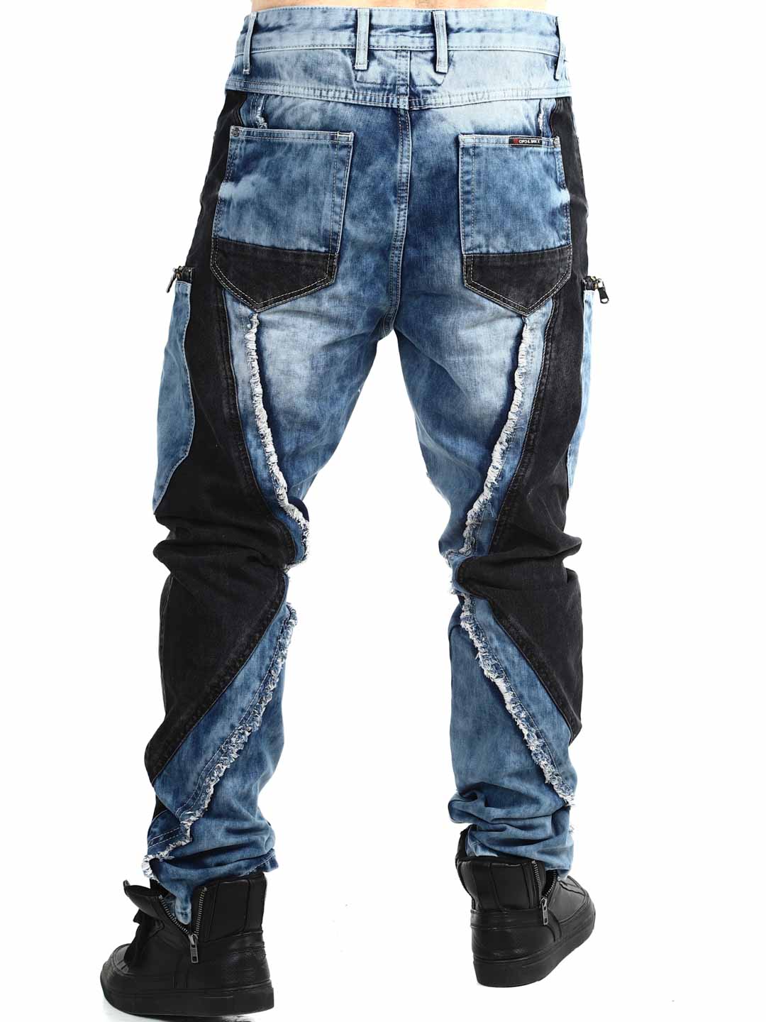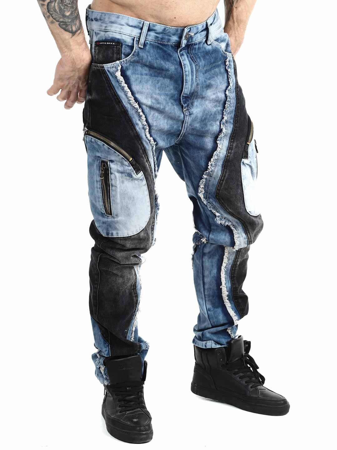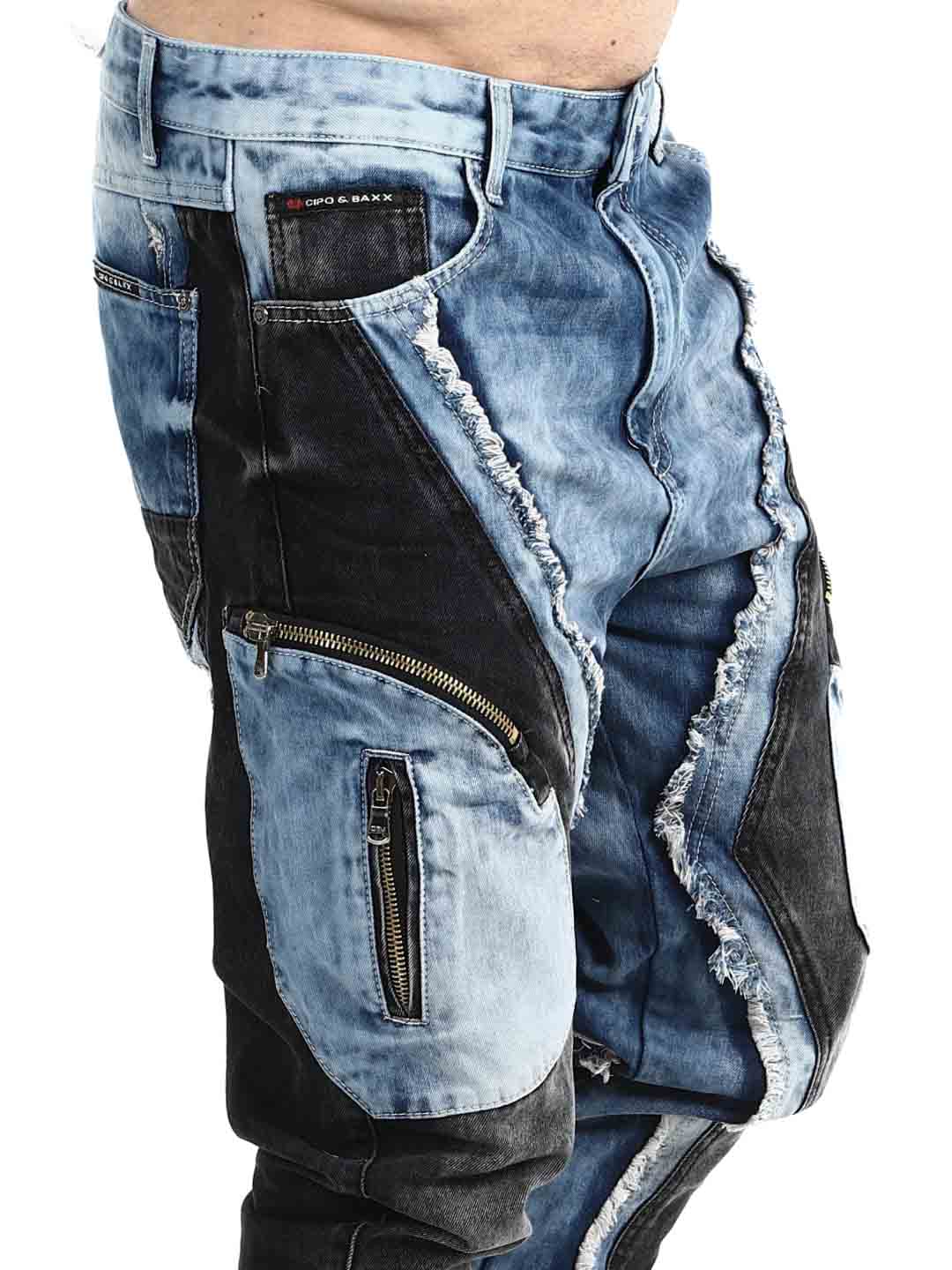 These jeans are designed for those who want to stand out. The model features a unique patchwork look with contrasting denim panels, frayed edges, and bold stitching that create a strong, urban attitude. Multiple zippers enhance the edgy style and give the jeans a clear street- and biker-inspired feel.
