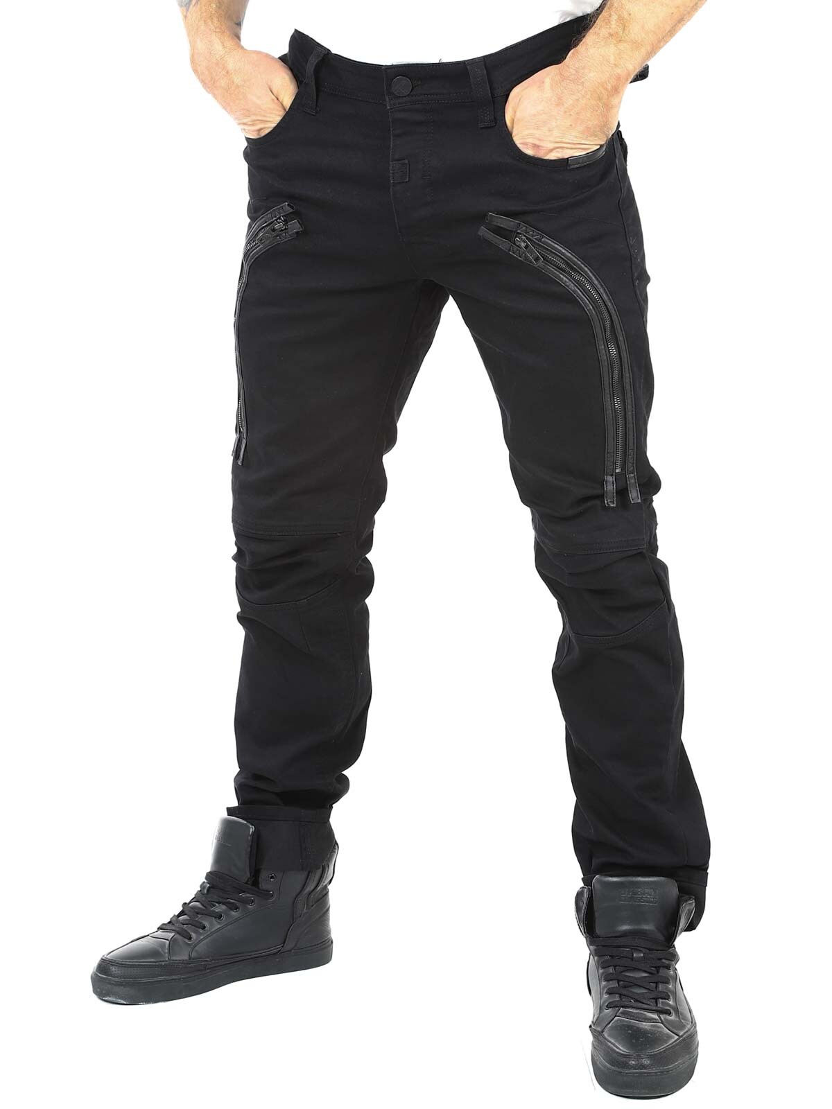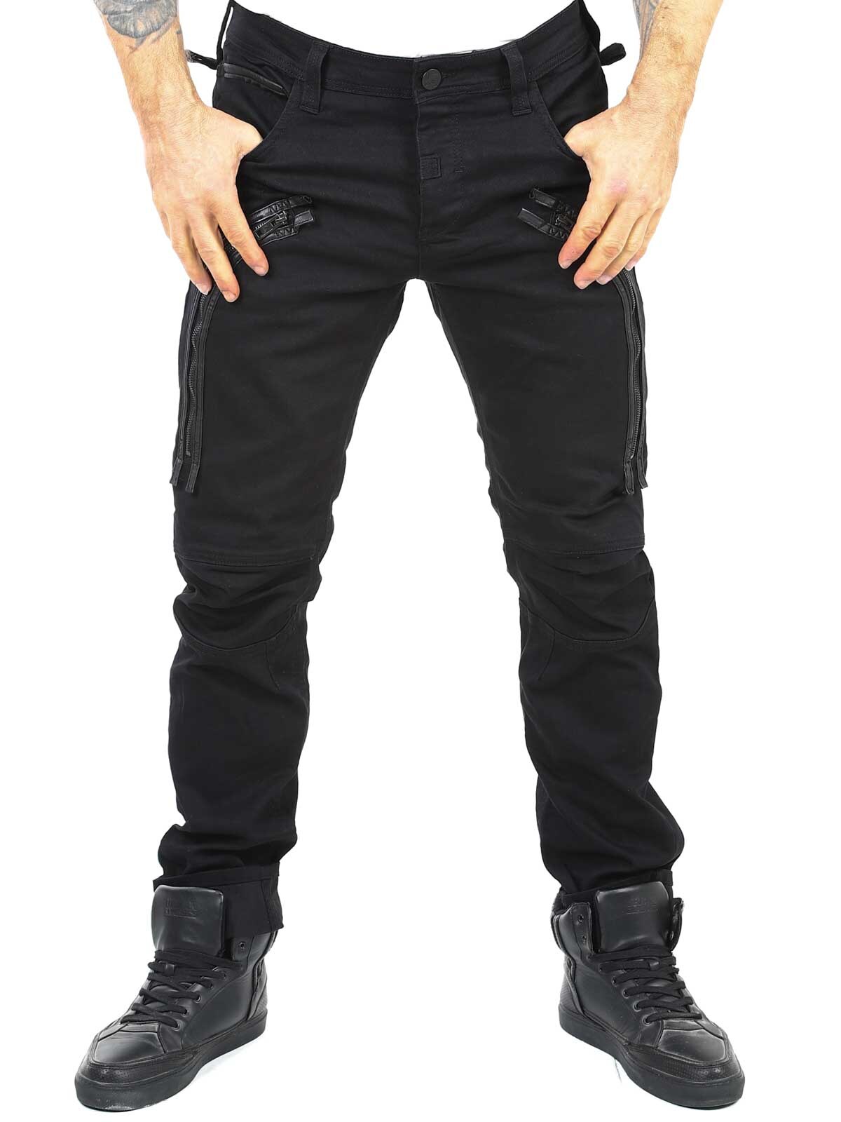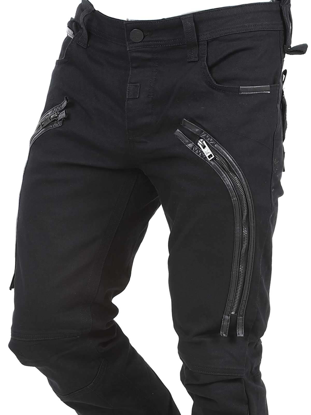 Black jeans with stretch and a slim fit. They have three open front pockets, two closable pockets and buttons on the fly. Designed with drawstrings and faux leather straps.