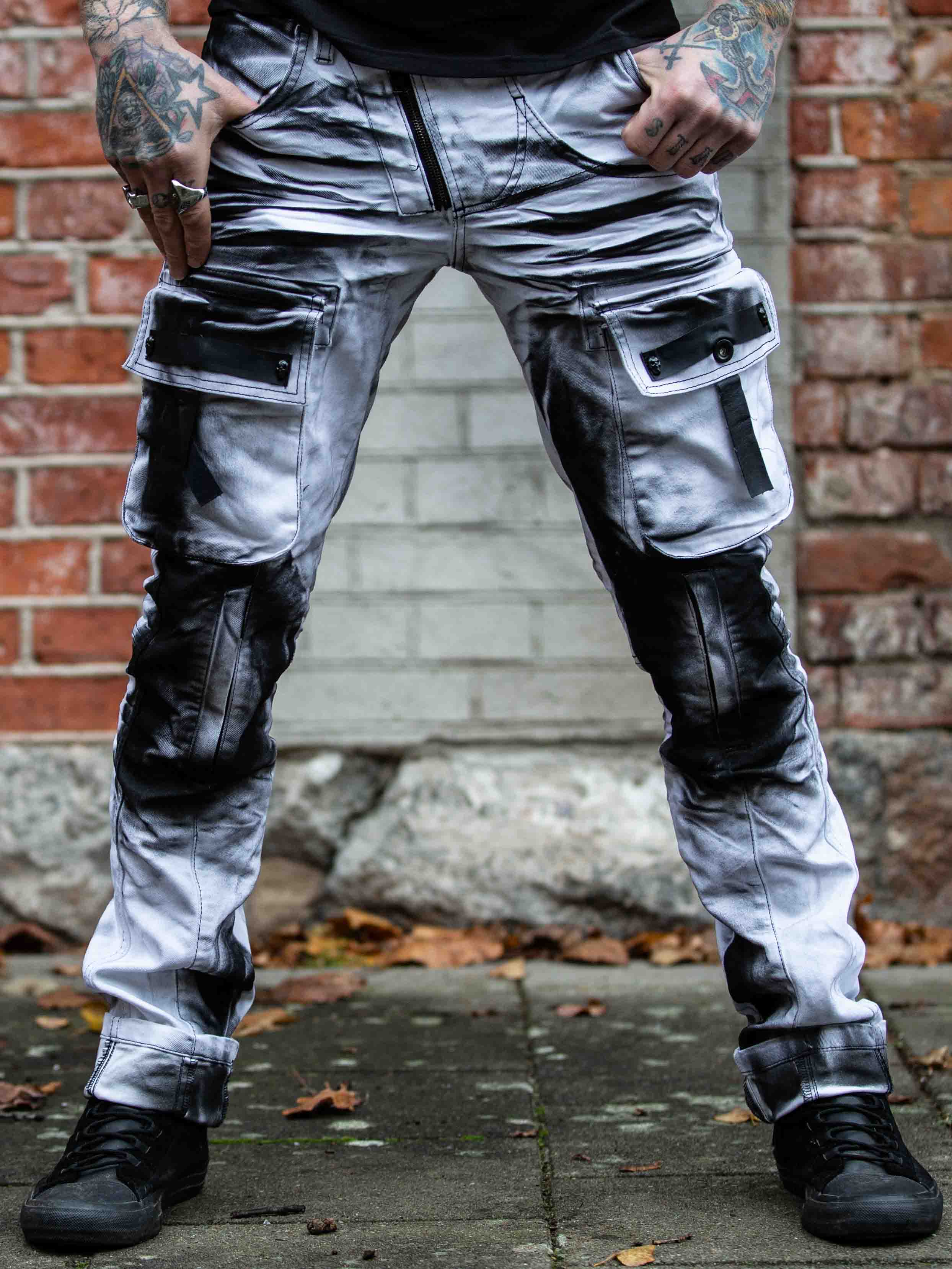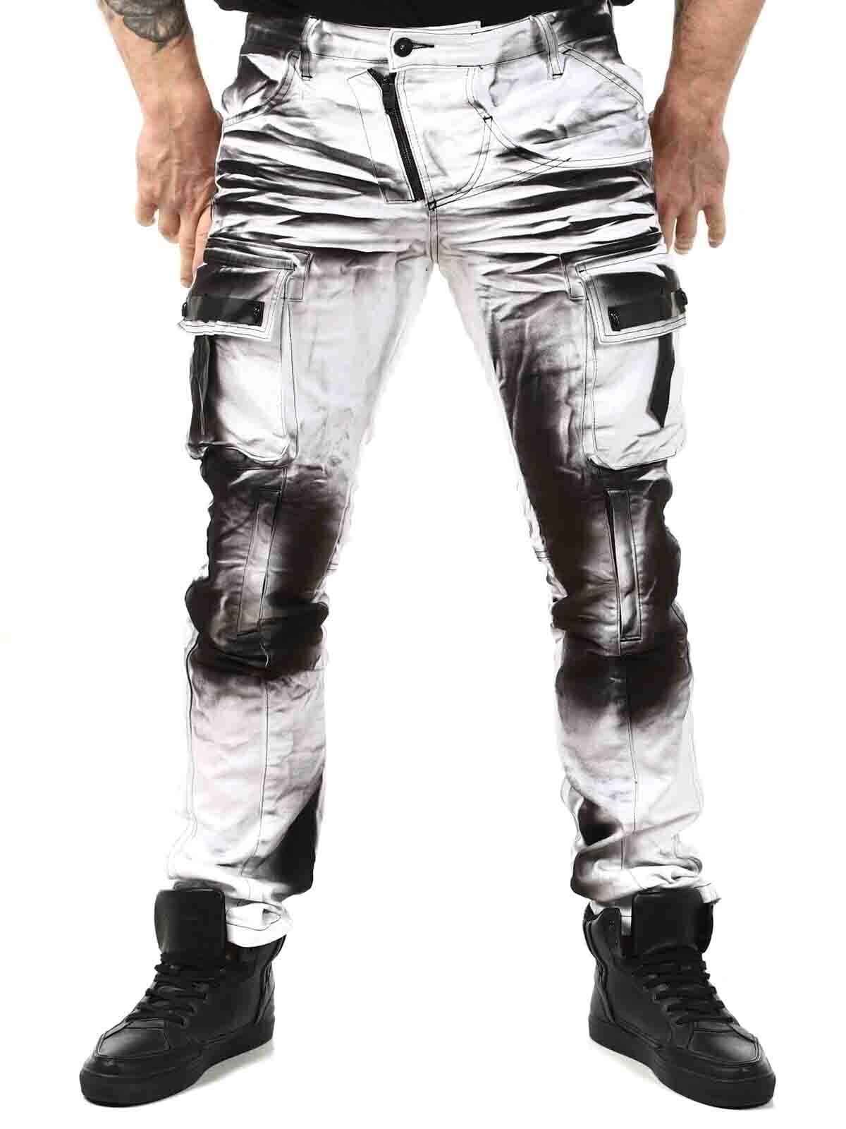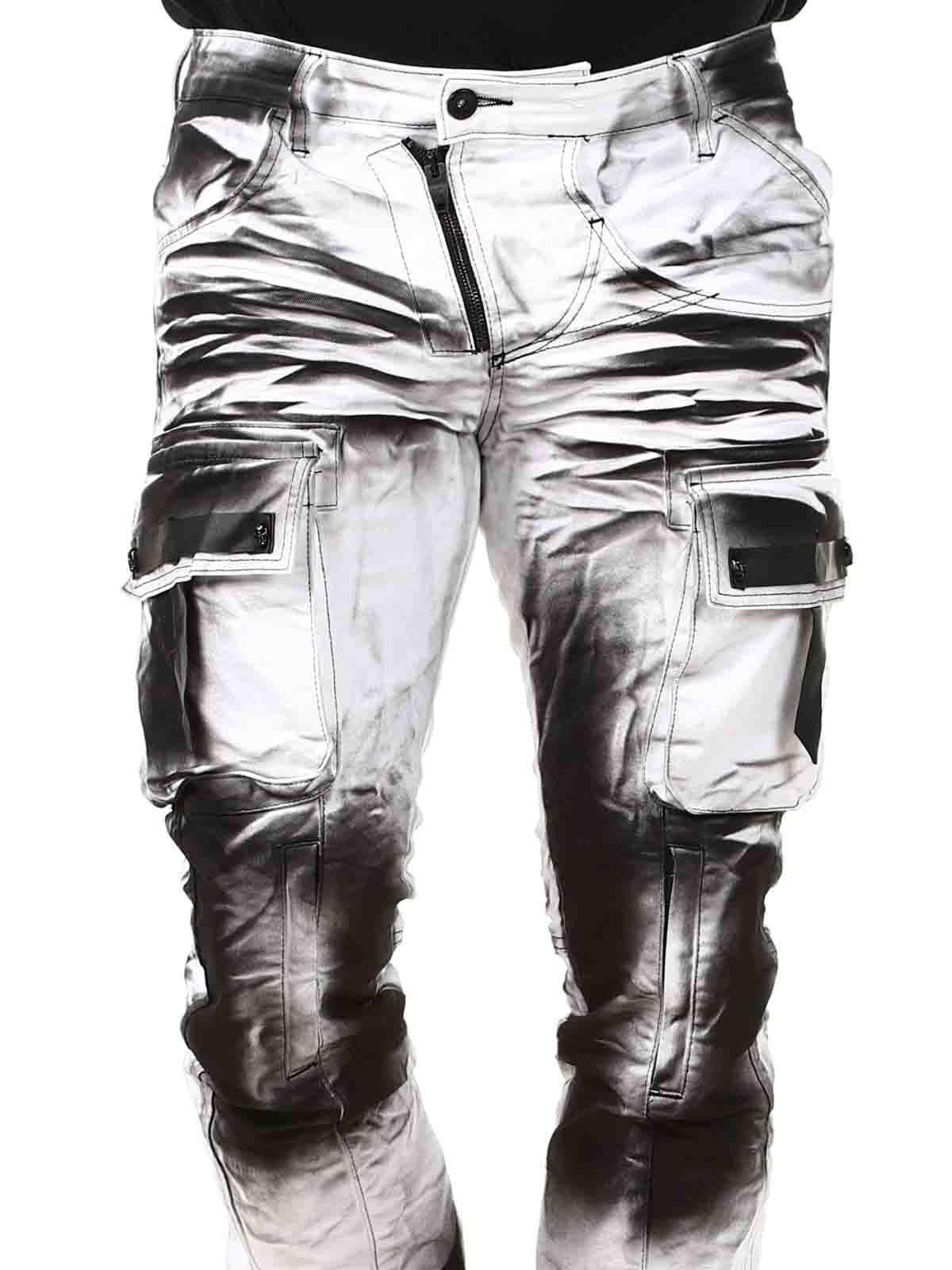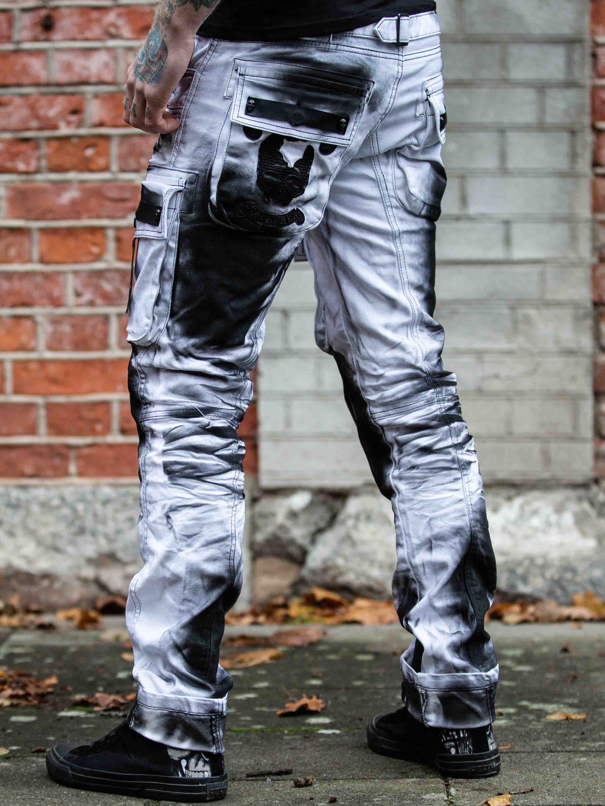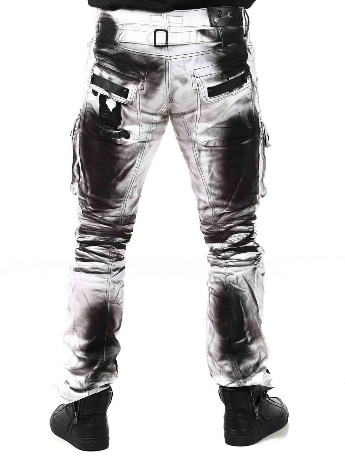 Unique jeans with multiple pockets and painted effects. Tough details with skull rivets, leather straps and zippers on the knees. The jeans close with a zipper fly and have belt loops at the waist.