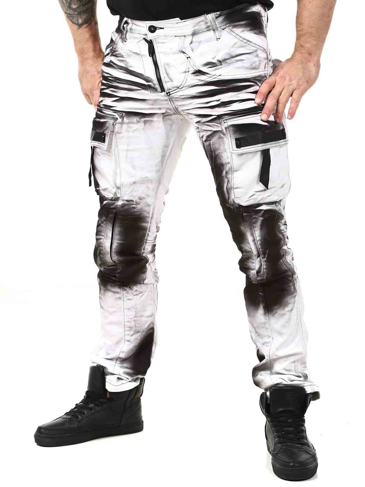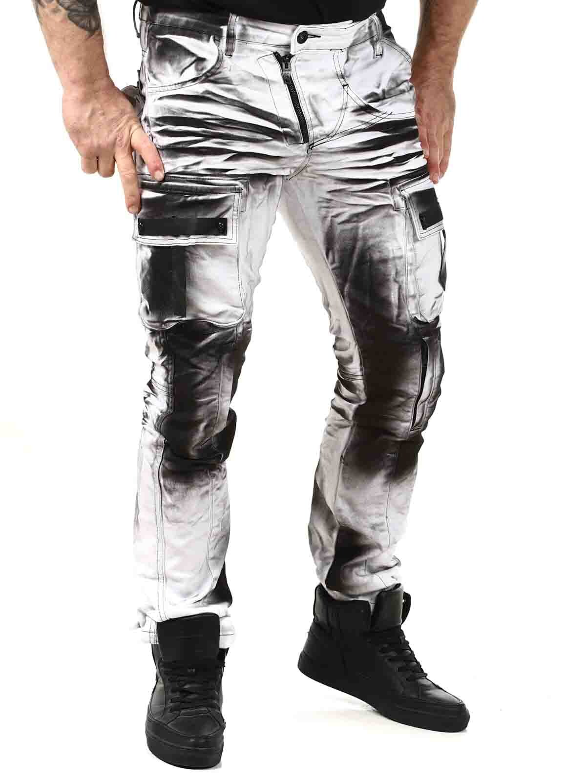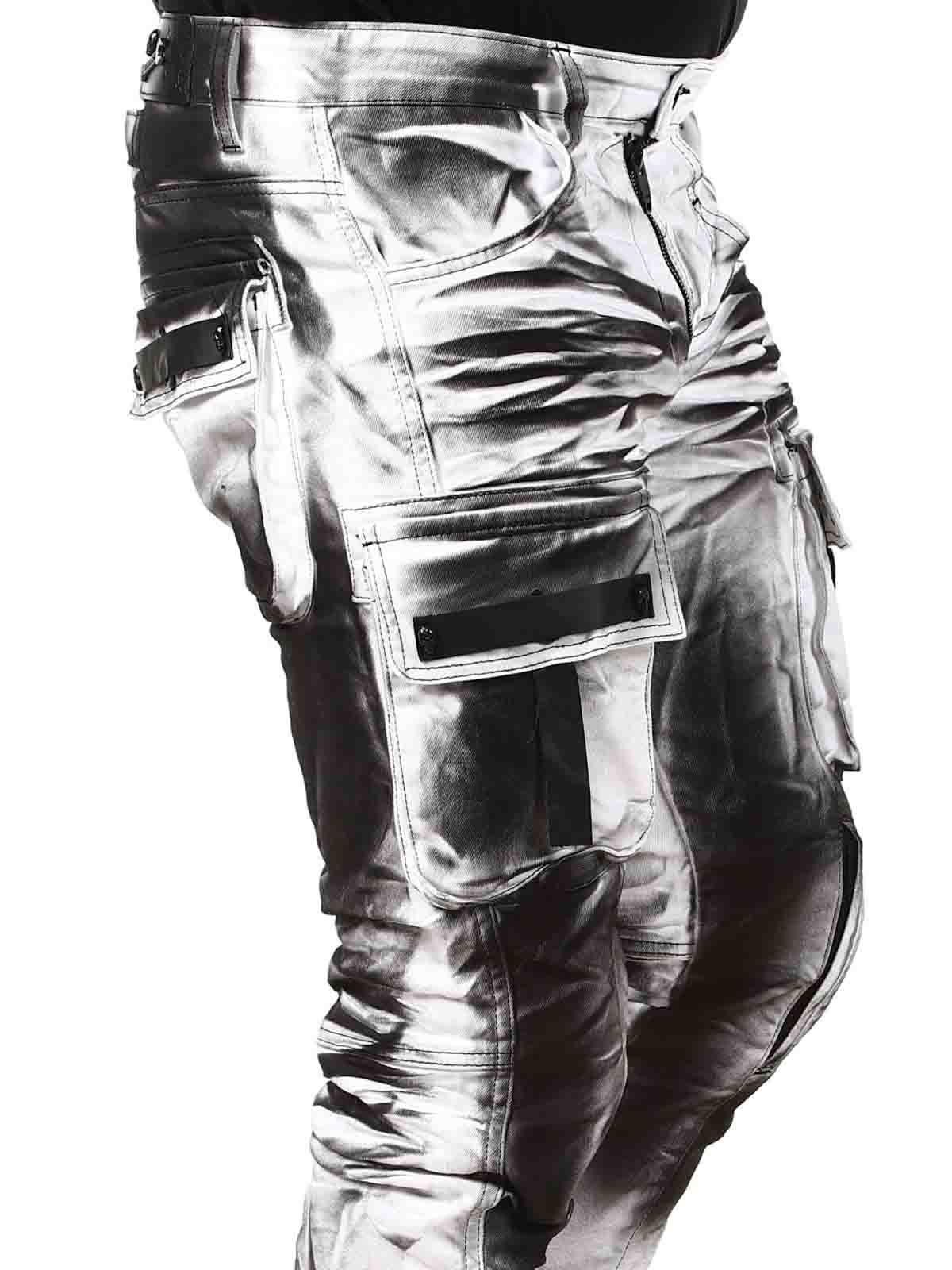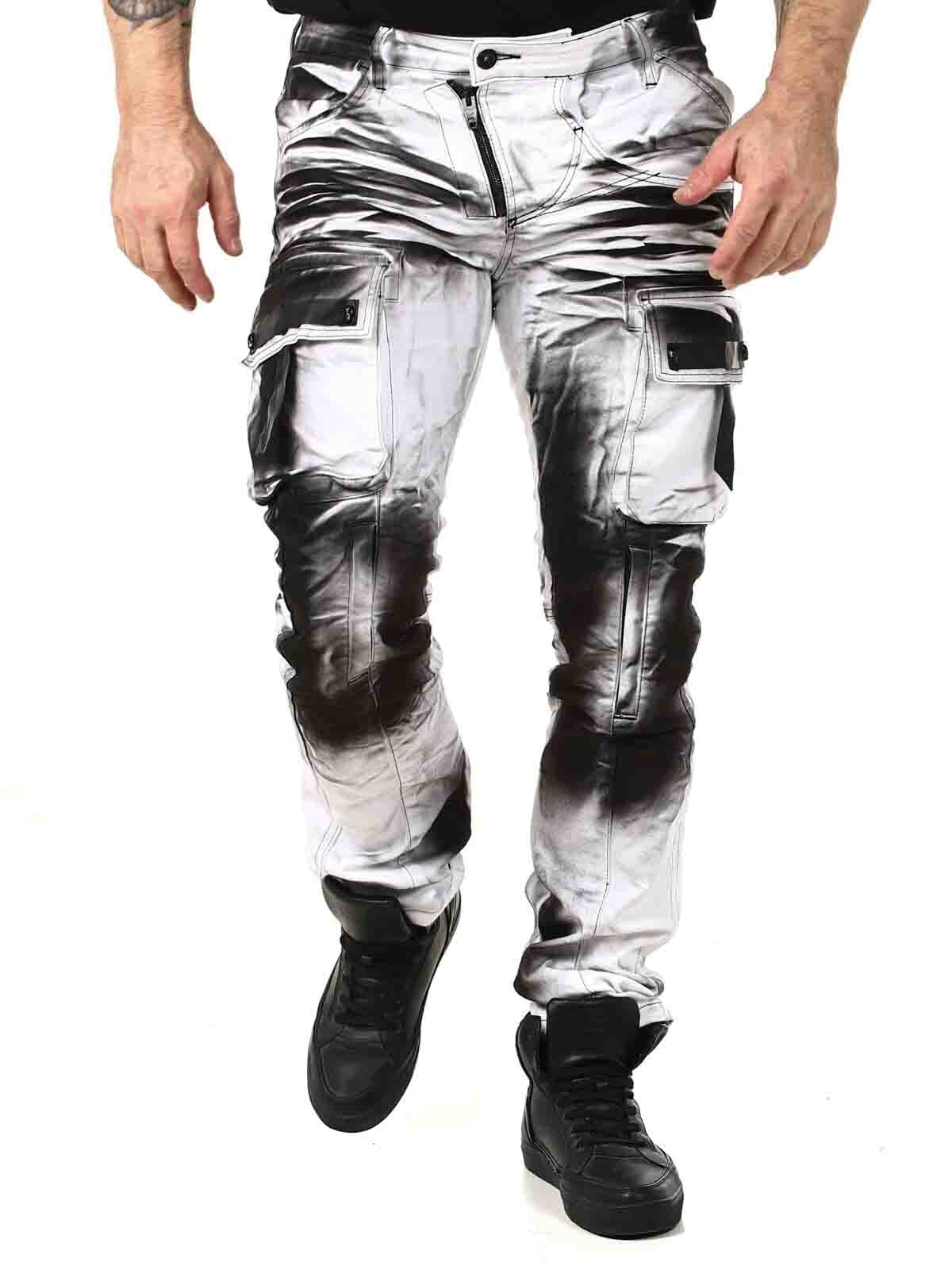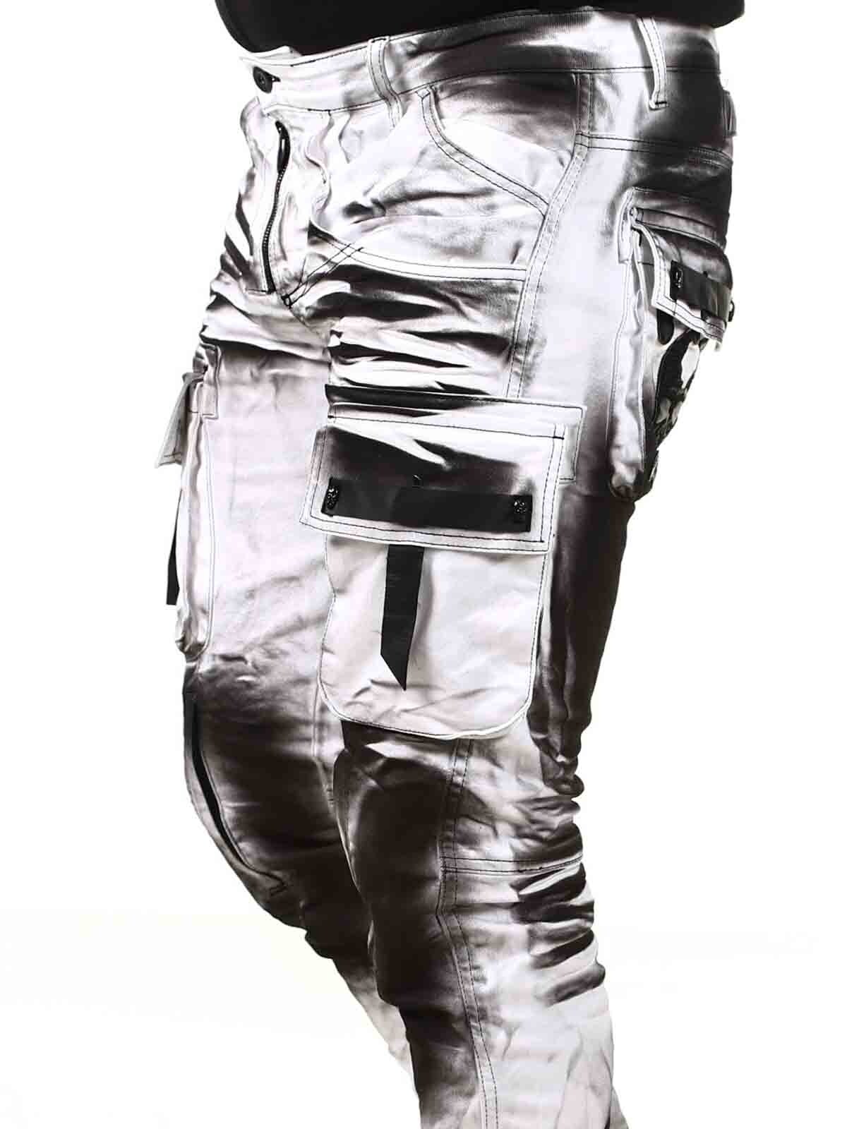 Unique jeans with multiple pockets and painted effects. Tough details with skull rivets, leather straps and zippers on the knees. The jeans close with a zipper fly and have belt loops at the waist.
