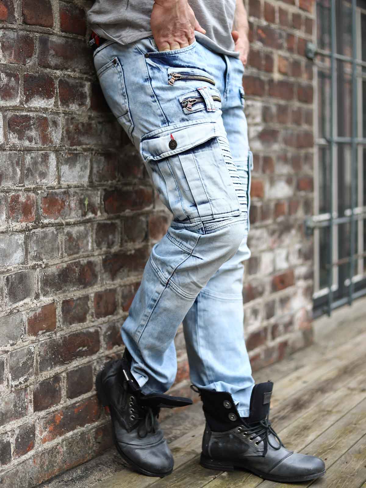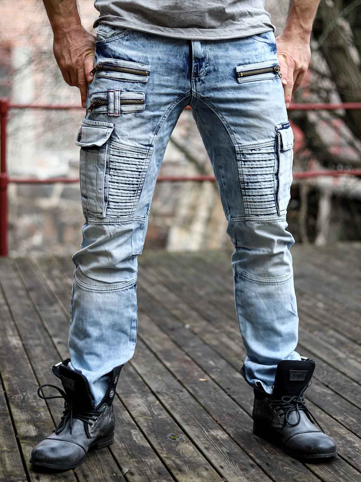 Tough jeans in light blue denim with a distressed look. Designed with prominent seams, zippers, and ribbed sections. They feature multiple pockets and a classic fit.