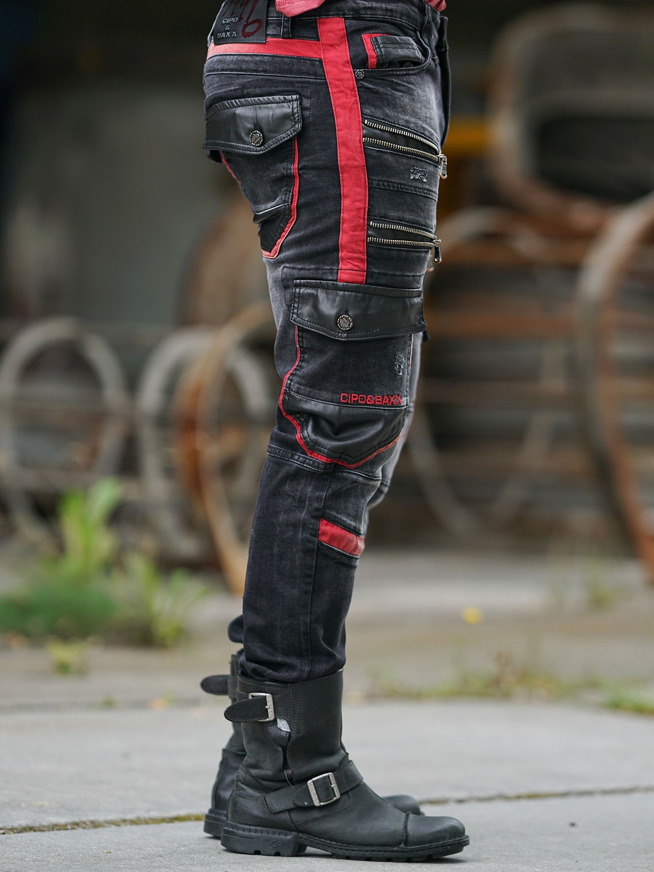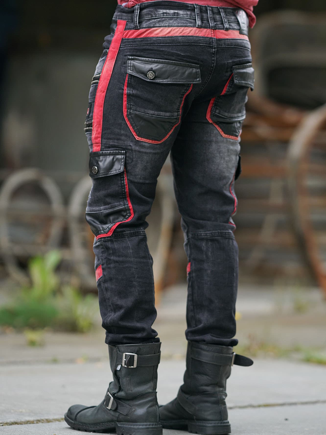 Black, slim jeans with raw details and stylish distressing. The material is stretchy, and the design includes four front pockets and two back pockets. Unique design with red contrasts, zippers, and black leather-like material.