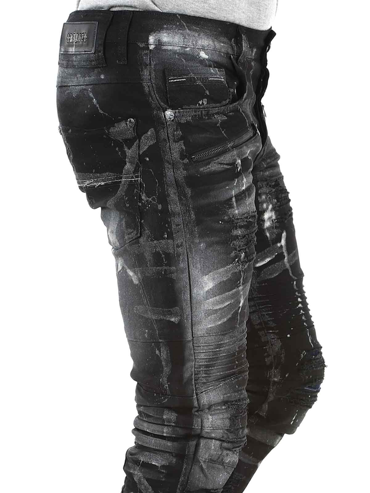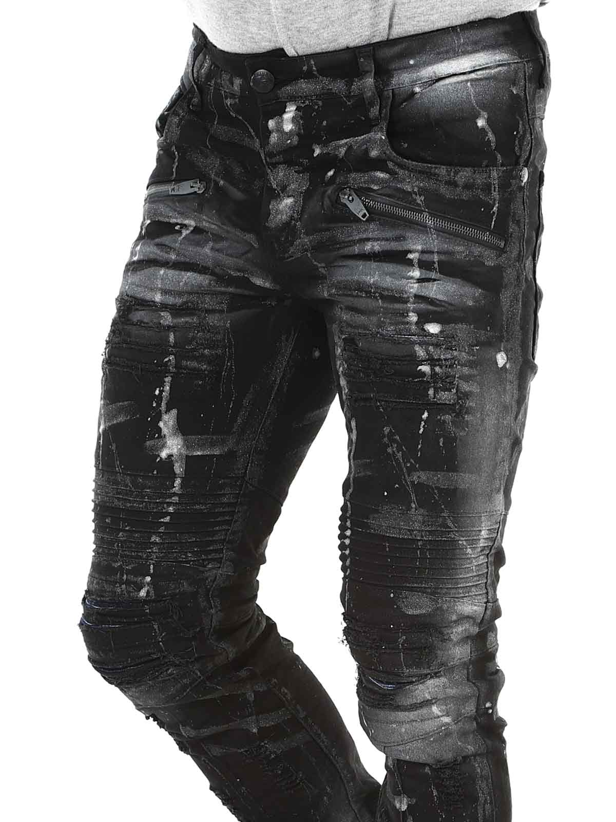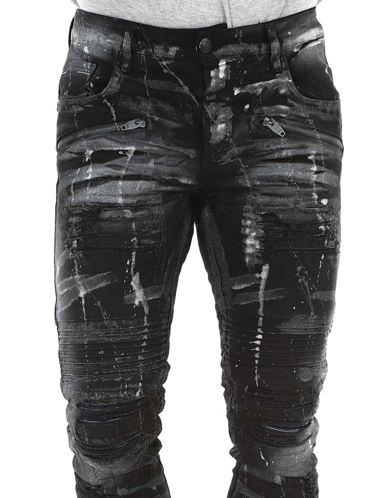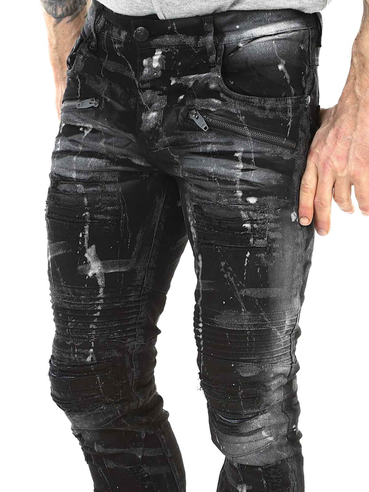 Pants in black denim with lighter and silver-toned sections. Designed with distressed details, zippers, and belt loops. Functional pockets and a classic fit with slightly tapered legs. Perfect for those who want to combine comfort with a tough and confident style.