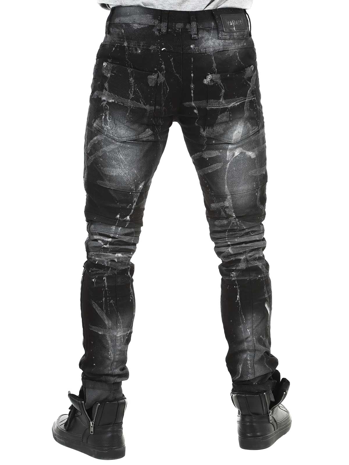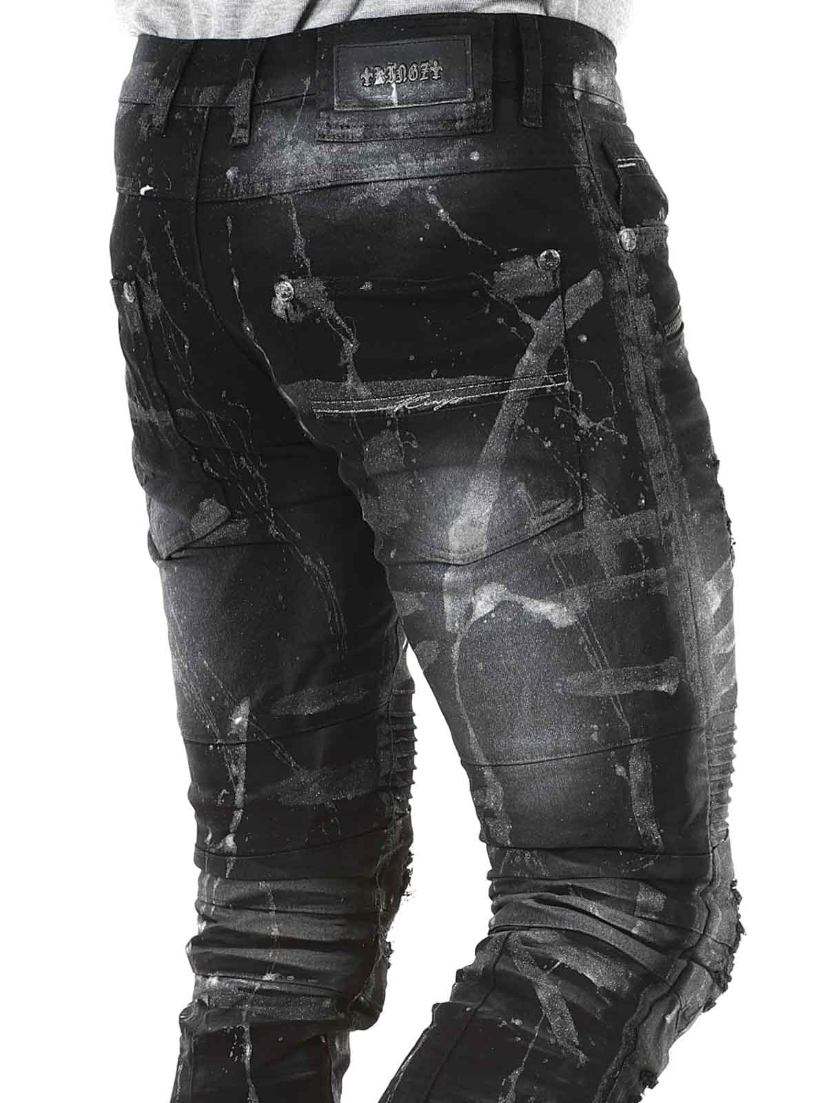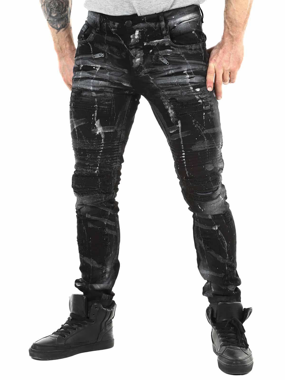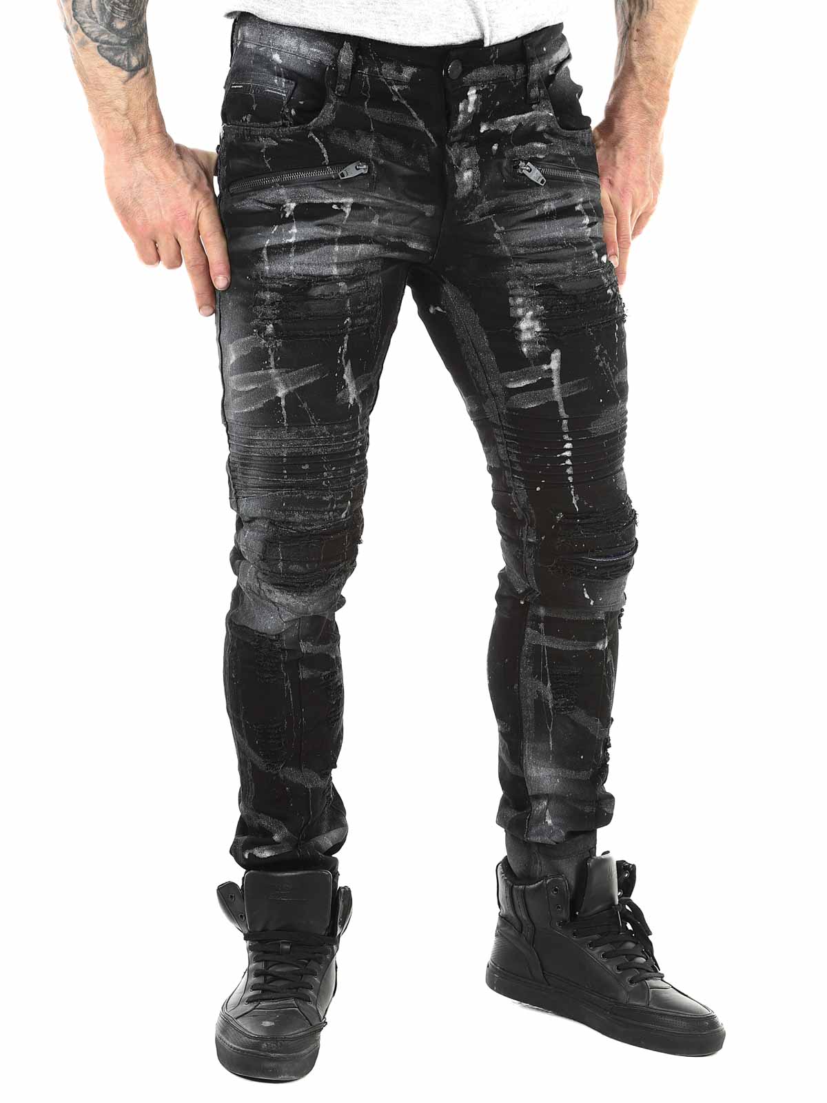 Pants in black denim with lighter and silver-toned sections. Designed with distressed details, zippers, and belt loops. Functional pockets and a classic fit with slightly tapered legs. Perfect for those who want to combine comfort with a tough and confident style.