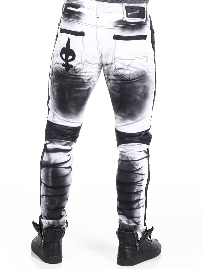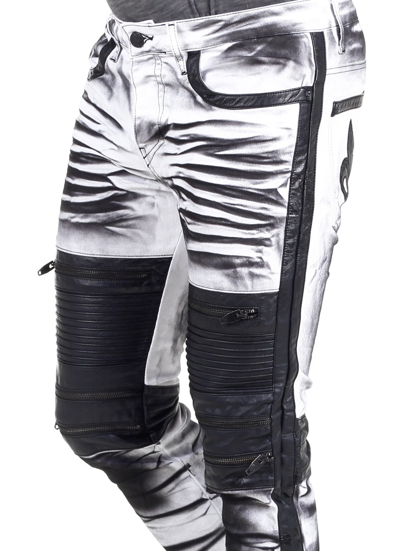 Stretchy coloured denim trousers with a raw design. Details include faux leather panels and zips. They have slightly slim legs and lots of pockets, one of which has an embroidered print on the back pocket.