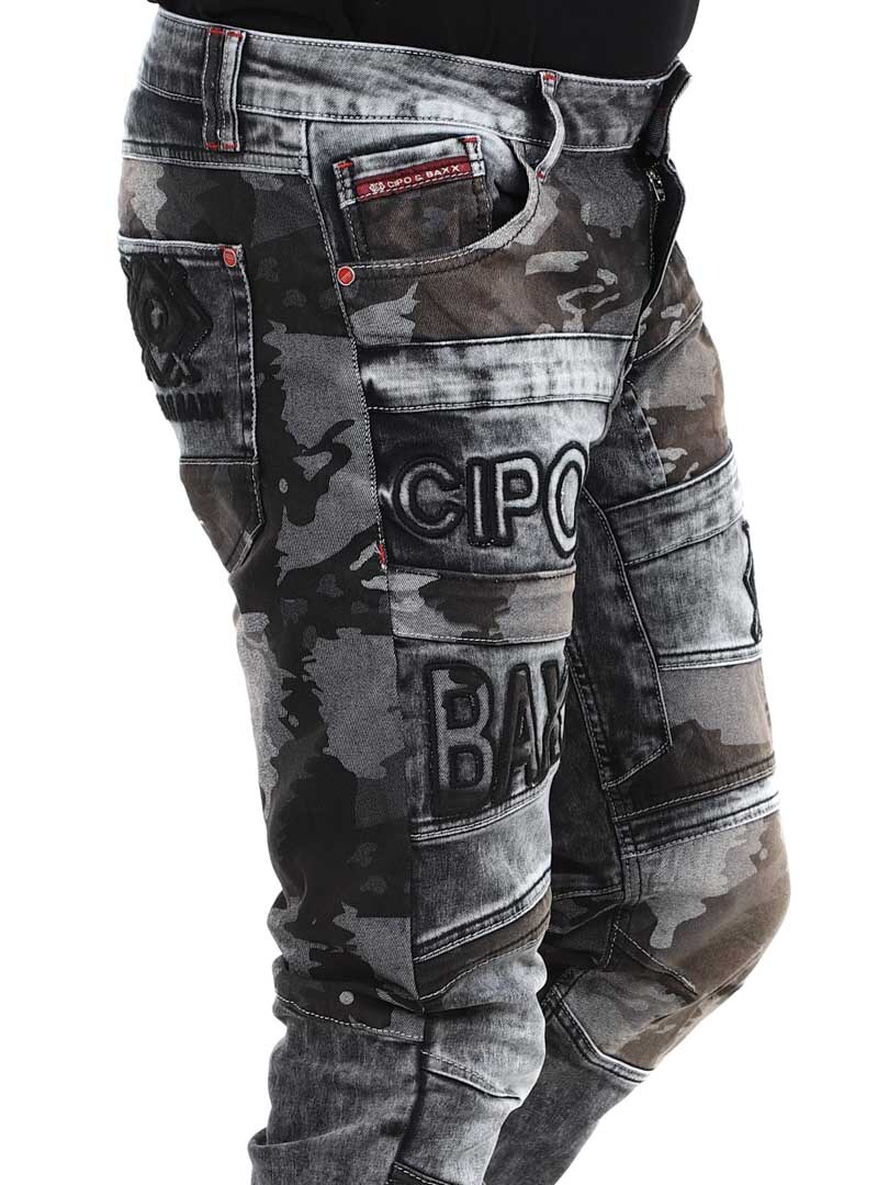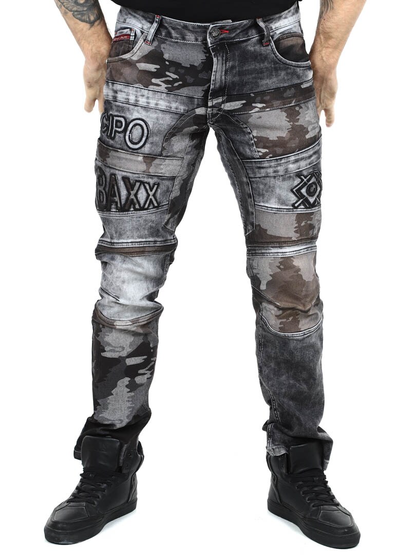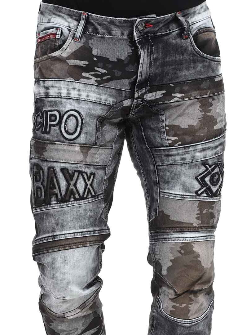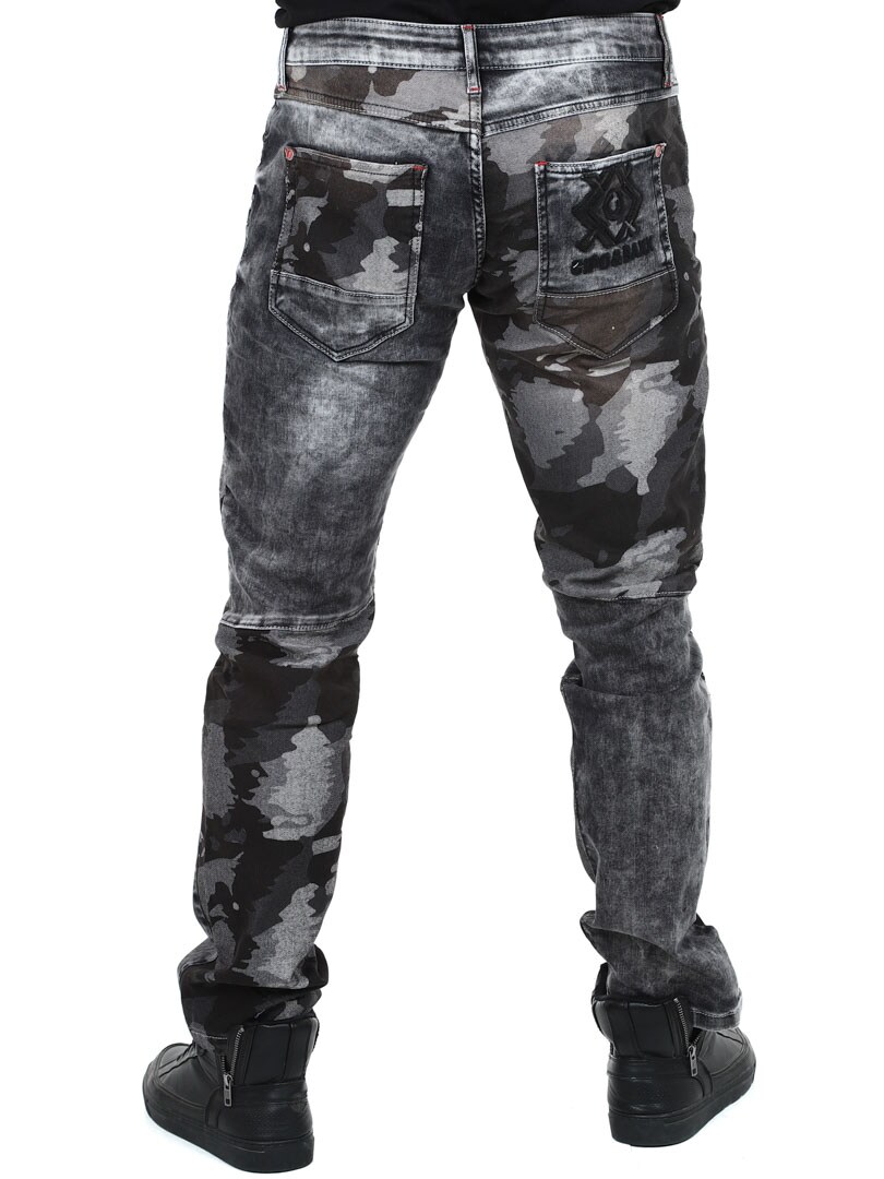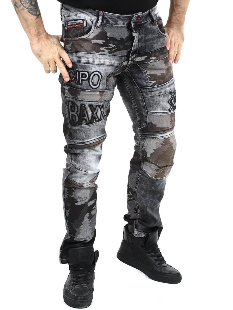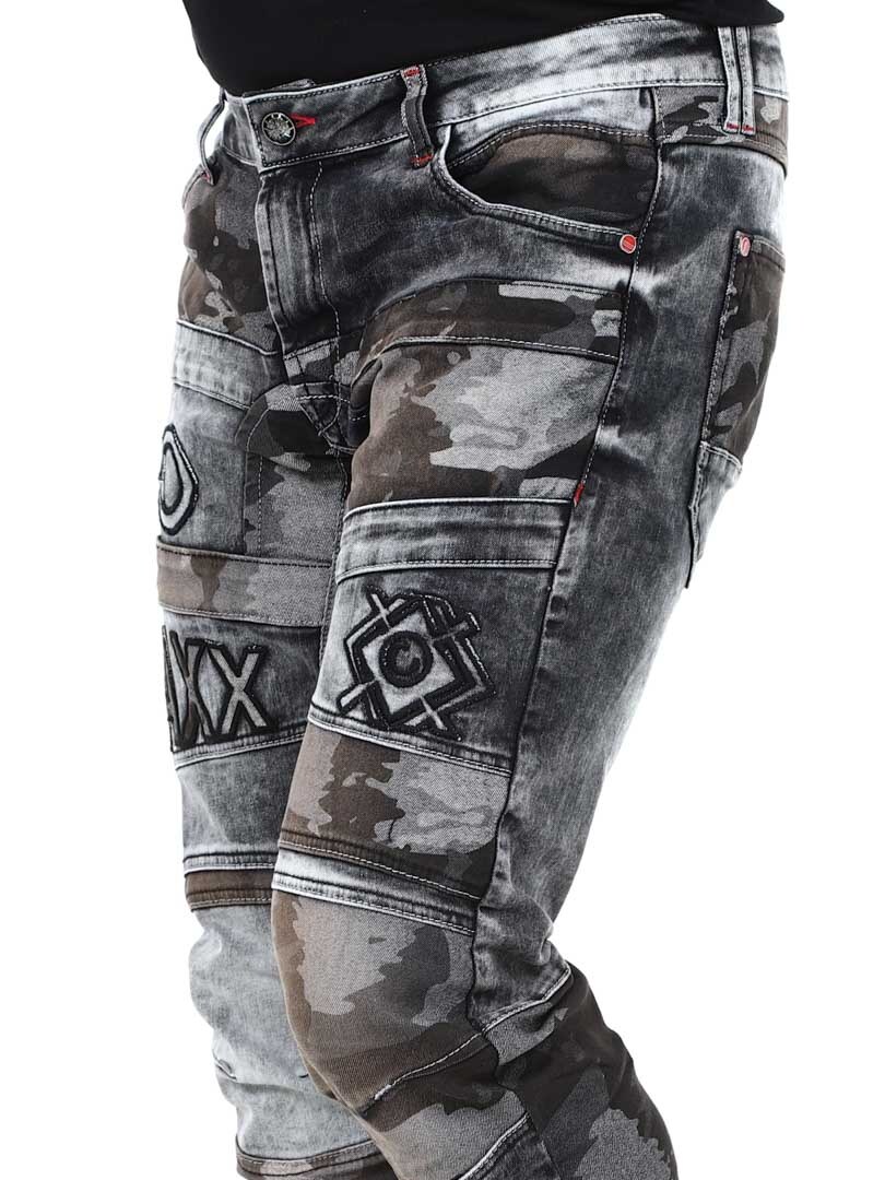 Stonewashed jeans with camouflage detailing. 5-pocket style with stretch and a classic fit. Tailored logo on front and back.