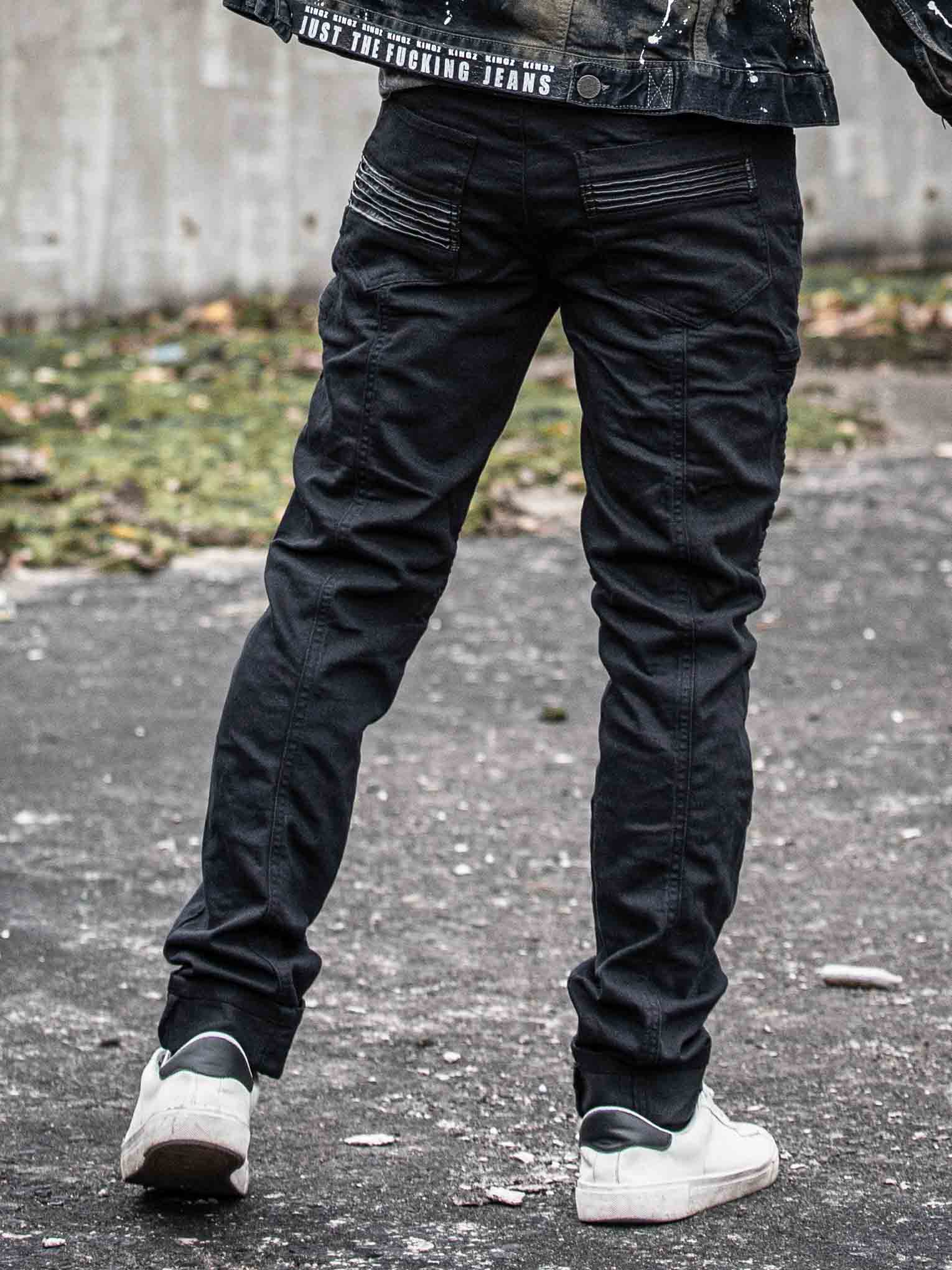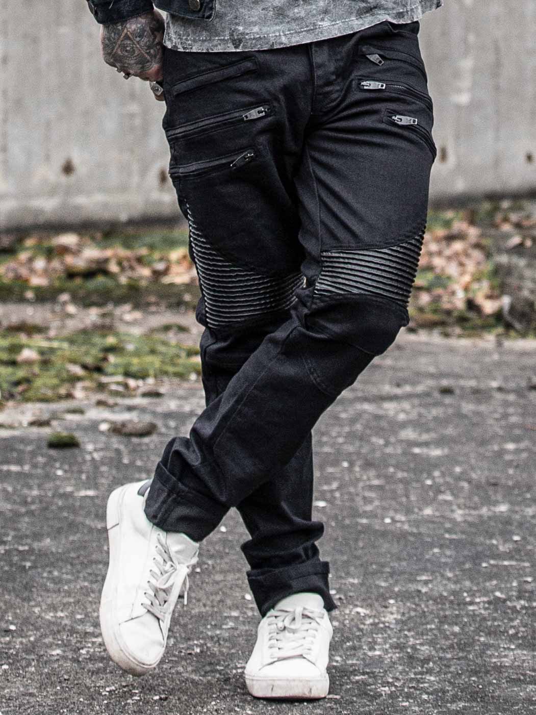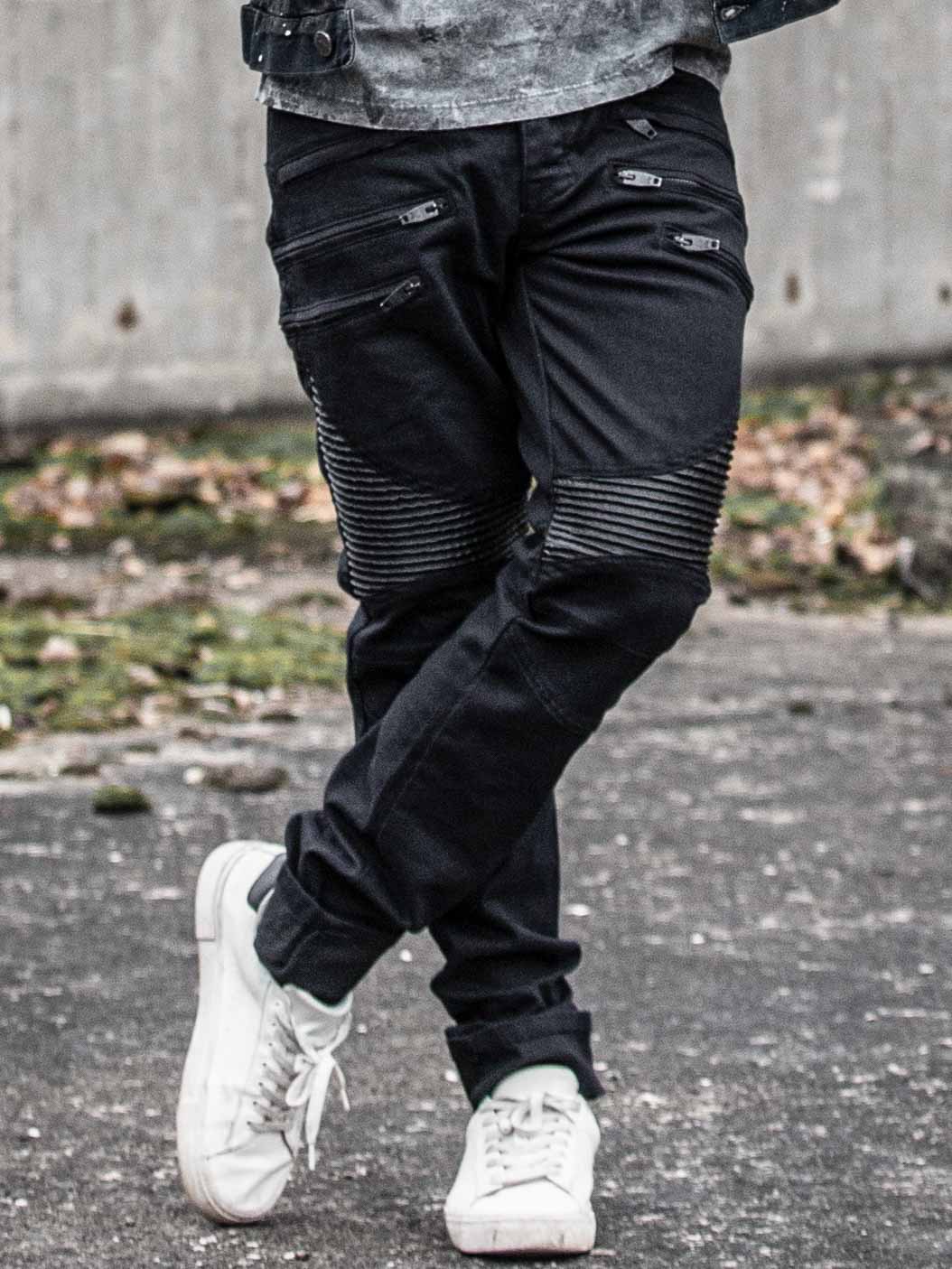Unique jeans with faux leather on the thighs and back pockets. Detailed with tough zips on the front of the thighs. Stretch model with two front pockets, two back pockets and button fly.