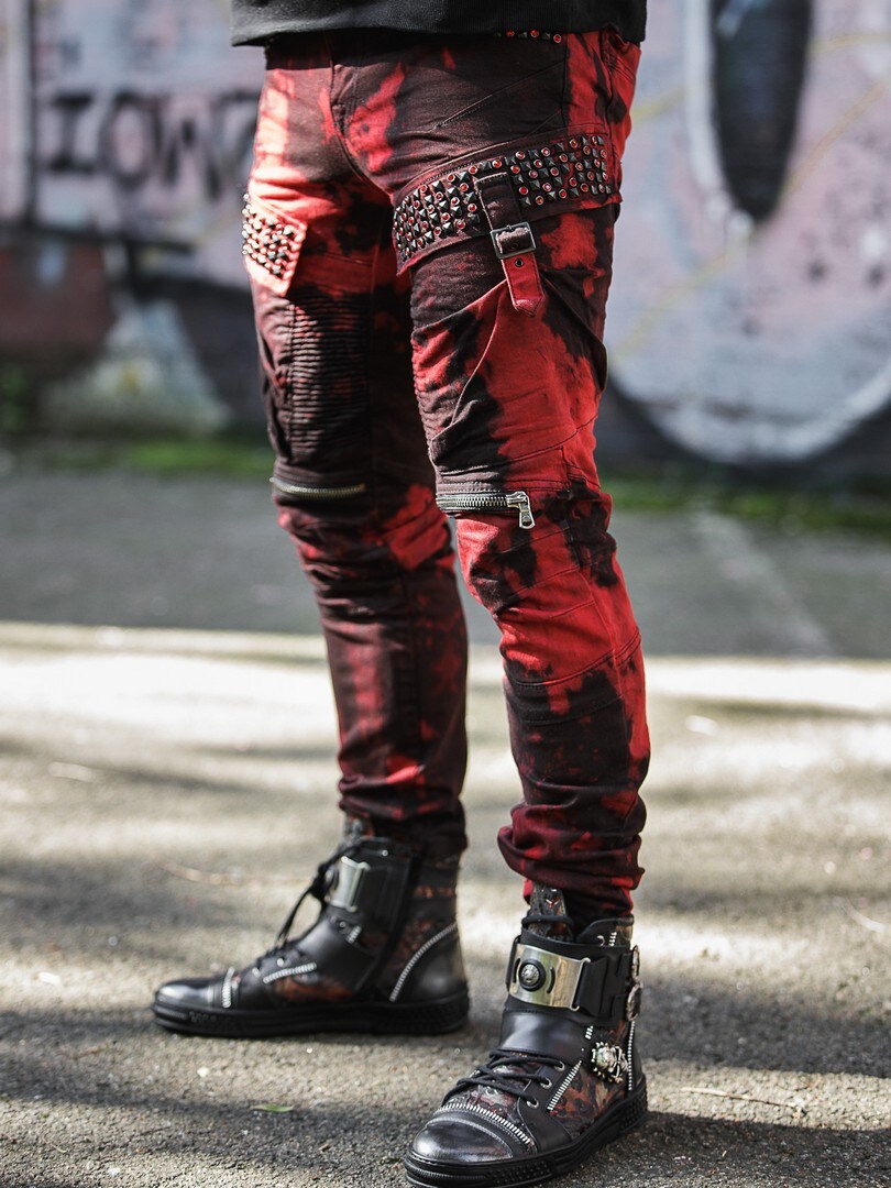 Army-inspired pants topped with edgy details like studs, stones, and zippers. Functional pockets on the back, front, and legs.