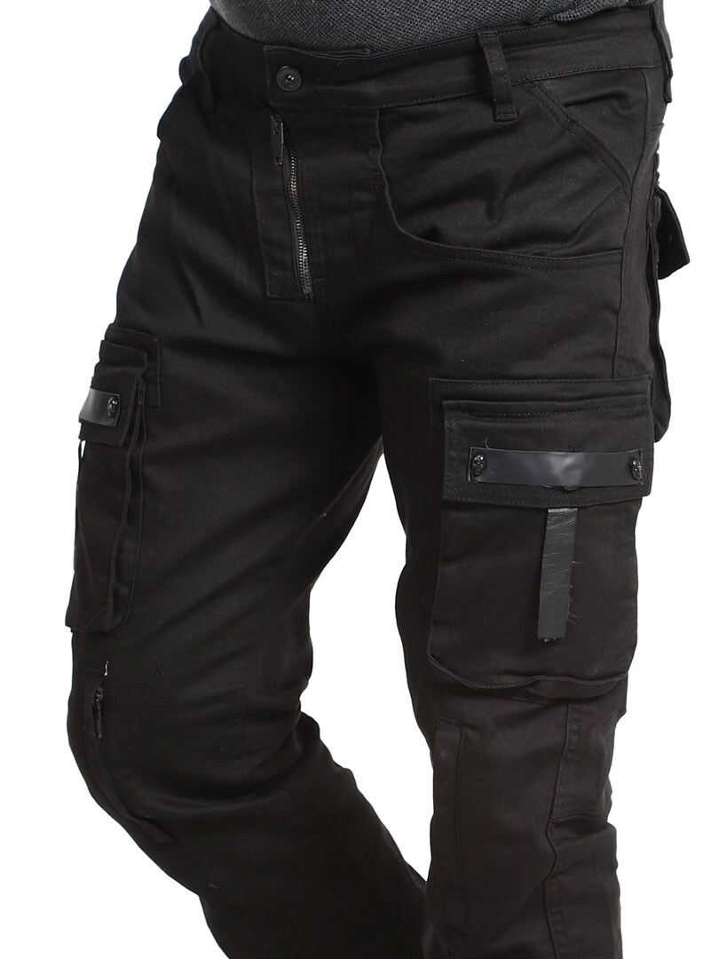 Unique jeans with multiple pockets. Cool details with skull studs, leather straps and zippers at the knees. The jeans close with a zipper fly and have belt loops at the waist.