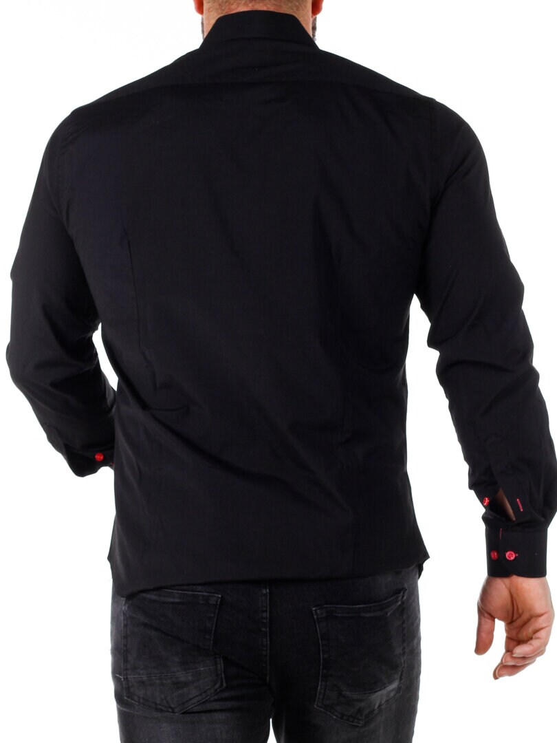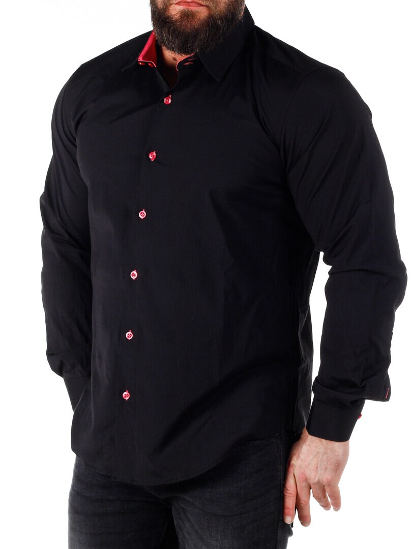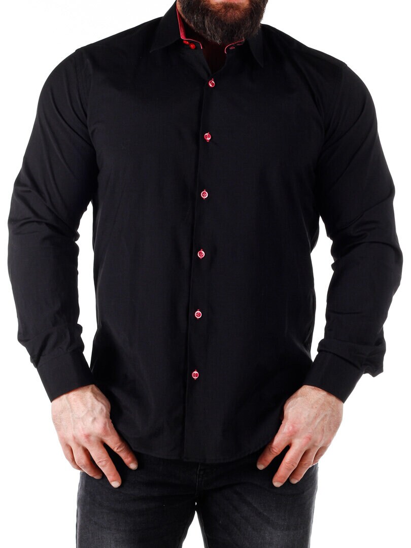 A comfortable cotton shirt with a slim fit and a slight stretch. Features a black base with buttons, and contrasting color on the inside of the collar and cuffs. The shirt has a slimmer cut with a rounded hem and a reinforced collar to maintain its shape. Available in more colors!