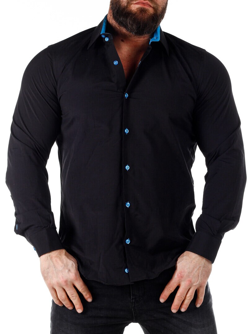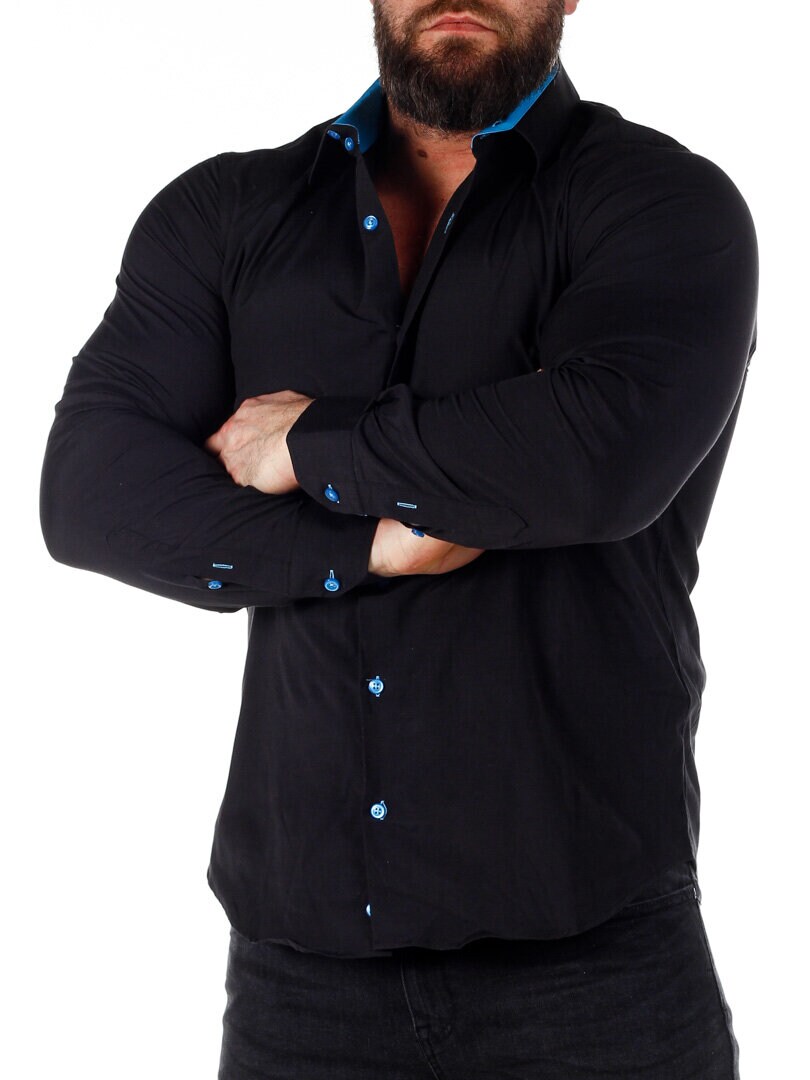 A comfortable cotton shirt with a slim fit and a bit of stretch. Features a black base with buttons, and contrasting color on the inside of the collar and cuffs. The shirt has a slimmer cut with a rounded hem and a reinforced collar to keep its shape. Available in additional colors!