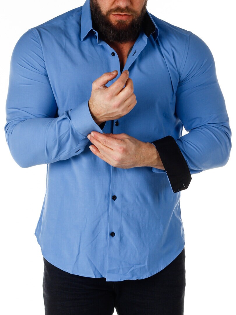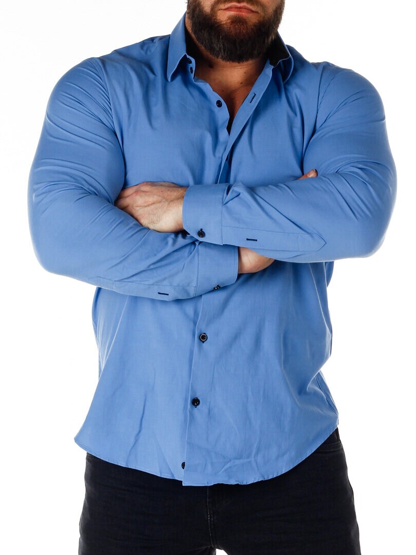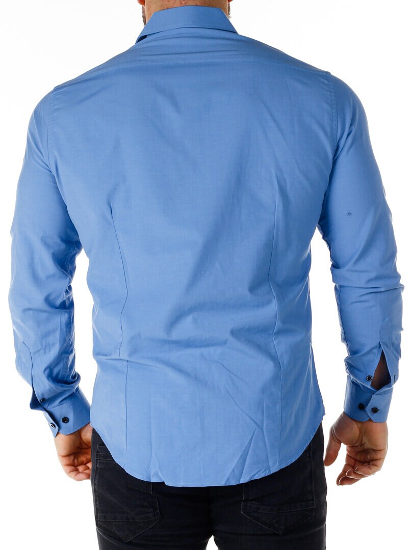 Cotton shirt in a comfortable, slightly stretchy model. Blue base with buttons, contrast color on the inside of the collar and cuffs. Slim fit with a rounded hem and a reinforced collar that retains its shape. Available in more colors!