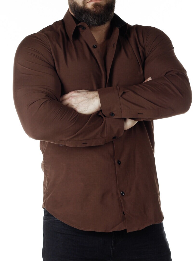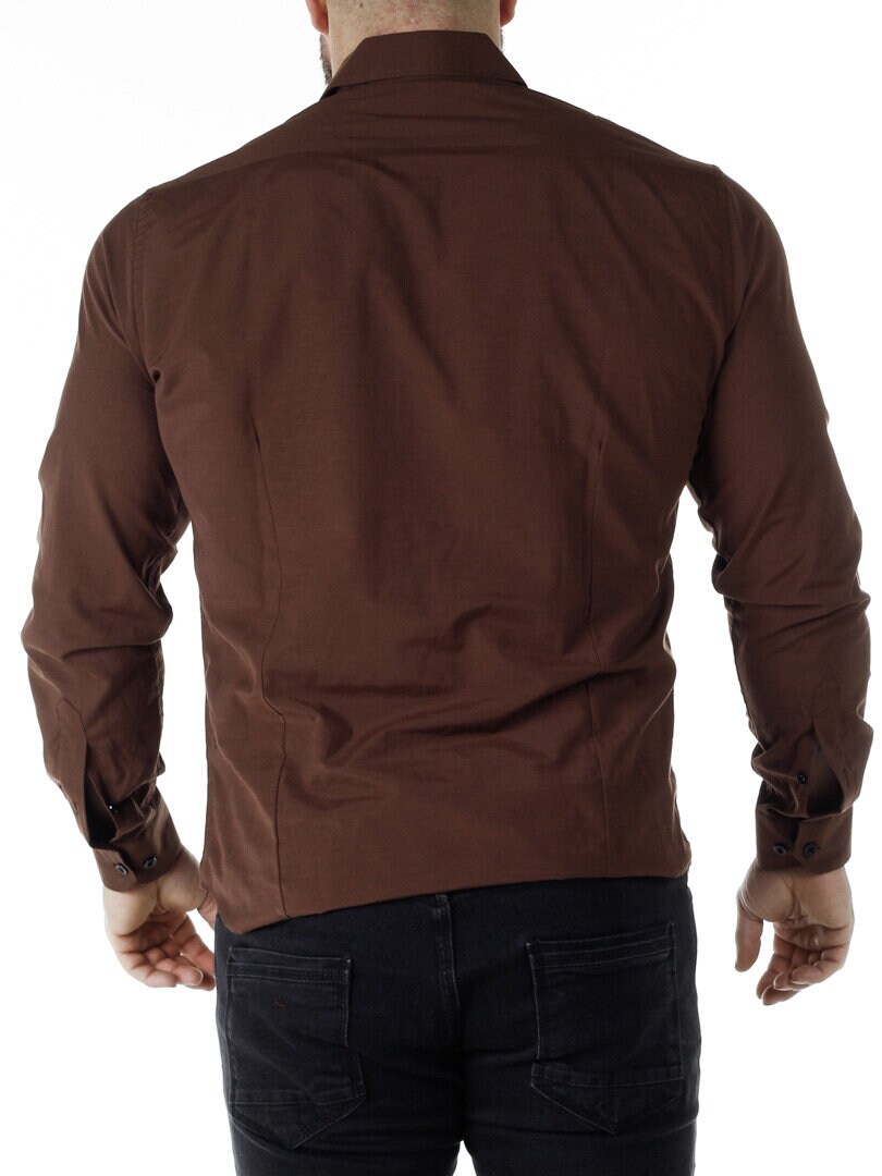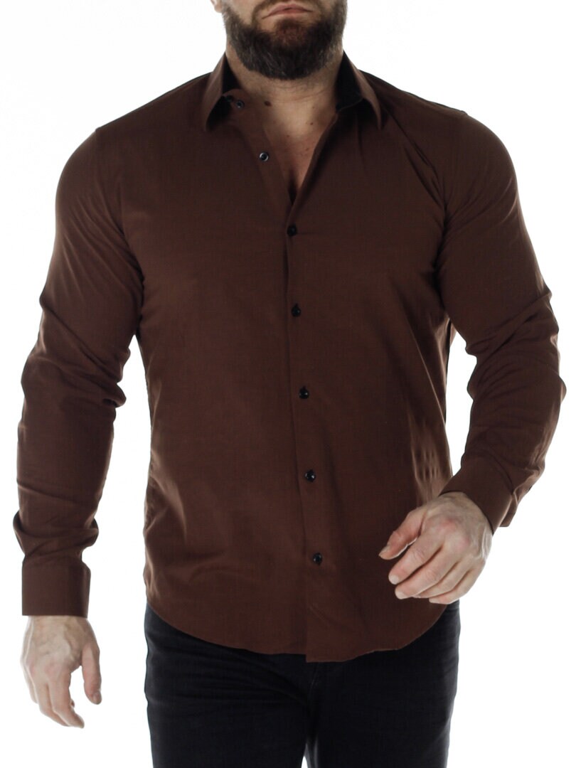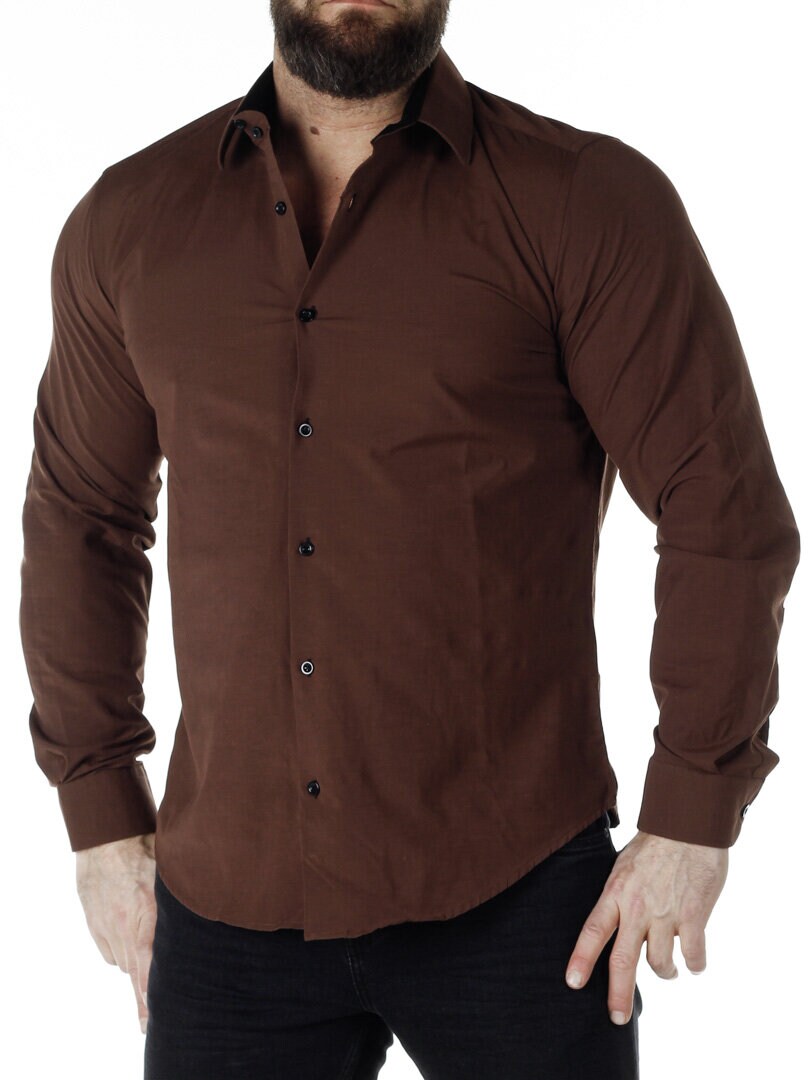 Cotton shirt in a comfortable, slightly stretchy model. Brown base with buttons, contrast color on the inside of the collar and cuffs. Slim fit with a rounded hem and a reinforced collar that retains its shape. Available in more colors!