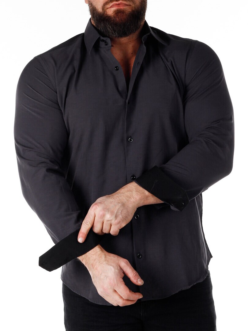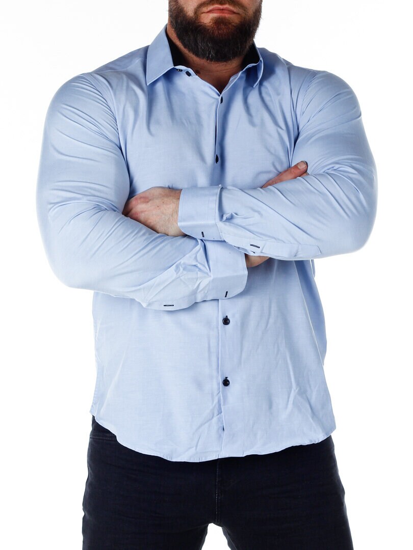 Cotton shirt in a comfortable, slightly stretchy model. Light blue base with buttons, contrast color on the inside of the collar and cuffs. Slim fit with a rounded hem and a reinforced collar that retains its shape. Available in more colors!