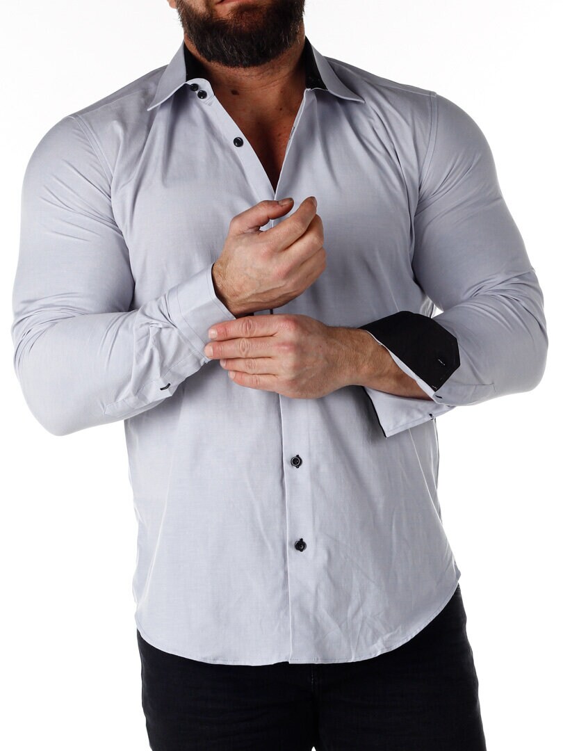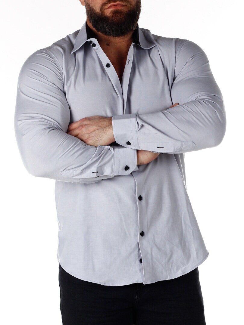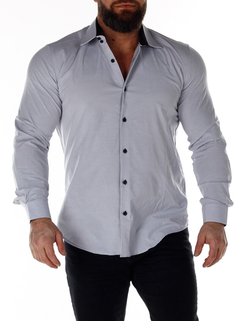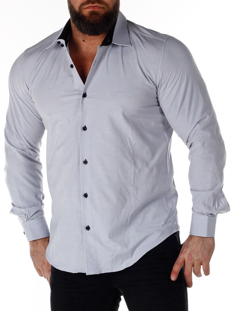 Cotton shirt in a comfortable, slightly stretchy model. Light gray base with buttons, contrast color on the inside of the collar and cuffs. Slim fit with a rounded hem and a reinforced collar that retains its shape. Available in more colors!