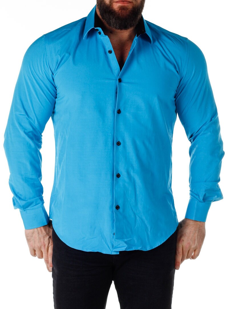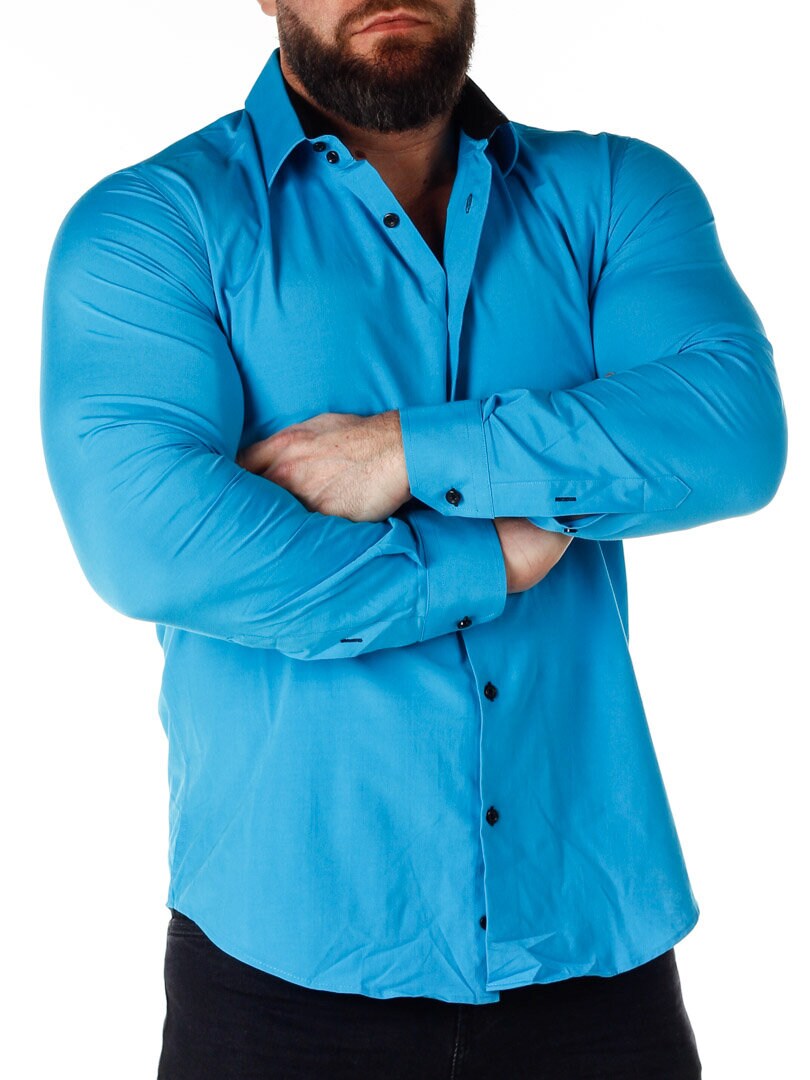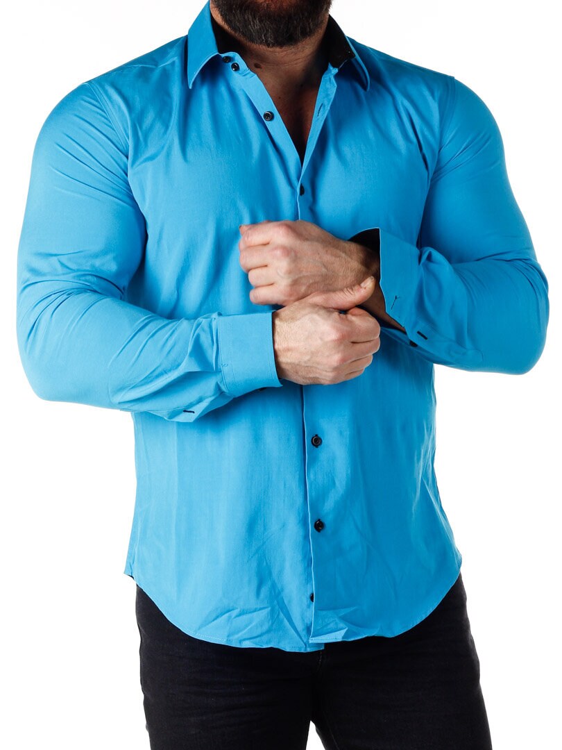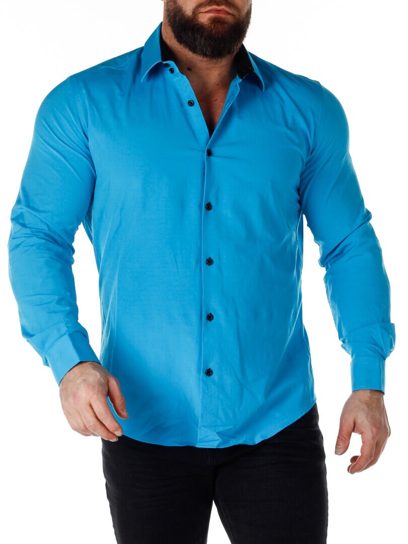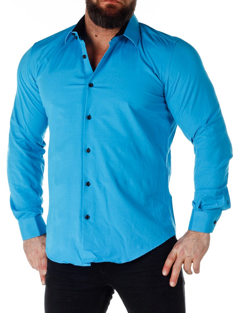 A comfortable cotton shirt with a slim fit and slight stretch. Features a turquoise base with buttons, and contrasting color on the inside of the collar and cuffs. The shirt has a slimmer cut with a rounded hem and a reinforced collar to maintain its shape. Available in additional colors!