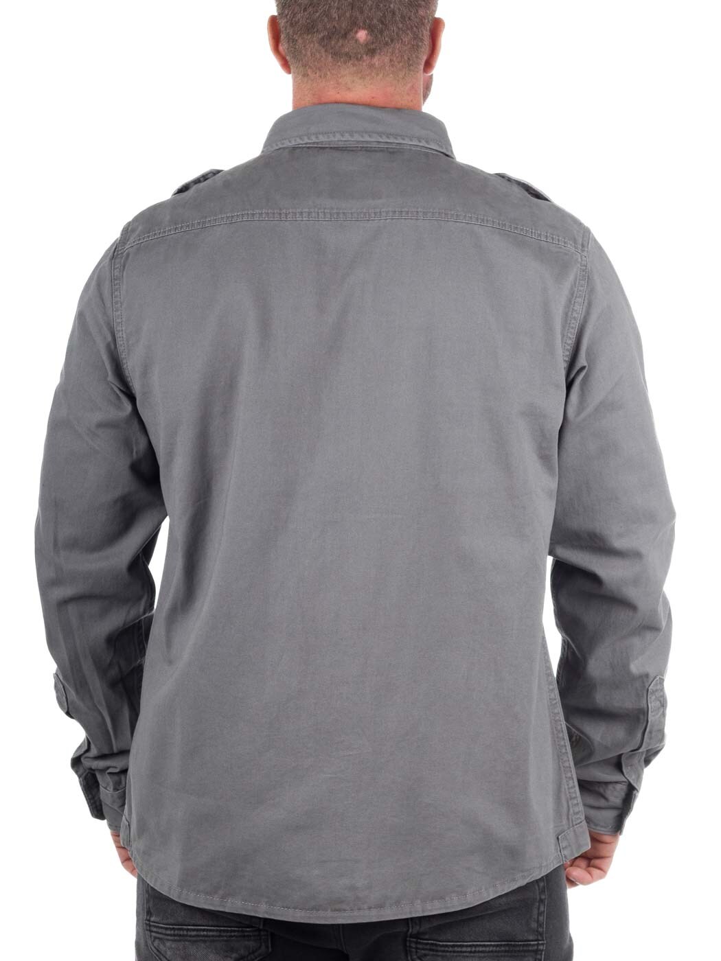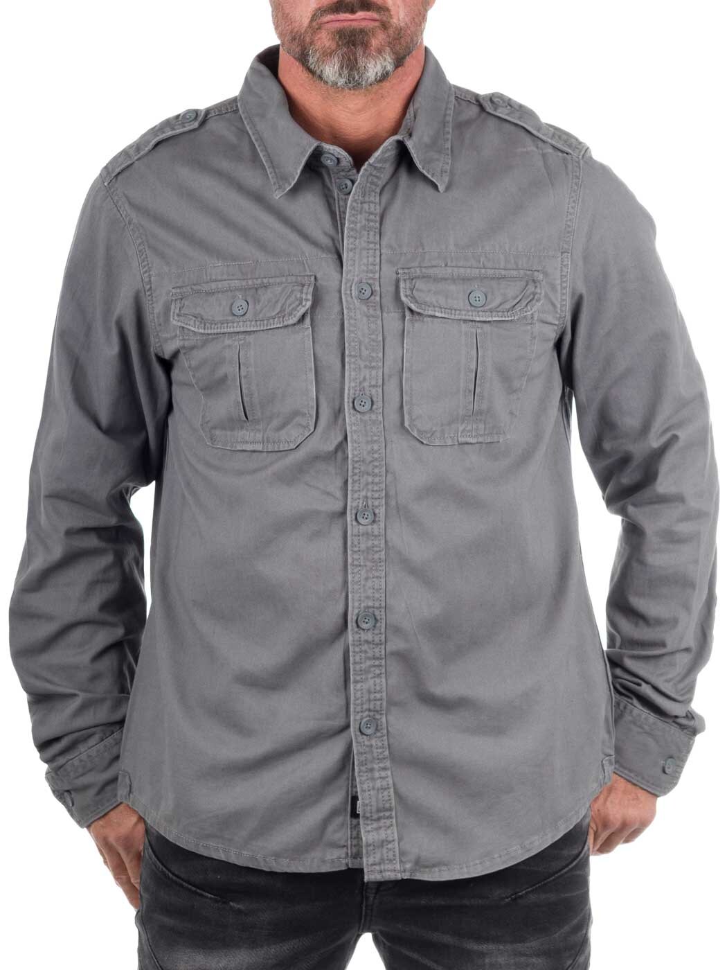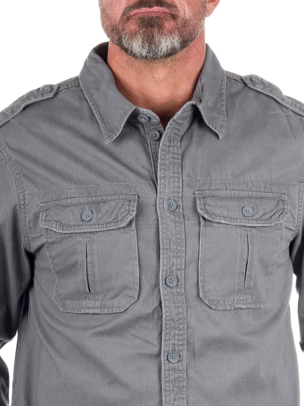 Rugged shirt made of sturdy cotton with shoulder straps, collar, and buttoned chest pockets. Detailed with strong seams and a black fabric patch with logo at the hem.