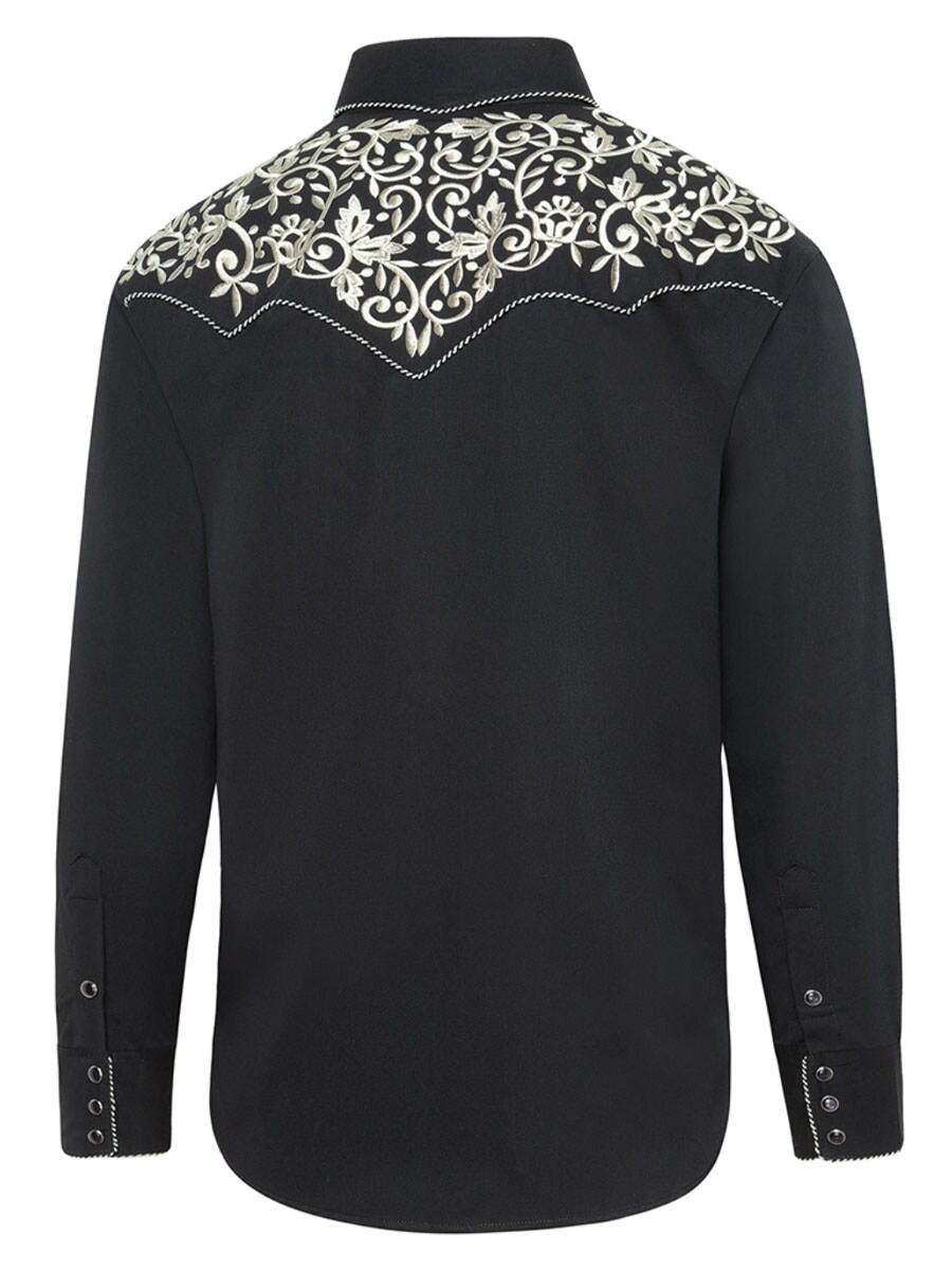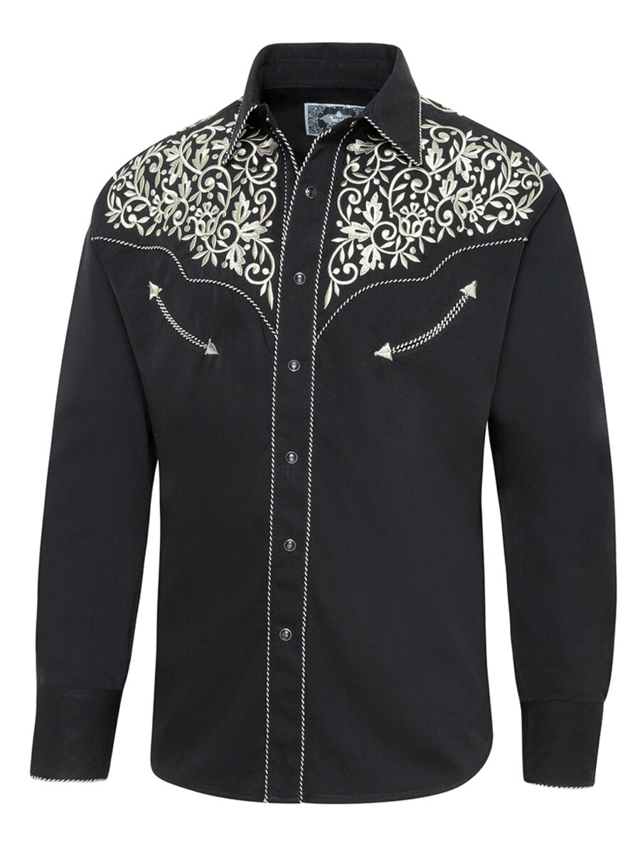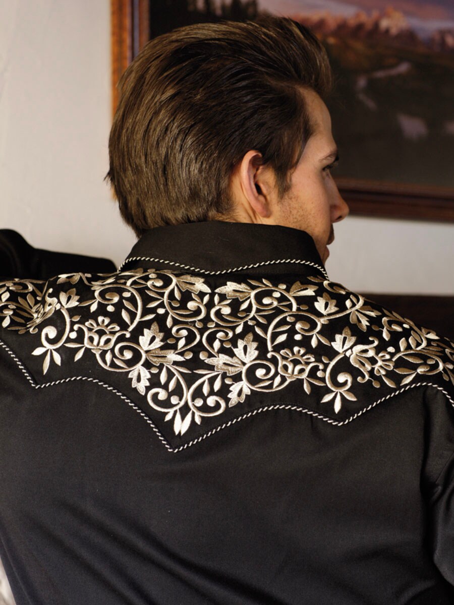 A black western shirt that combines classic cowboy design with elegant details and high comfort. The shirt is decorated with beautiful and detailed embroidery on both the chest and the back, giving it a unique and eye-catching look. The two-tone decorative piping enhances the western feel and creates a stylish contrast in the design. The blend of polyester and viscose makes the garment both durable and comfortable to wear.