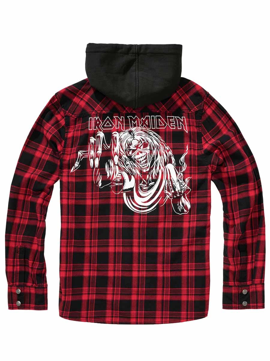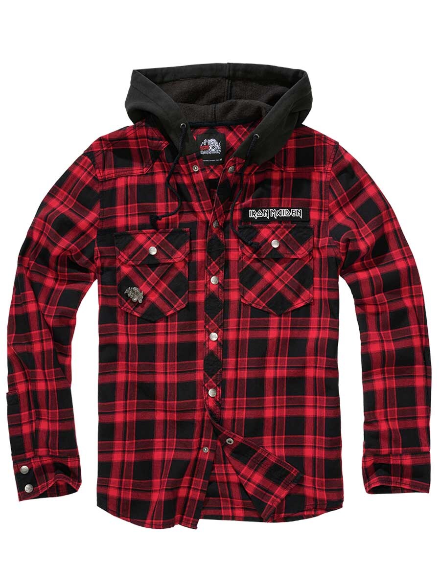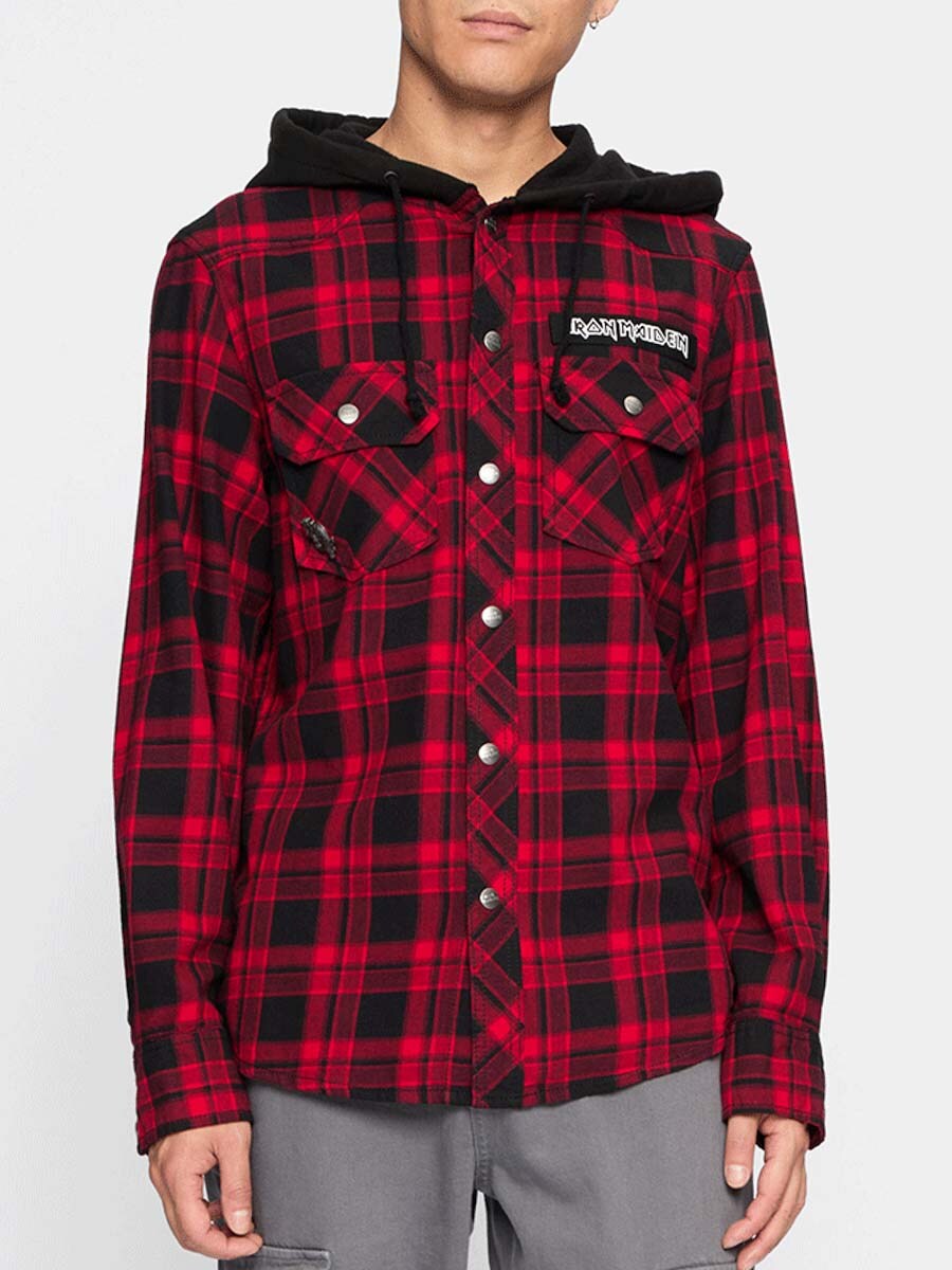 The combination of a classic overshirt and hoodie creates a unique, rock-inspired look. Features logo buttons, an Iron Maiden patch on the front, a large Iron Maiden print on the back, and a removable metal pin. Includes a roomy hood, adjustable cuffs, and button closure.
