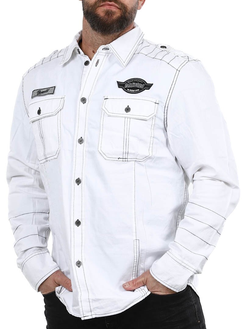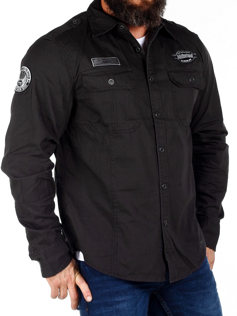 Retro-inspired shirt in a straight model with two chest pockets that close with buttons. Detailed with fabric patches on the sleeve and chest and it has a rounded waistband at the bottom.