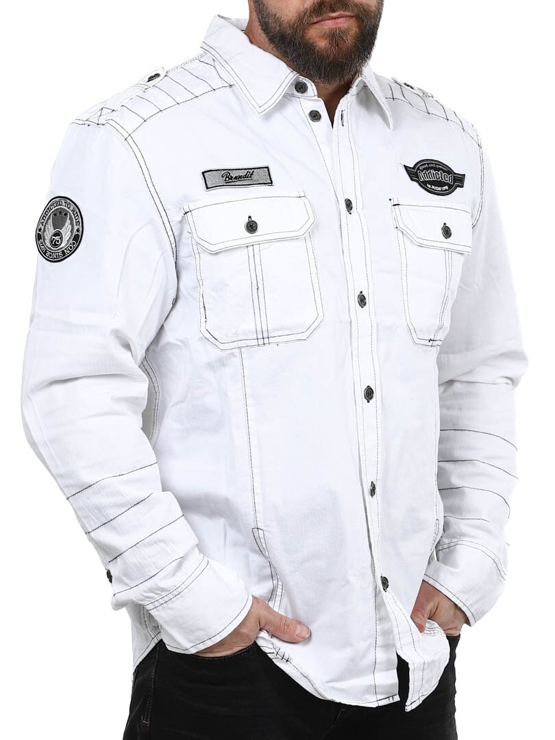 Retro-inspired shirt in a straight model with two chest pockets that close with buttons. Detailed with fabric patches on the sleeve and chest and it has a rounded waistband at the bottom.
