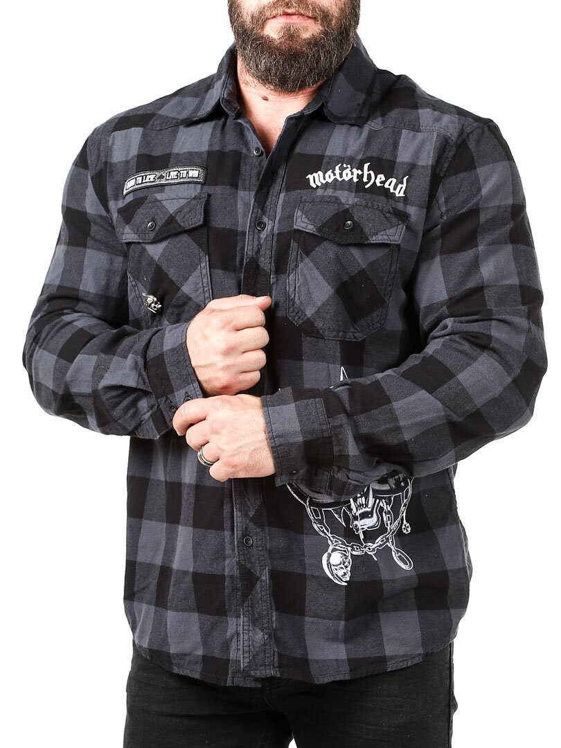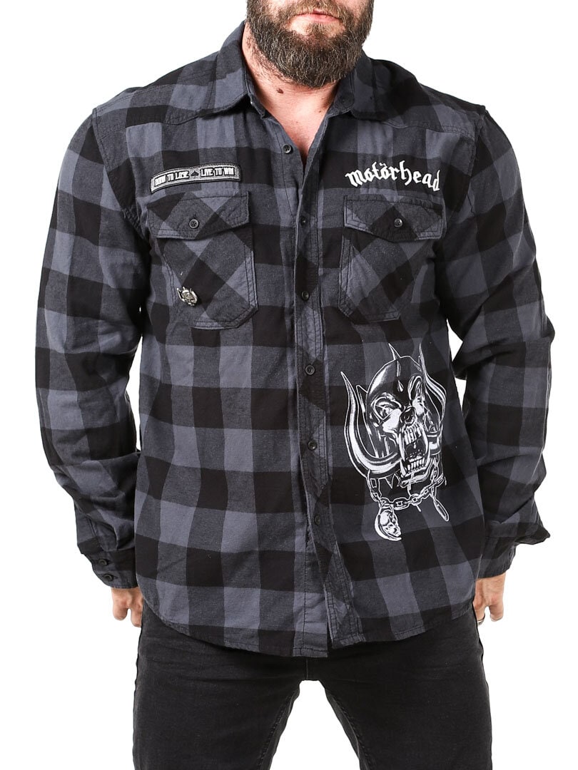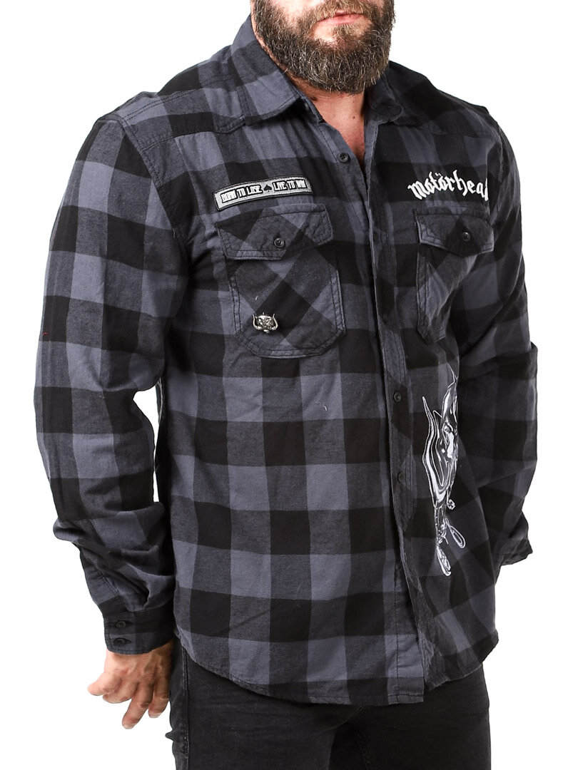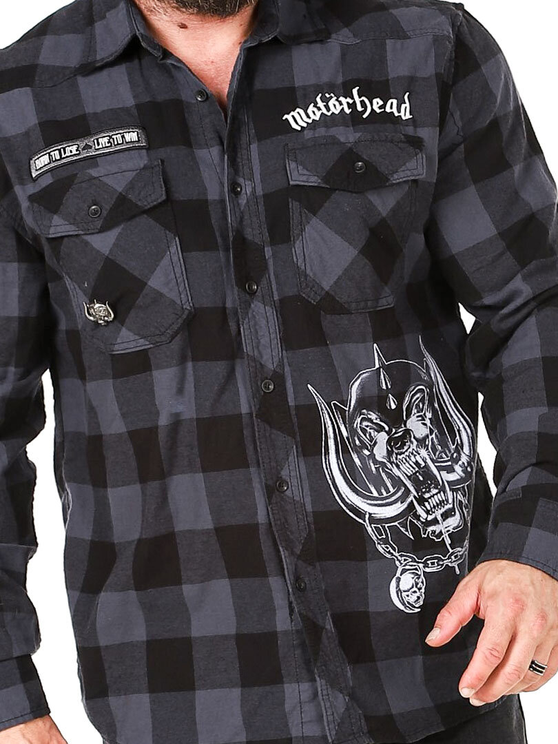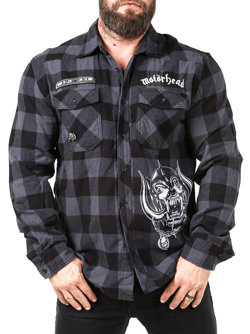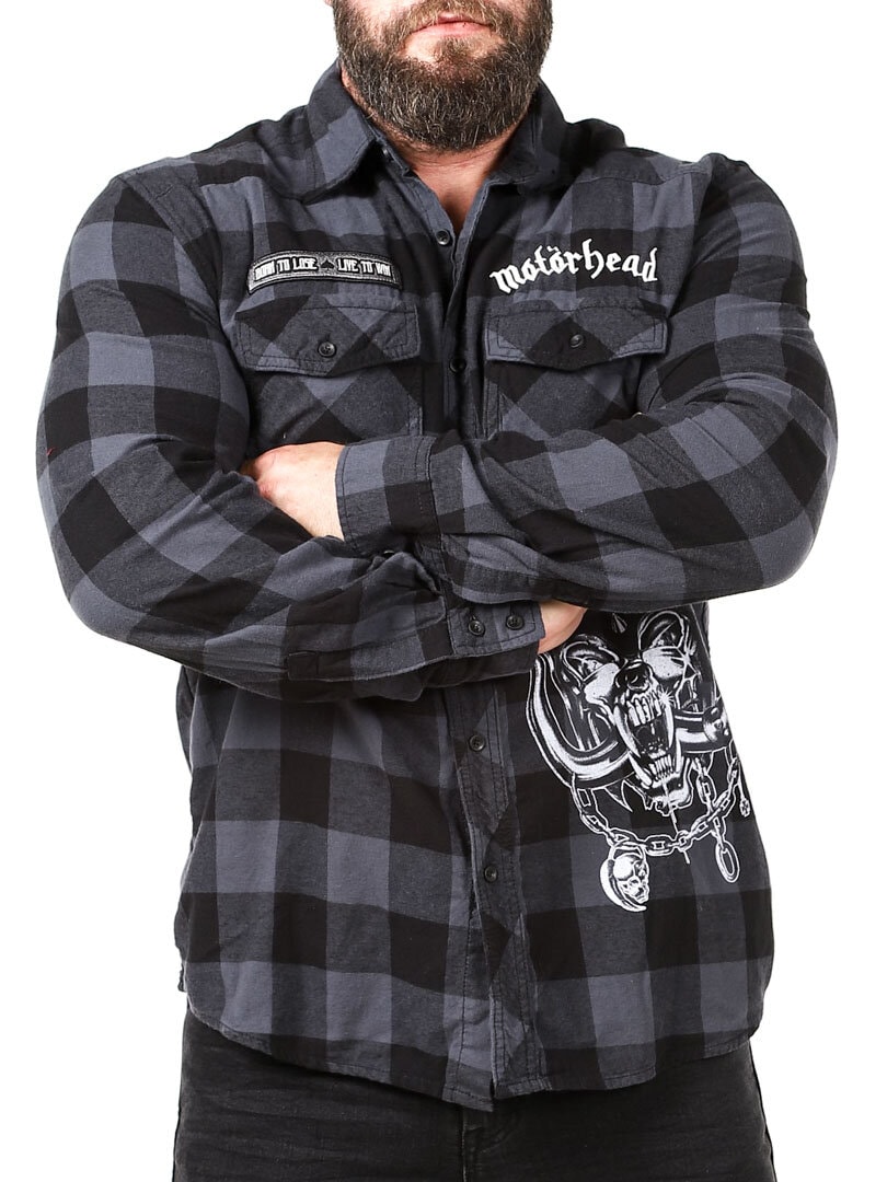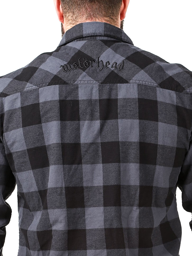 A dark shirt made from soft, checked fabric. It features a collar, two chest pockets, and a rounded hem. Designed with Motörhead detailing.