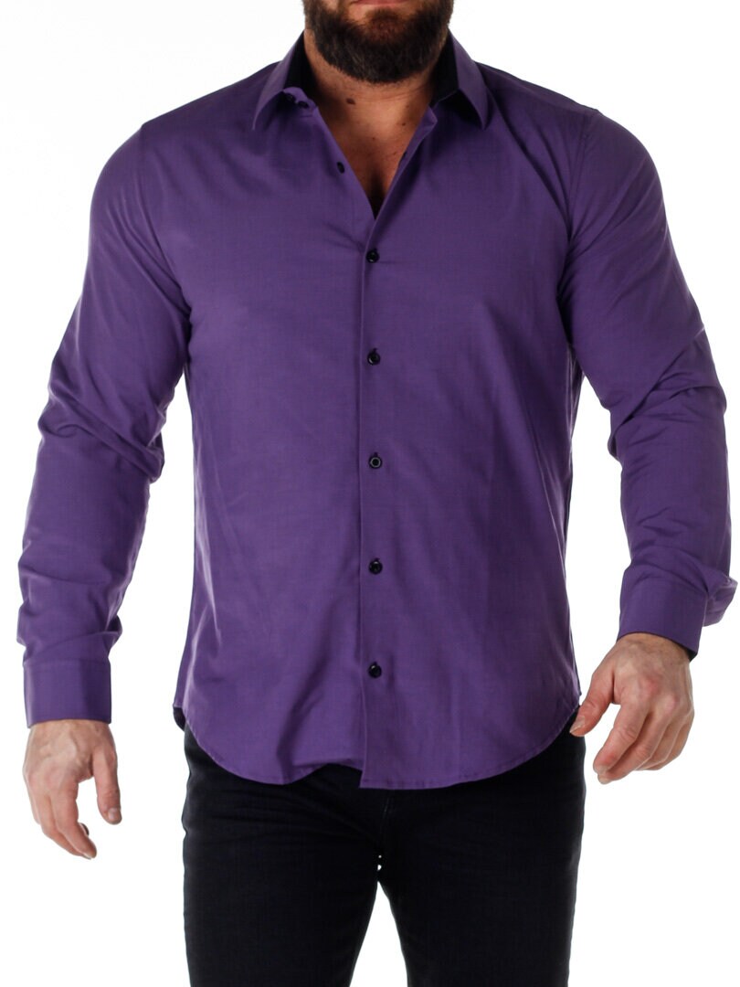 Cotton shirt in a comfortable, slightly stretchy model. Purple base with buttons, contrast color on the inside of the collar and cuffs. Slim fit with a rounded hem and a reinforced collar that retains its shape. Available in more colors!